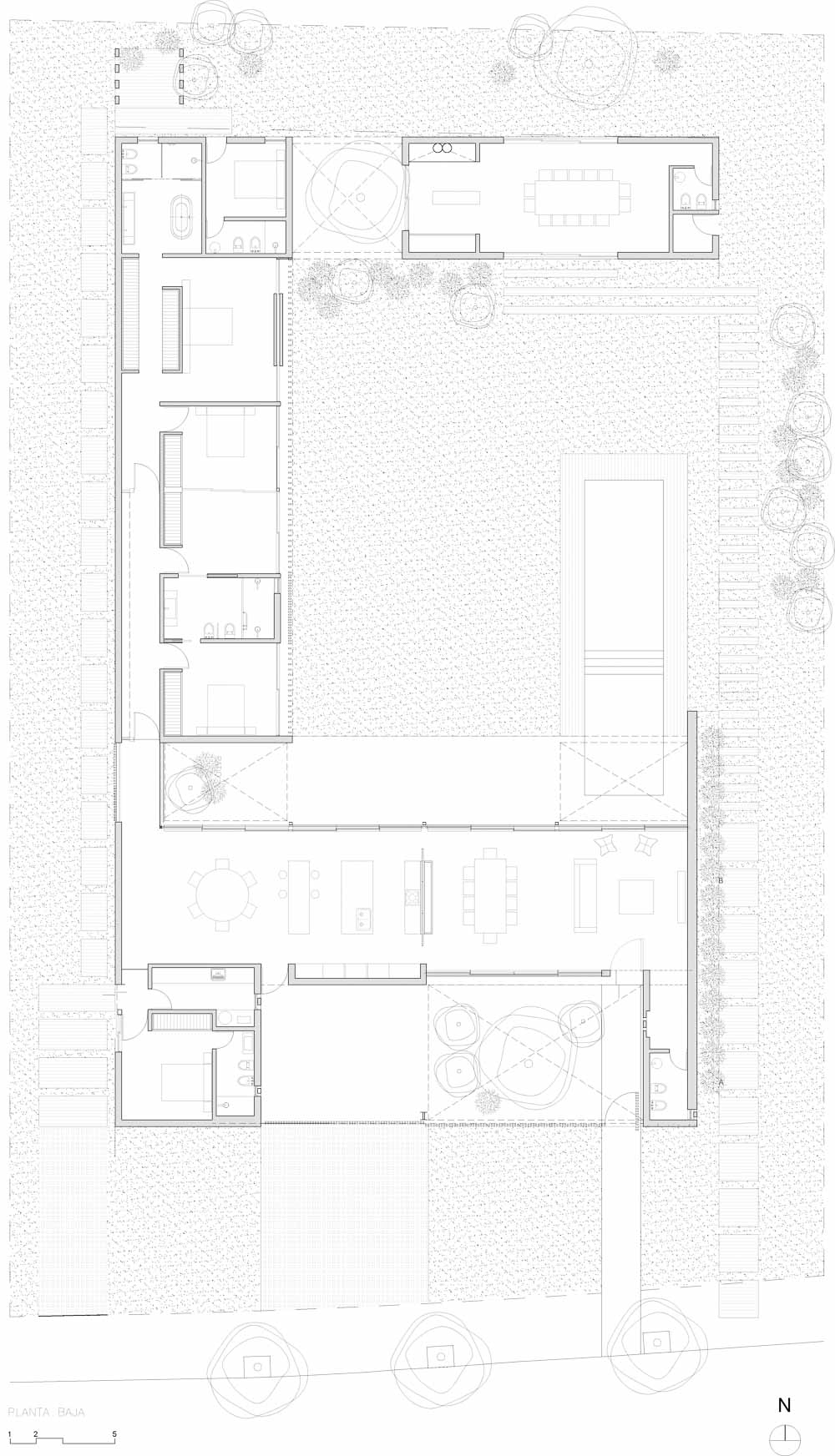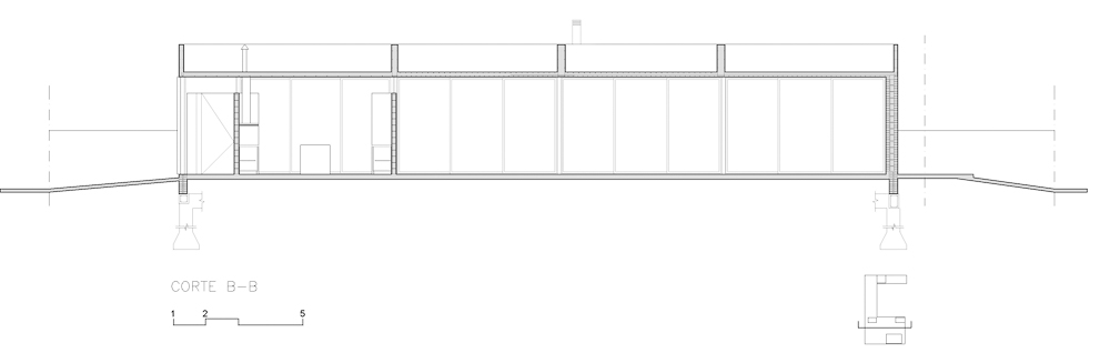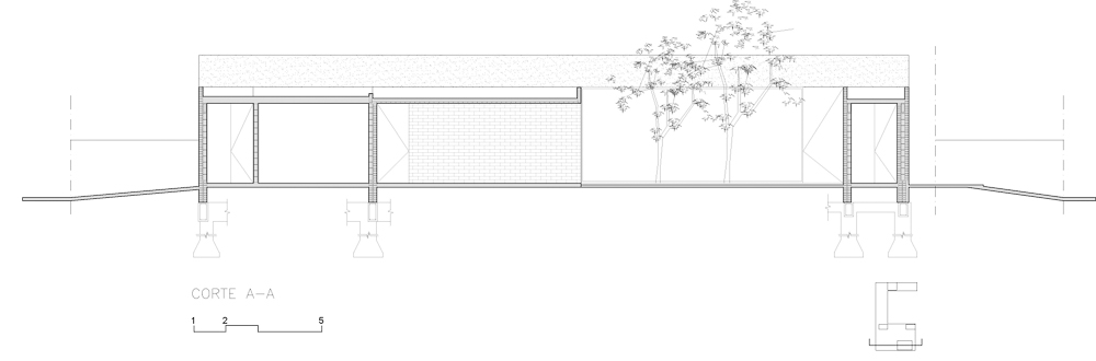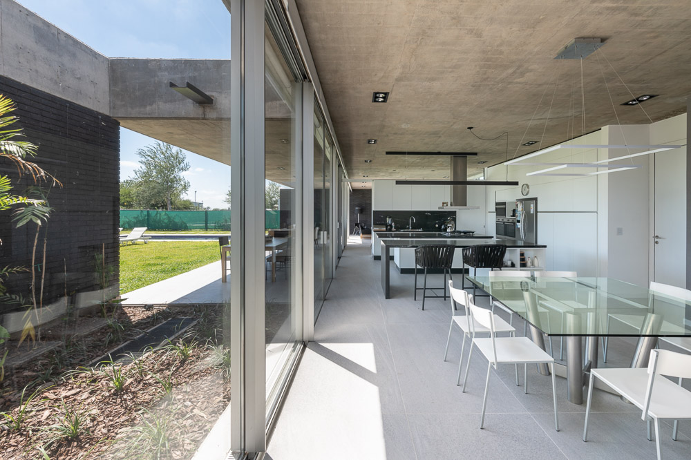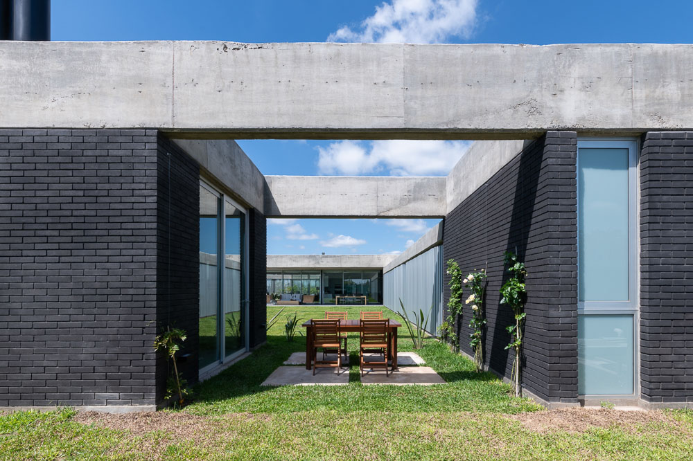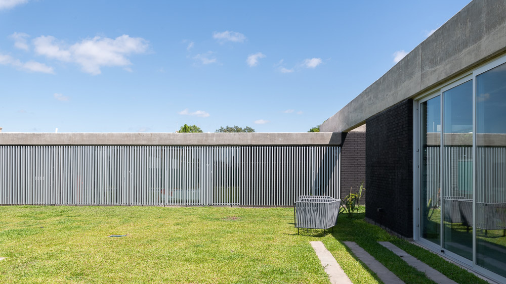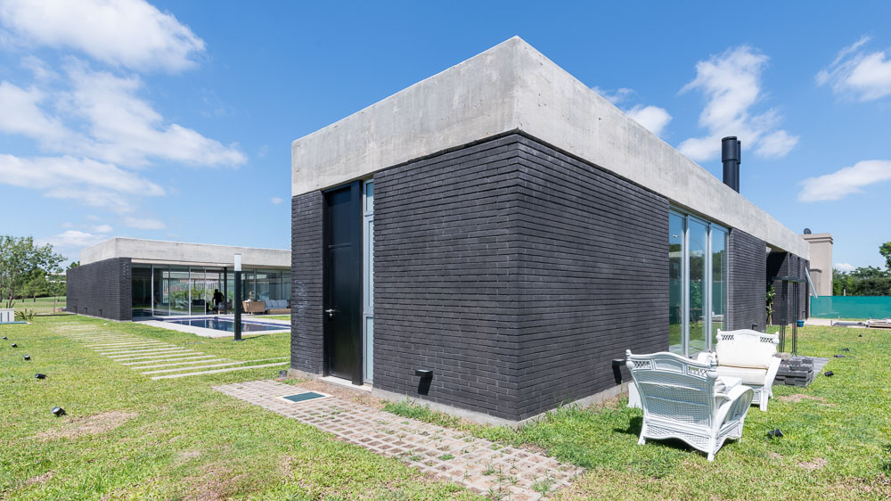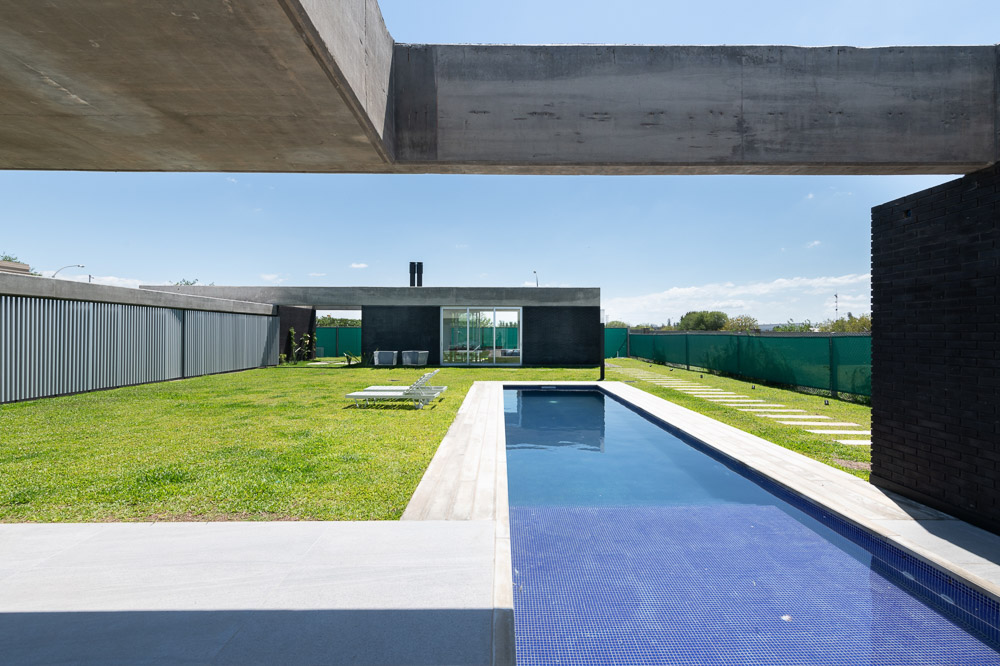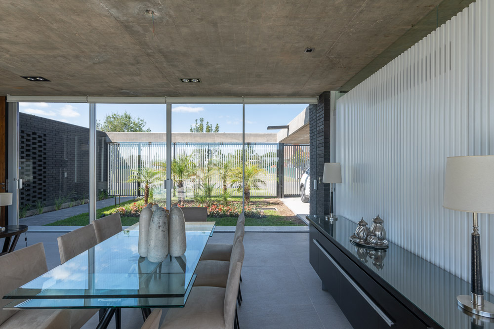 The house is set in a neighborhood located in the outskirts of the city. The program of the house is extremely interesting based on the family relationships and the characteristics of each family member. It is proposed in a plot with a north orientation for the back of it, being this a happy coincidence between orientation and the search for privacy over the street. It is designed in a U-shaped plant opened to the east, where the orientations start to define the project. The plan is defined trying that the habitable areas were surrounded by vegetation, impregnated by aromatic plants that provide a spacious area to the perception of he occupants, while the nighttime areas occupy a lateral side of the house. Kitchen and living room are separated and they keep a similar proportion, related with the relationships that suggest their inhabitants. The entrance is proposed through a patio that assures a double relation with the green in the interiors. The house can be manifested open or closed in its interior because of the presence of a mobile double filter of solar shading built with aluminum panels. Over the facade, this filter works as a closing structure and as a closure to the street, reinforcing the relation with the interior patio. The house is built with a structure composed of exposed concrete slabs supported by structural masonry and a double wall of black bricks, generating a new chromatic perception in both the interior and exterior. The roofs are plain, being composed of different heights by the fitting of the different beams, built in exposed concrete. The U-shaped patio is closed with a social and barbecue area, with an independent entrance. The house attempts to get away from the aesthetics of this type of neighborhoods based on its scale and its image, in a search for a synthesis of its morphologic and chromatic expression.