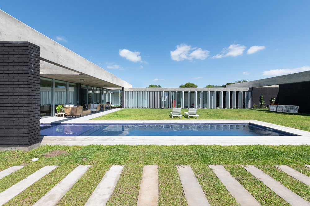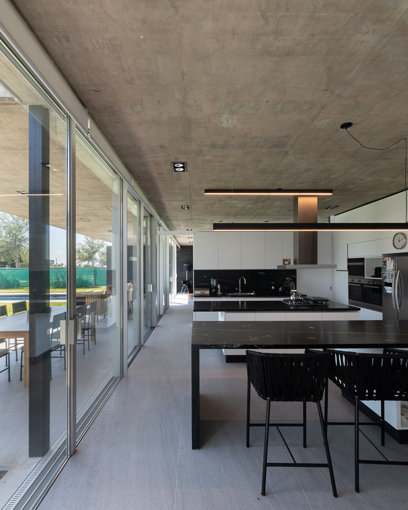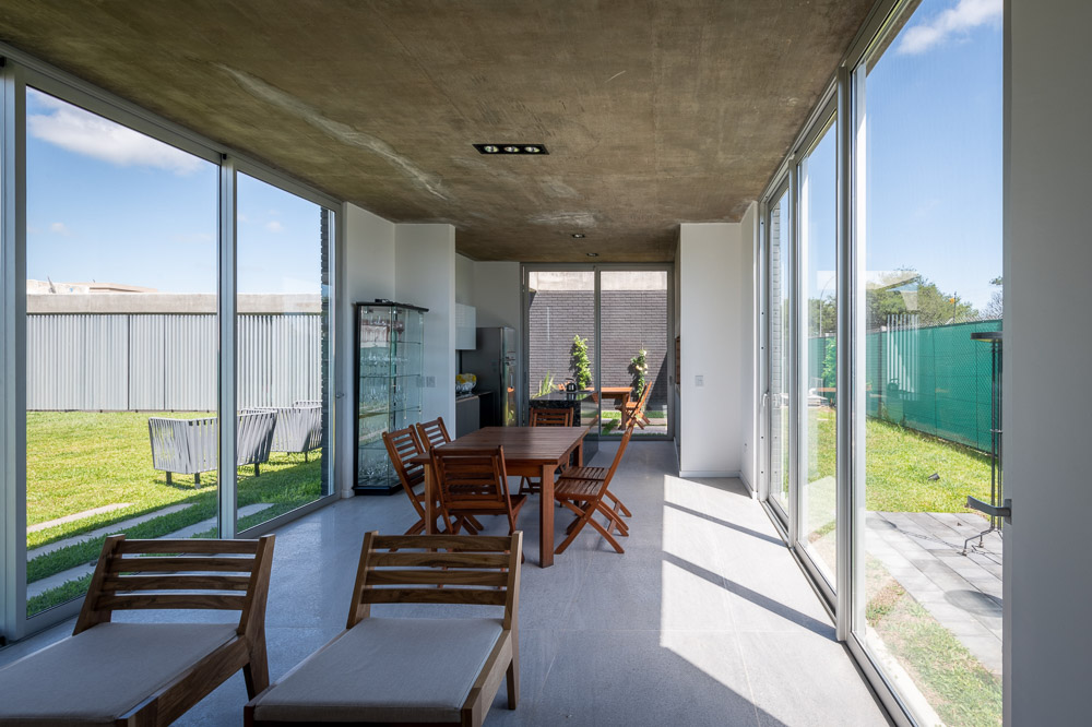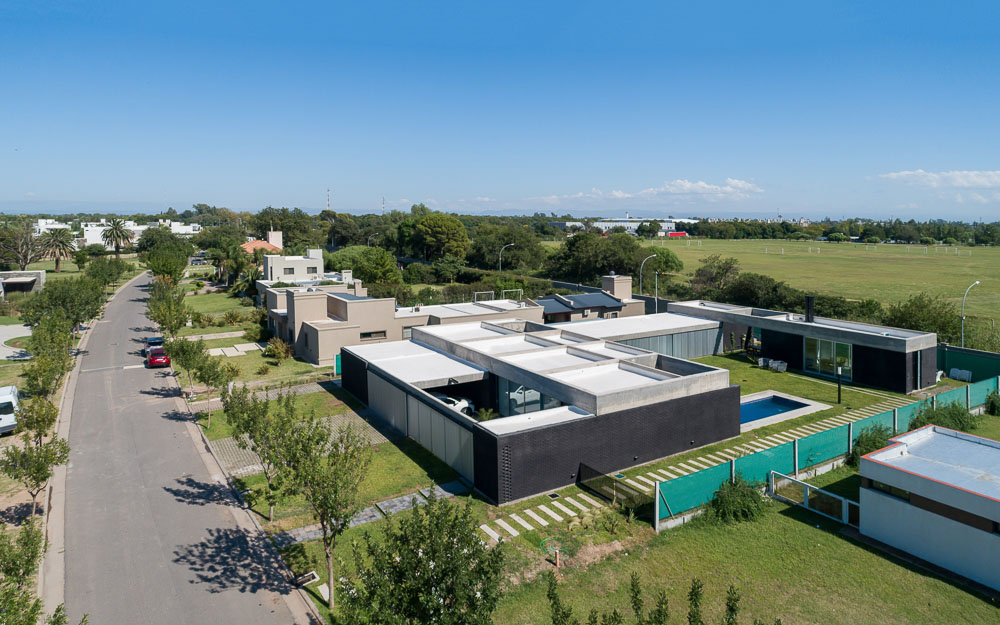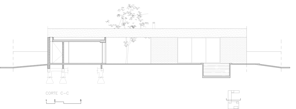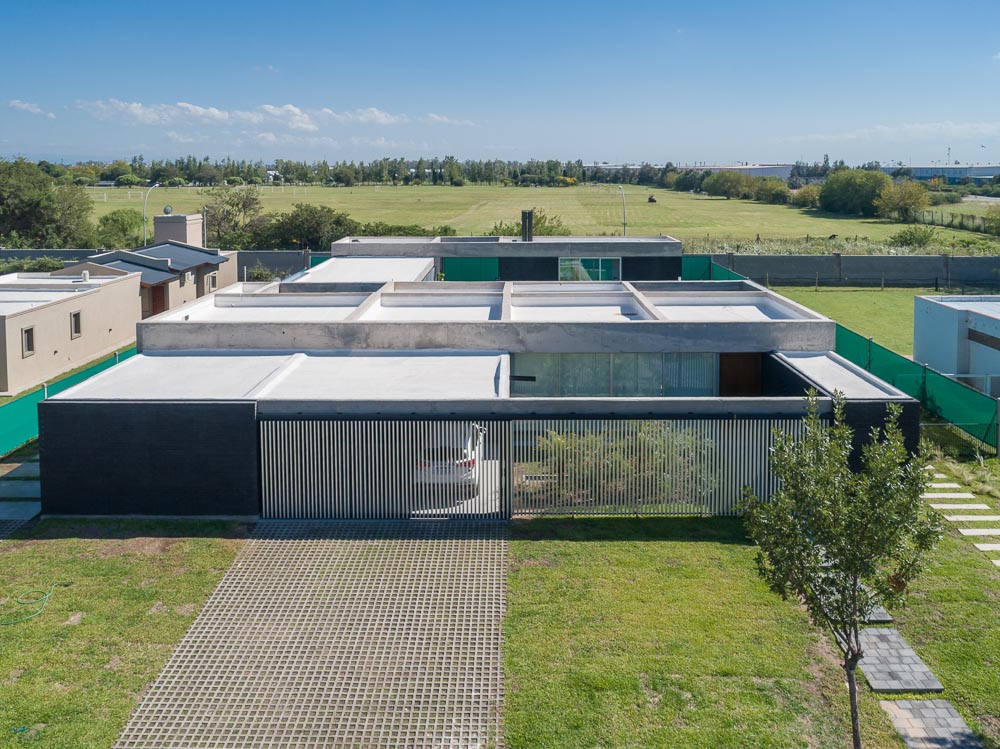 The house is set in a neighborhood located in the outskirts of the city. The program of the house is extremely interesting based on the family relationships and the characteristics of each family member. It is proposed in a plot with a north orientation for the back of it, being this a happy coincidence between orientation and the search for privacy over the street. It is designed in a U-shaped plant opened to the east, where the orientations start to define the project. The plan is defined trying that the habitable areas were surrounded by vegetation, impregnated by aromatic plants that provide a spacious area to the perception of he occupants, while the nighttime areas occupy a lateral side of the house. Kitchen and living room are separated and they keep a similar proportion, related with the relationships that suggest their inhabitants. The entrance is proposed through a patio that assures a double relation with the green in the interiors. The house can be manifested open or closed in its interior because of the presence of a mobile double filter of solar shading built with aluminum panels. Over the facade, this filter works as a closing structure and as a closure to the street, reinforcing the relation with the interior patio. The house is built with a structure composed of exposed concrete slabs supported by structural masonry and a double wall of black bricks, generating a new chromatic perception in both the interior and exterior. The roofs are plain, being composed of different heights by the fitting of the different beams, built in exposed concrete. The U-shaped patio is closed with a social and barbecue area, with an independent entrance. The house attempts to get away from the aesthetics of this type of neighborhoods based on its scale and its image, in a search for a synthesis of its morphologic and chromatic expression.
