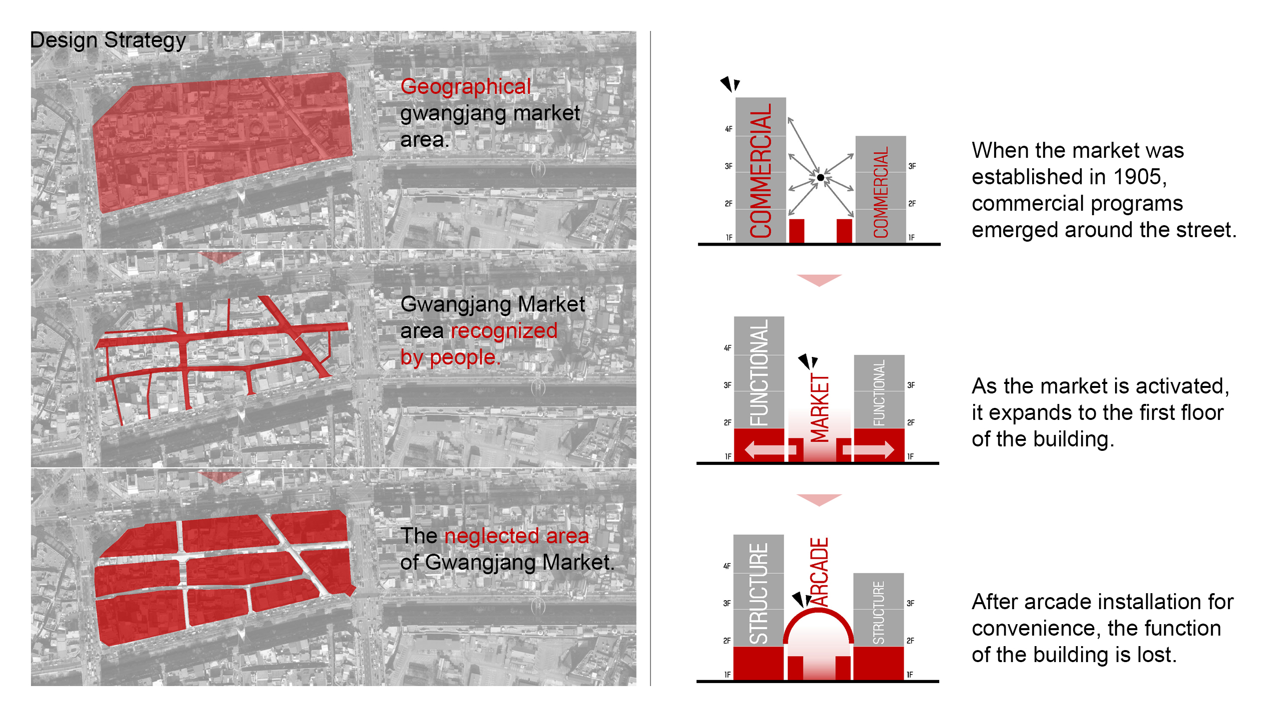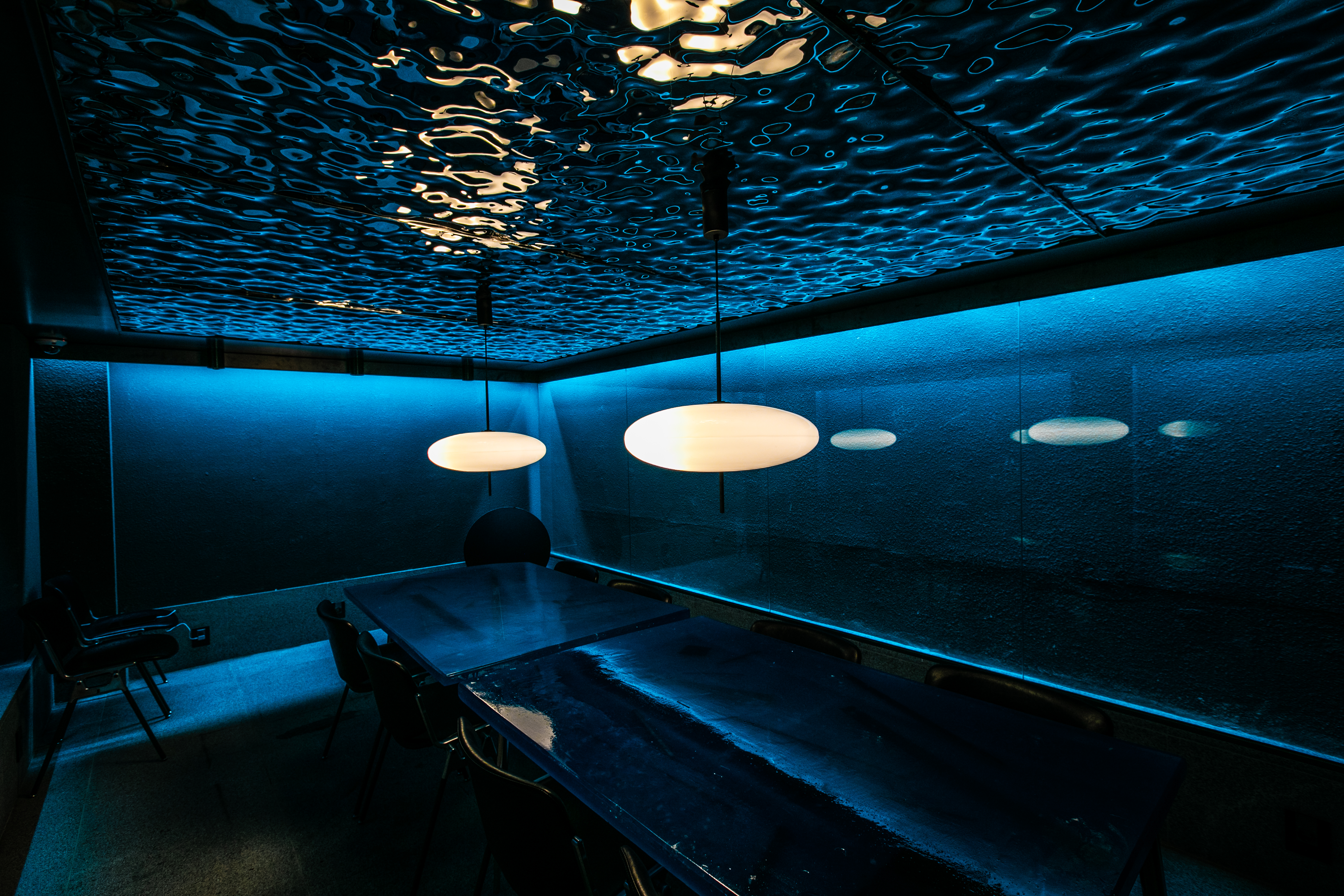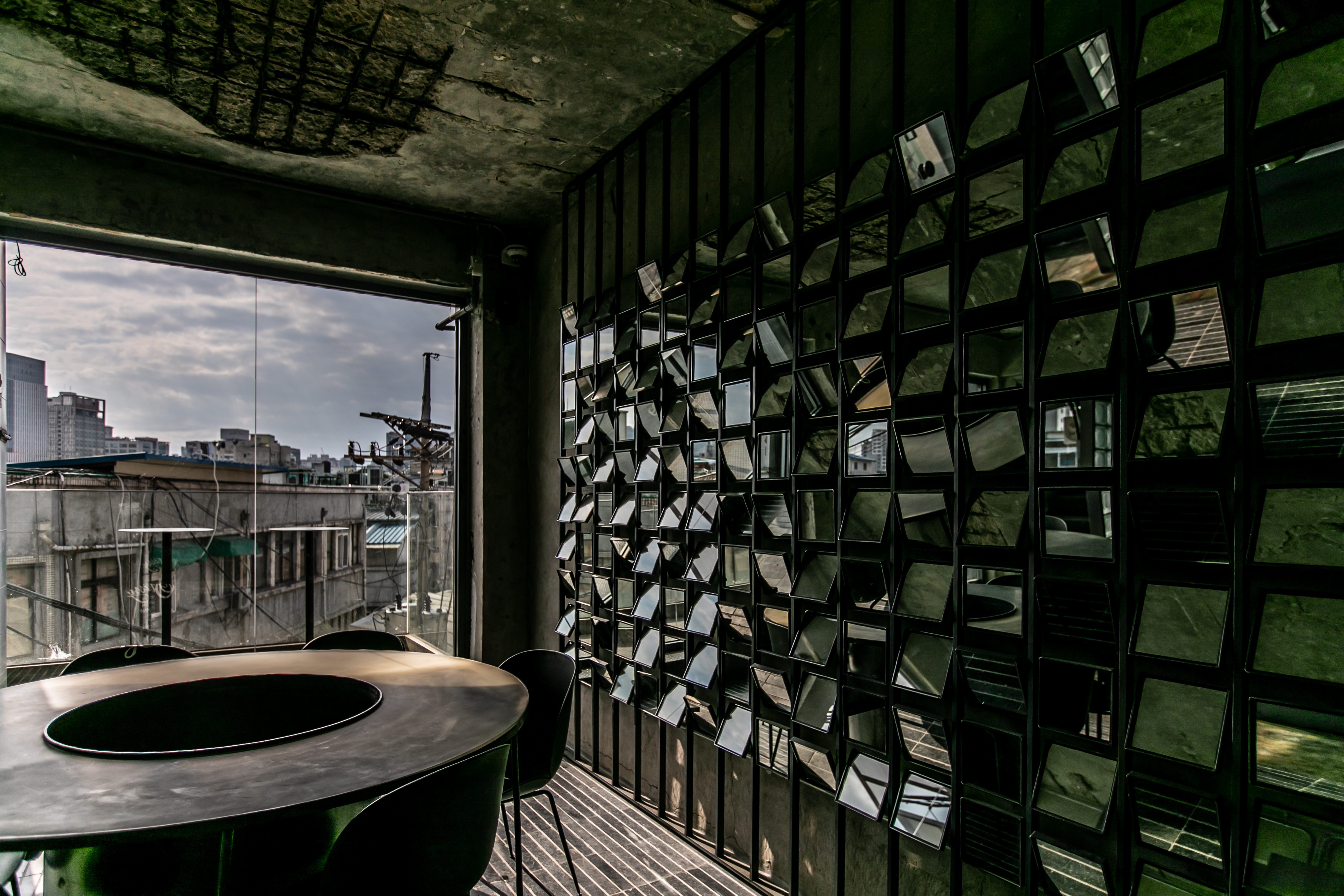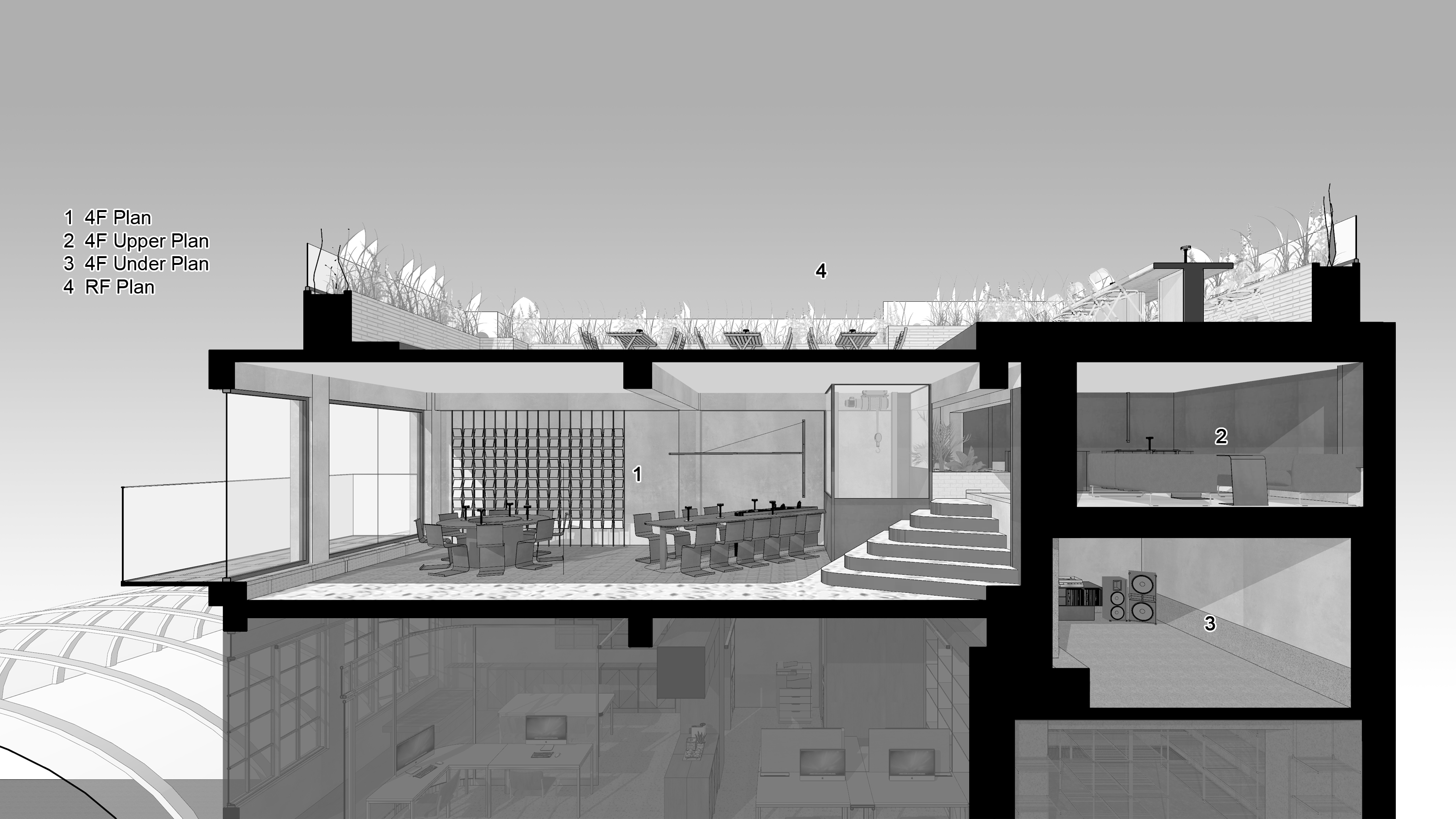 Located between several buildings built of plywood, the building has a skip floor-style structure due to different floor levels. As it is a space that is outside the market's eye level, the interior space is also hidden in various ways, giving meaning to each space with hidden zoning. If you compare the spaces in the lively Gwangjang Market to daily life, Hidden Hour, located on the fourth floor of the stairs, is a space where you can experience unusual life and hide away from your daily life for a while. The process of entering the space, the unusual view that you see as you enter, and the mood that matches it are focused on users who experience the space. The everyday sculptures shown in obliquely fixed mirrors mean the beginning of a transferred space, and the comfortable seats at a slightly higher level give you a viewing experience. The Hidden Room, which feels like it's underwater, offers a completely unusual experience and operates as the most private room. The rooftop, where you can see the view of Namsan Tower and Jongno/Eulji-ro, offers an experience of moving to another dimension, and you can see the unique alignment of Gwangjang Market that stretches like blood vessels.