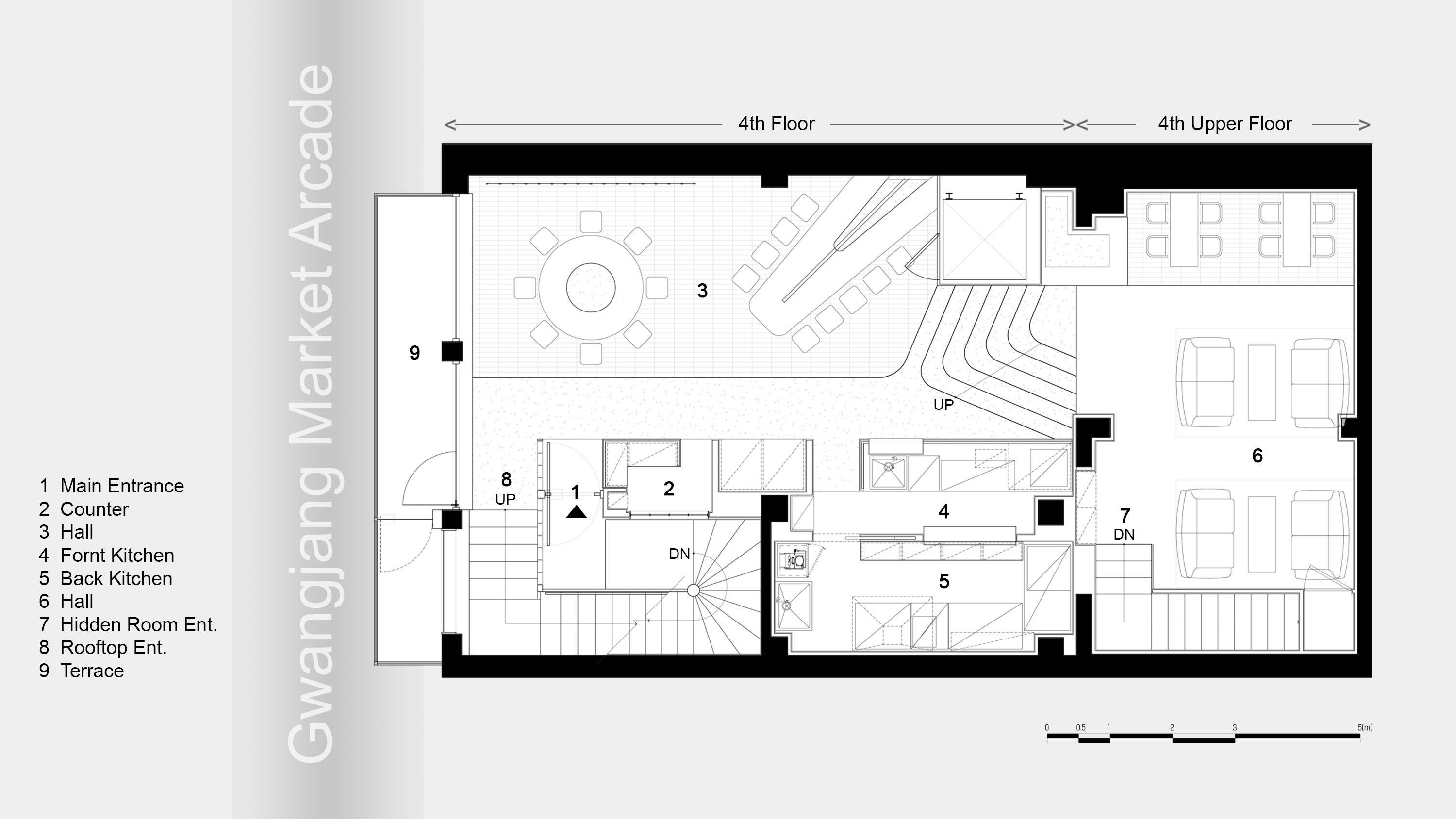 합벽으로 지어진 여러 건물들 사이에 위치한 해당 건축물은 서로 다른 바닥레벨로 인해 스킵플로어(skip floor) 형식의 구조를 가지고 있다. 시장의 눈높이에서 벗어나 있는 공간인 만큼 내부 공간 역시 다양하게 숨겨져(hidden) 있는 조닝으로 각각의 공간에 의미를 부여했다. 생기 넘치는 광장시장 속 공간들을 일상에 비유한다면 계단을 올라 4층에 위치한 히든아워(Hidden Hour)는 비일상을 경험할 수 있는 공간이며 잠시 일상에서 벗어나 숨겨질 수 있는 공간이다. 공간으로 들어서는 과정, 들어서면서 보이는 이색적인 뷰, 그와 어울리는 무드는 공간을 경험하는 사용자들에게 초점이 맞춰져 있다. 비스듬히 고정되어 있는 거울들에서 보여지는 일상의 조각들은 전이된 공간의 시작을 의미하며, 조금 높은 레벨의 편안한 좌석들은 관망할 수 있는 경험을 준다. 마치 수면 아래에 있는 듯한 히든룸(Hidden room)은 온전히 비일상을 경험할 수 있으며 가장 프라이빗한 룸으로 운영된다. 남산 타워와 종로/을지로의 도시 뷰를 볼 수 있는 루프탑은 또 다른 차원으로 이동하는 듯한 경험을 주며 혈관처럼 뻗어 있는 이색적인 광장시장의 선형을 볼 수 있다.