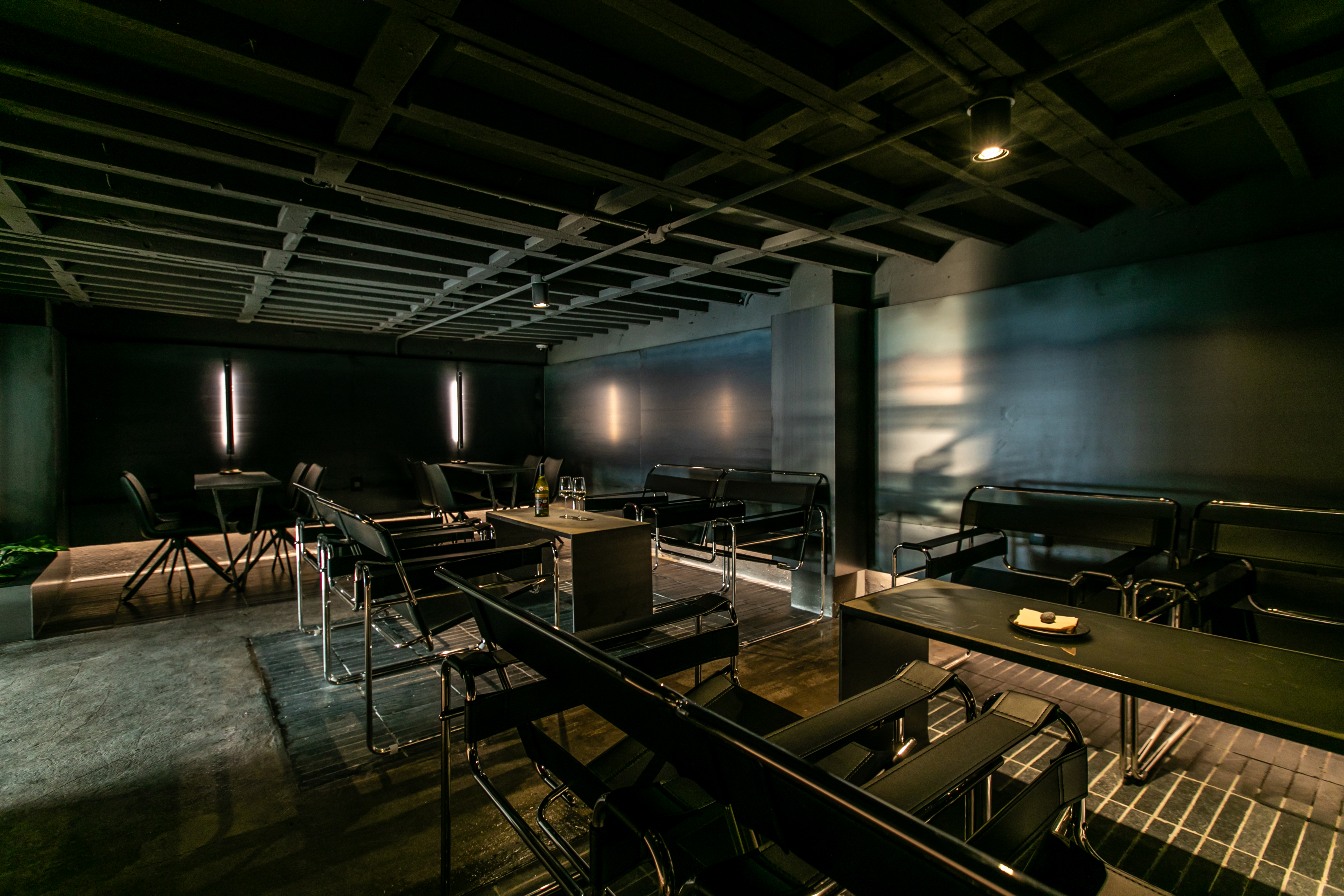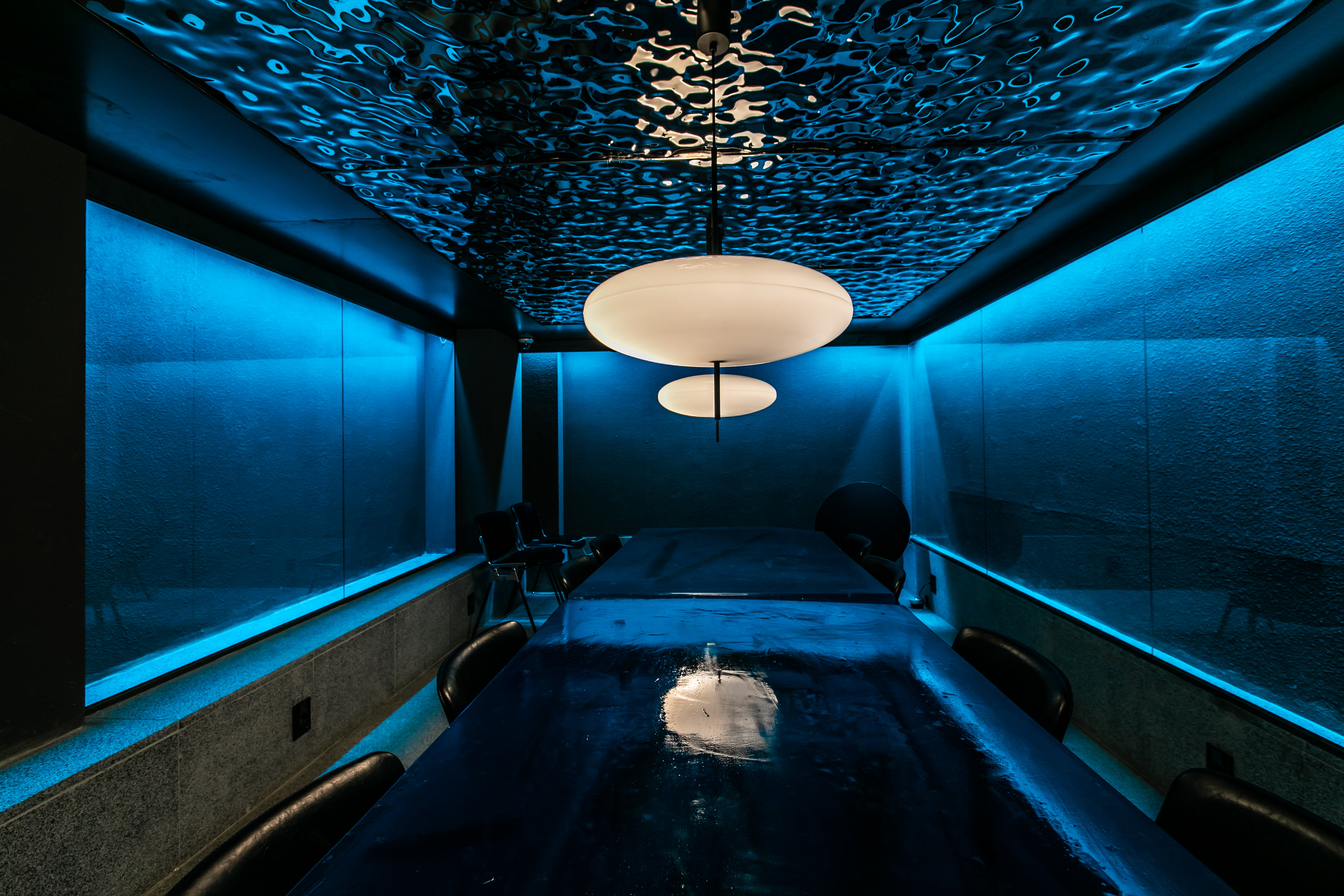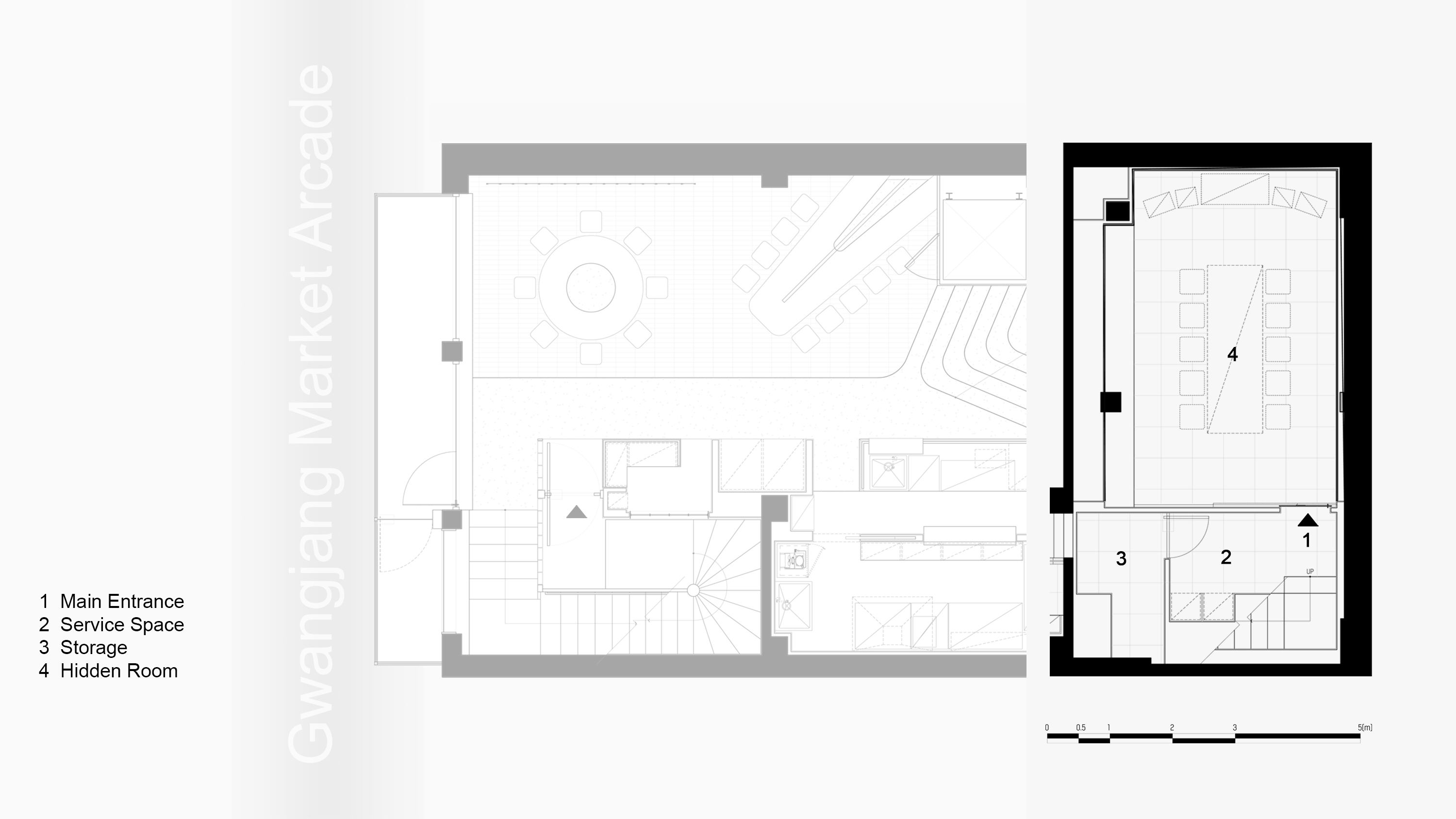 Located between several buildings built of plywood, the building has a skip floor-style structure due to different floor levels. As it is a space that is outside the market's eye level, the interior space is also hidden in various ways, giving meaning to each space with hidden zoning. If you compare the spaces in the lively Gwangjang Market to daily life, Hidden Hour, located on the fourth floor of the stairs, is a space where you can experience unusual life and hide away from your daily life for a while. The process of entering the space, the unusual view that you see as you enter, and the mood that matches it are focused on users who experience the space. The everyday sculptures shown in obliquely fixed mirrors mean the beginning of a transferred space, and the comfortable seats at a slightly higher level give you a viewing experience. The Hidden Room, which feels like it's underwater, offers a completely unusual experience and operates as the most private room. The rooftop, where you can see the view of Namsan Tower and Jongno/Eulji-ro, offers an experience of moving to another dimension, and you can see the unique alignment of Gwangjang Market that stretches like blood vessels.