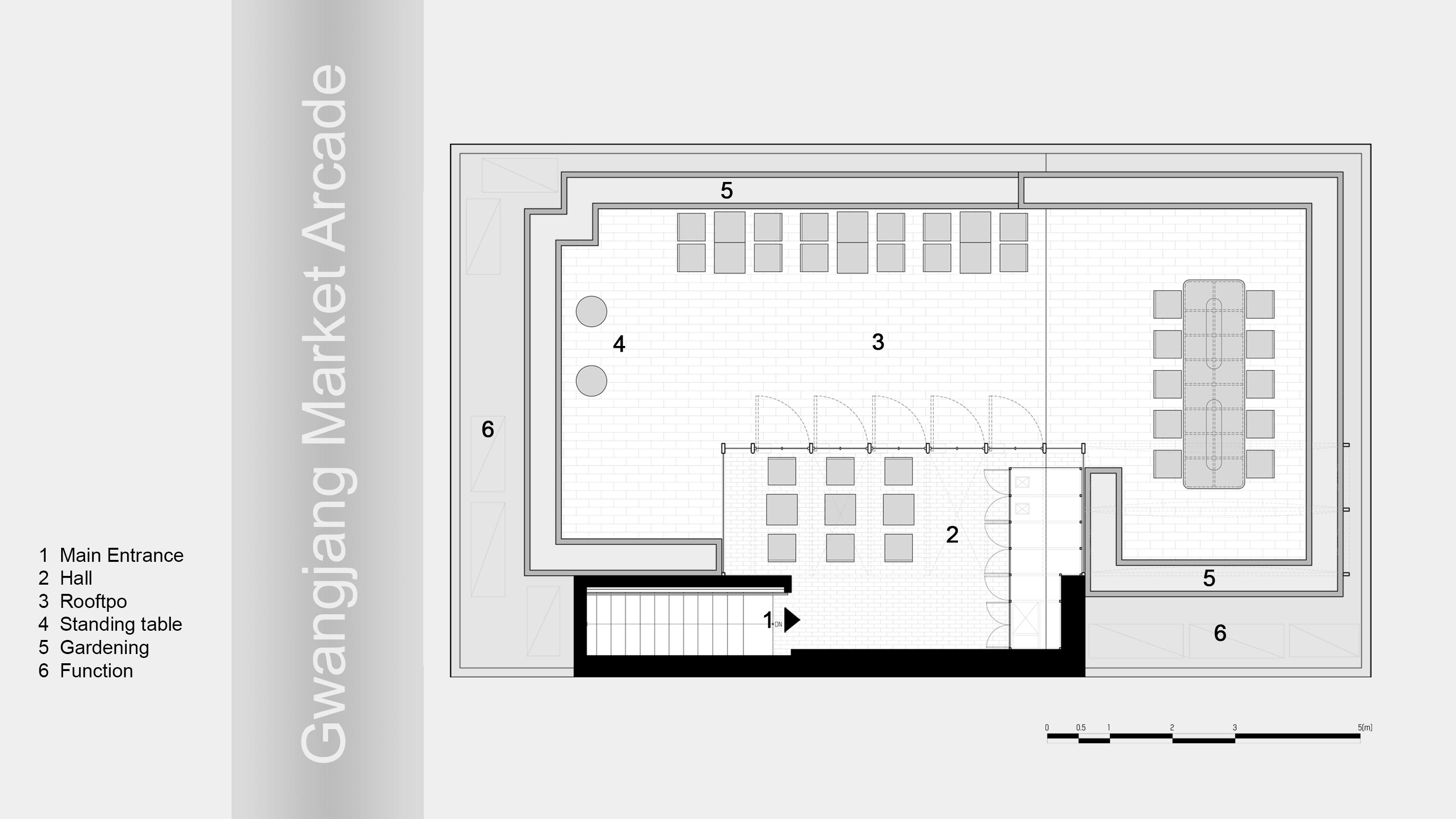 합벽으로 지어진 여러 건물들 사이에 위치한 해당 건축물은 서로 다른 바닥레벨로 인해 스킵플로어(skip floor) 형식의 구조를 가지고 있다. 시장의 눈높이에서 벗어나 있는 공간인 만큼 내부 공간 역시 다양하게 숨겨져(hidden) 있는 조닝으로 각각의 공간에 의미를 부여했다. 생기 넘치는 광장시장 속 공간들을 일상에 비유한다면 계단을 올라 4층에 위치한 히든아워(Hidden Hour)는 비일상을 경험할 수 있는 공간이며 잠시 일상에서 벗어나 숨겨질 수 있는 공간이다. 공간으로 들어서는 과정, 들어서면서 보이는 이색적인 뷰, 그와 어울리는 무드는 공간을 경험하는 사용자들에게 초점이 맞춰져 있다. 비스듬히 고정되어 있는 거울들에서 보여지는 일상의 조각들은 전이된 공간의 시작을 의미하며, 조금 높은 레벨의 편안한 좌석들은 관망할 수 있는 경험을 준다. 마치 수면 아래에 있는 듯한 히든룸(Hidden room)은 온전히 비일상을 경험할 수 있으며 가장 프라이빗한 룸으로 운영된다. 남산 타워와 종로/을지로의 도시 뷰를 볼 수 있는 루프탑은 또 다른 차원으로 이동하는 듯한 경험을 주며 혈관처럼 뻗어 있는 이색적인 광장시장의 선형을 볼 수 있다.