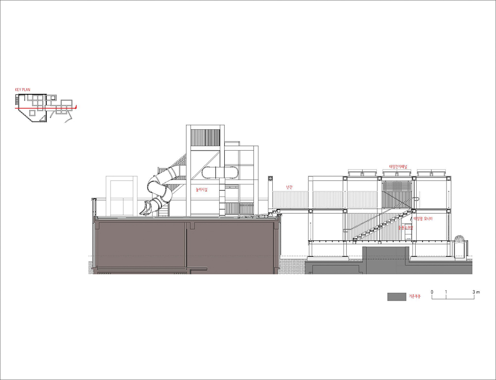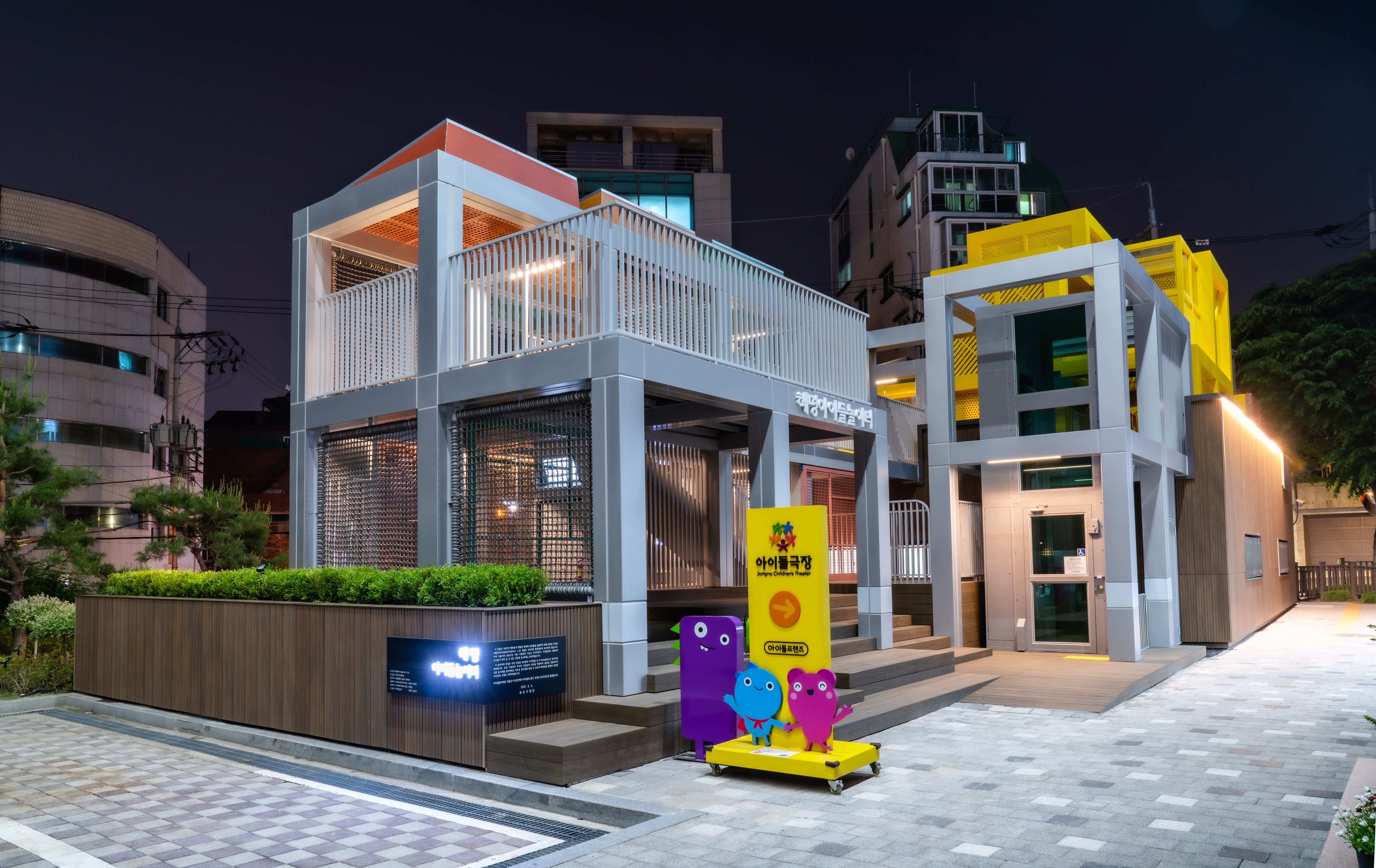 This environmental improvement project improves the structure, insulation, confidentiality, and appearance of the waterworks located on the second floor while maintaining the function of the existing pressurization plant. The old urban infrastructure in the past will create a “waterworks office,” a pleasant workplace for workers, and remodel it with a “pressing ground” that can provide cleaner water to residents. By connecting the roof of the pressurized field and the upper part of the parking lot entrance, an alley observatory and a children’s union playground were planned to transform the pressurized field into a space for children. Places that have not changed for 50 years have now become an environment where you can hear children’s voices and return home safely. The design motif of Hyemyeong Children’s Playground is a cube block that borrows a square from a window of nearby buildings, reconstructs the shape of the square, and reconstructs it in three dimensions. The playground is a “future guardian children’s play facility” that lights up dark alleys with electricity produced directly through the solar module (3.36kW). The space, which has been reborn as ‘Hyemyeong Children’s Playground’ is a monument symbolizing the Children’s Theater and a leading alleyway regeneration project to showcase the Green New Deal for the first time in Korea by Jongno-gu Office, a child-friendly city.