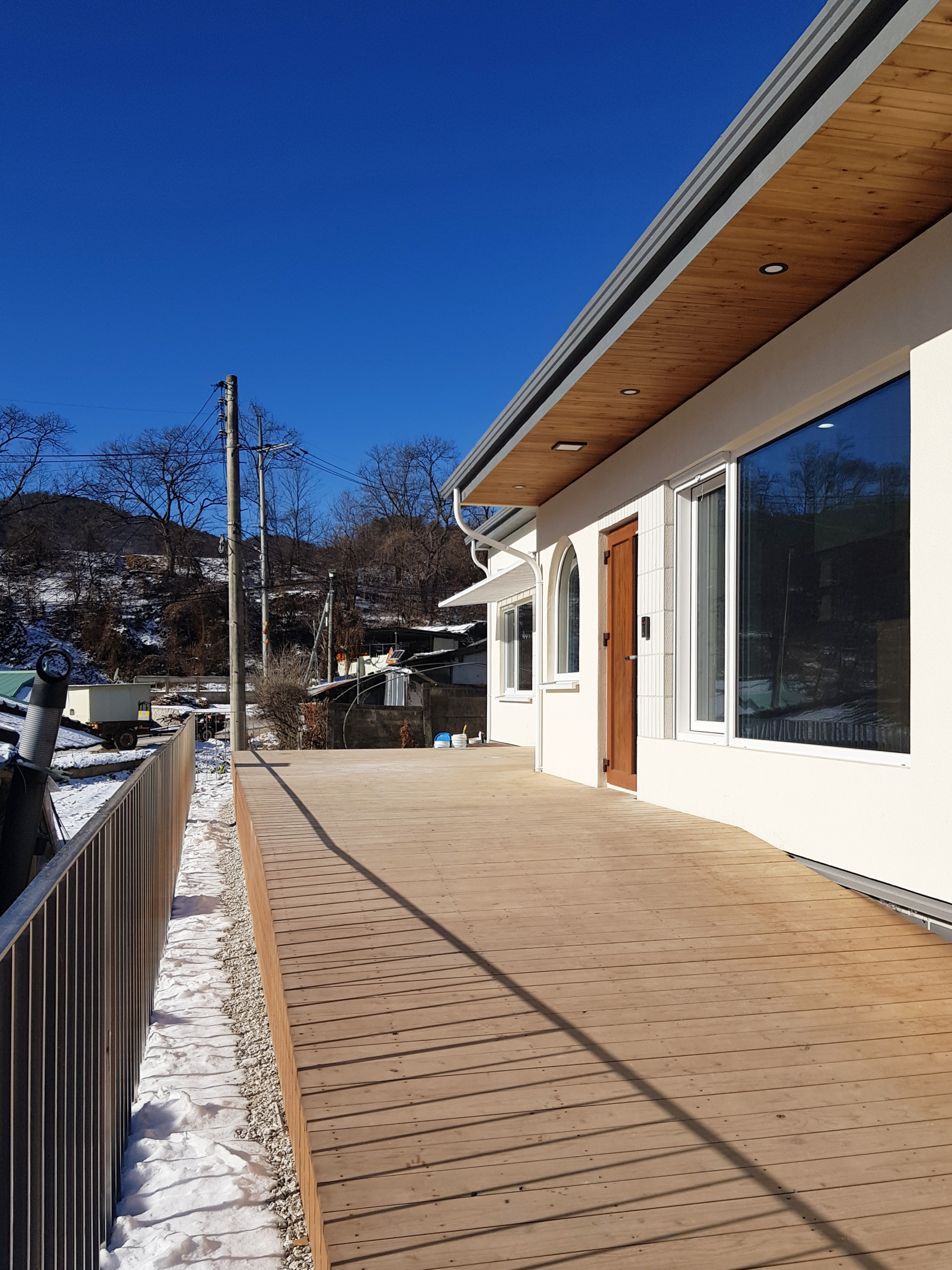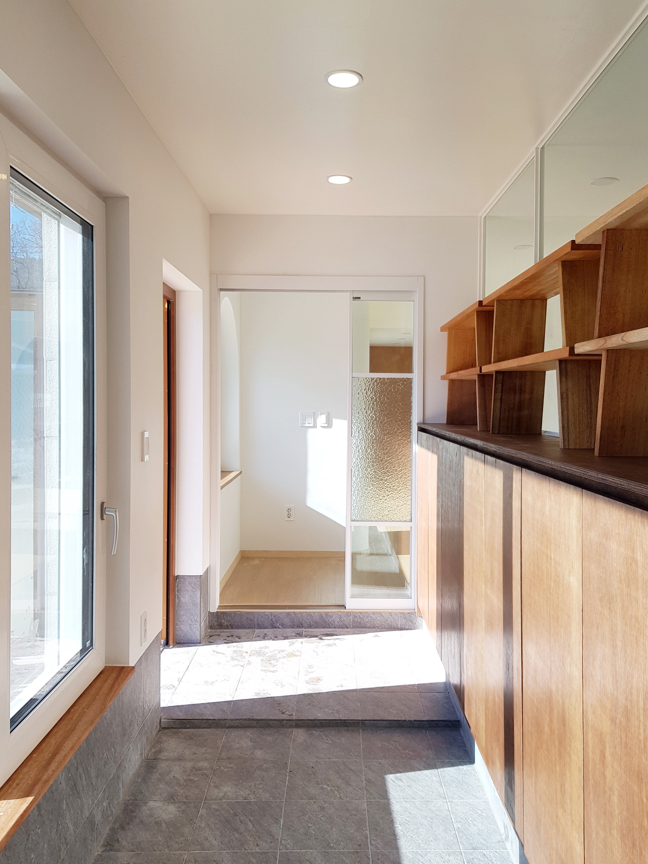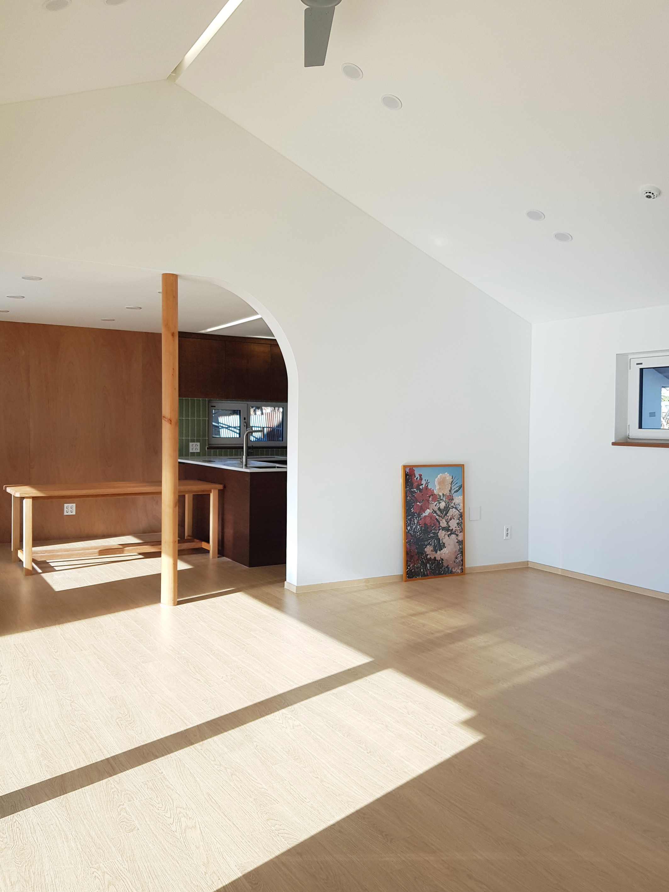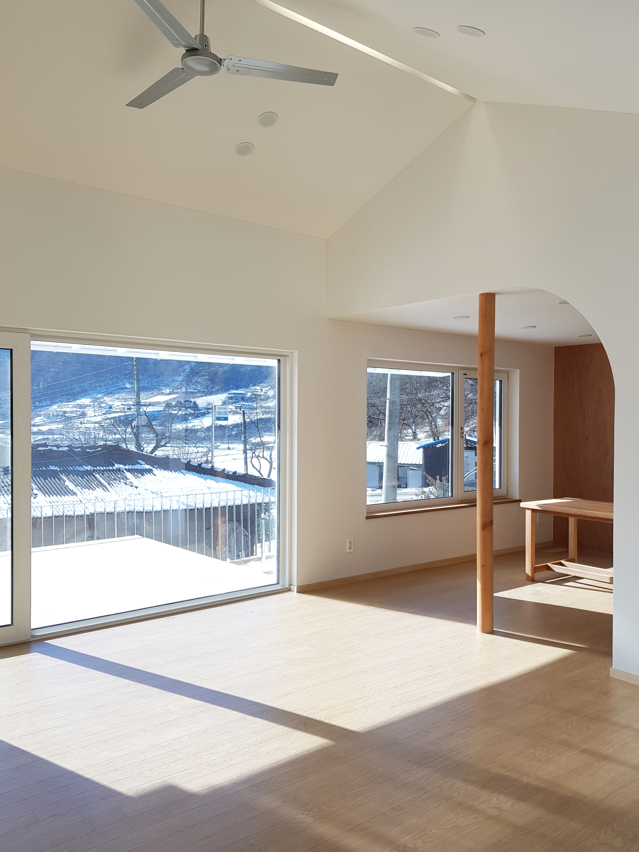 Located in Sineup-ri, Hwacheon, Gangwon-do, 'Gahwamansaseong' is located in a small village in the mountains of Gangwon-do. Old farmhouses have reached their limit of usefulness, and are being converted into new houses one by one. 'Gahwamansaseong is a project in which the owner decided to demolish the farmhouse where the previous owner lived, and build a new house on the land behind it. The design work began through a connected relationship, and it was intended to faithfully reflect the characteristics of rural life and family life. Rather than revealing it, the architect wanted to have an internal stability, and it would be a warm and healthy house that could withstand the harsh winter well. Rather than being greedy, the architect would like to build a house full of the fragrance of life in an appropriate way without overflowing. The land behind the existing farmhouse was on a slope that was being used as a field, so when an embankment was built and the site was cleared, the land was about 1.2m higher than the existing private house. Over the slate roof of the existing private house to be demolished, the spaces were arranged naturally in line with the sunny land with fields and mountains in the distance, and the building was planned with a simple and honest form as much as possible. The entry to the living room and the deck in front of the entrance was planned with a ramp instead of stairs, and the areas in which you spend a long time, such as the entrance, greenhouse, living room, dining room, and bedroom, were arranged so that sunlight and views from the south could be shared. In particular, the southern entrance from the deck was planned as a special welcoming space to this house, allowing it to function as a small greenhouse based on the desire of the owner who likes to grow flowers throughout the house. In addition, the living and dining areas, frequently visited by guests, and the children's rooms and master bedrooms are naturally divided. The entrance and the greenhouse become a single screen when viewed from the inside, distinguishing the nature of the space, and is designed so that whenever you pass through the hallway, you can feel the sunlight and see the panoramic view of the greenhouse and the plants in between. An attic space is provided for the grandchildren so that their daughter’s family can stay, and the interior of the single-story “Gahwa Mansaseong” house is built according to the nature of the space, making the most of the advantages of a single-story house, such as a spacious living room with a gabled ceiling, an attic space, and an integrated guest room. Also, it has different ceiling heights and ceiling shapes.