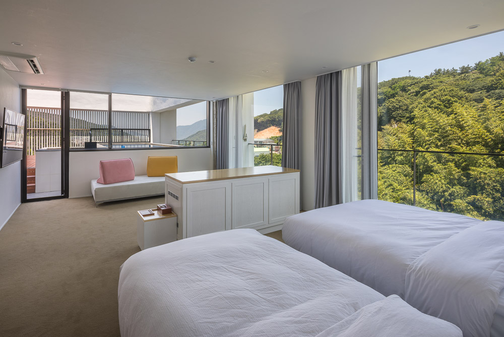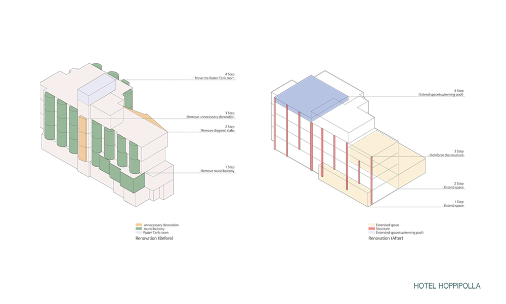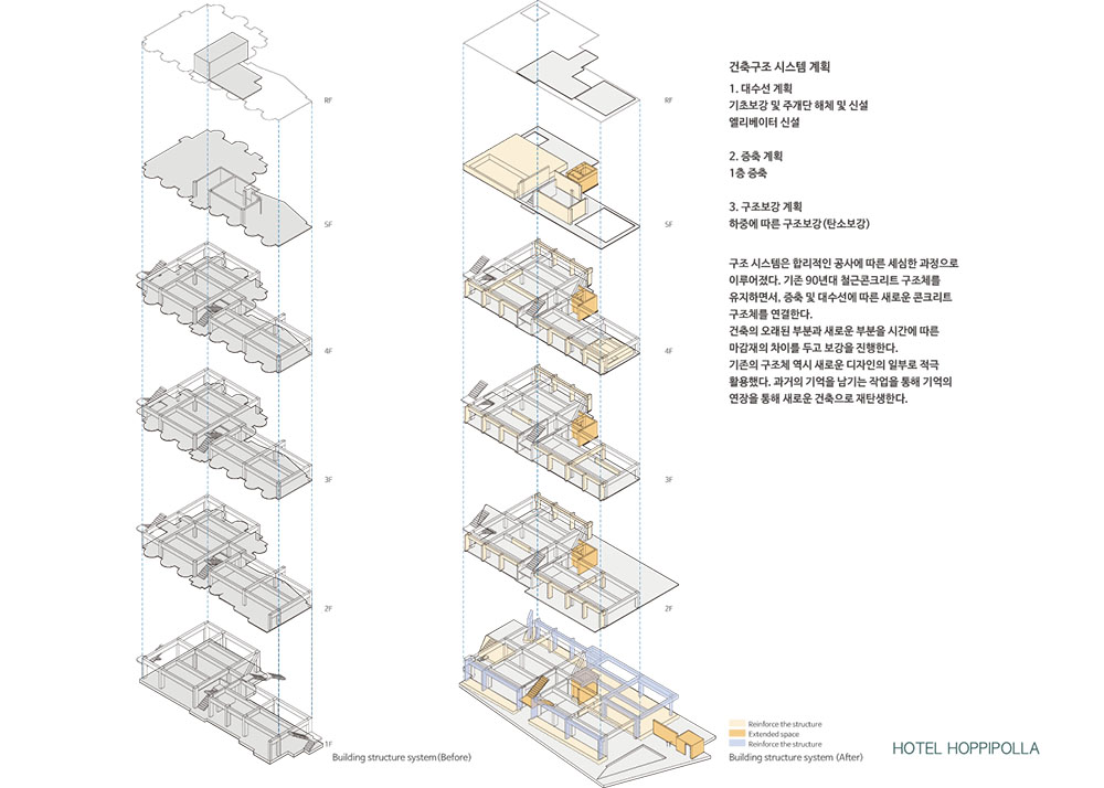 대상지는 계획관리지역으로 숙박시설 용도는 불가능한 지역이다. 기존 숙박시설(준농림지역) 용도를 유지하기 위해 지상 2층~5층은 대수선으로, 일반음식점 용도의 지상 1층은 증축으로 계획한다. 외부를 즐기기 위해 캠핑장, 수영장 및 부대시설을 새롭게 계획했고, 객실 수를 줄여 가족 중심의 숙박시설로 재구성했다.