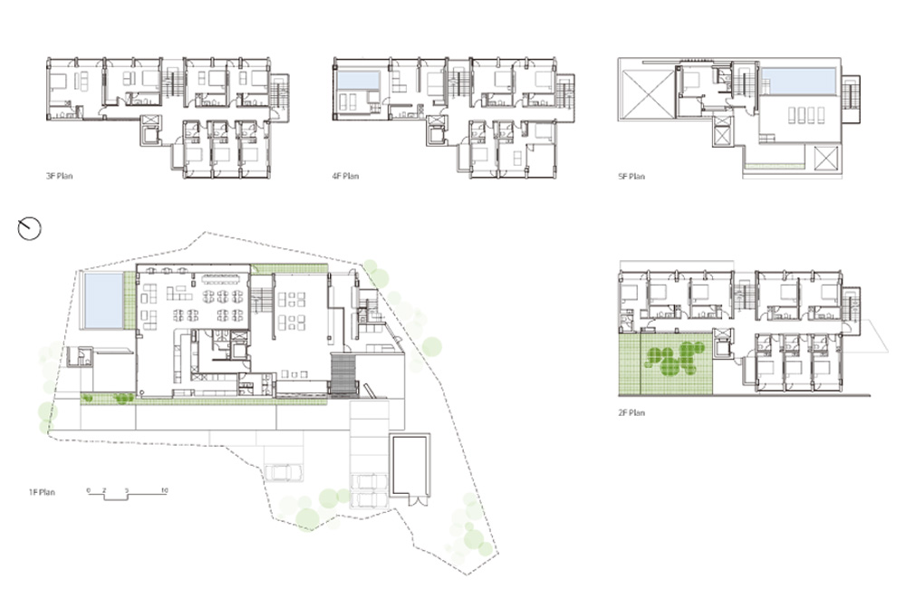 The site is a planned management area, and usage as accommodation facilities is out of the question. In order to maintain the use of the existing accommodation facilities (semi-agricultural land areas), the 2nd to 5th floors above the ground are planned to be repaired, and the 1st floor for general restaurant use is planned as an extension. In order to enjoy the outdoor space, the campground, swimming pool and other facilities were newly planned, and the number of rooms was reduced and reorganized into a family-oriented accommodation.