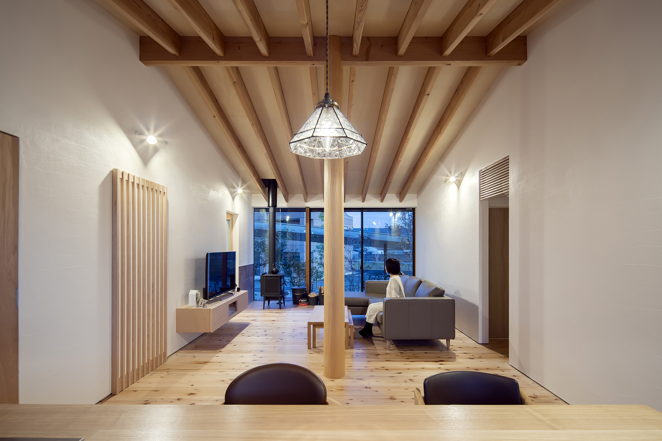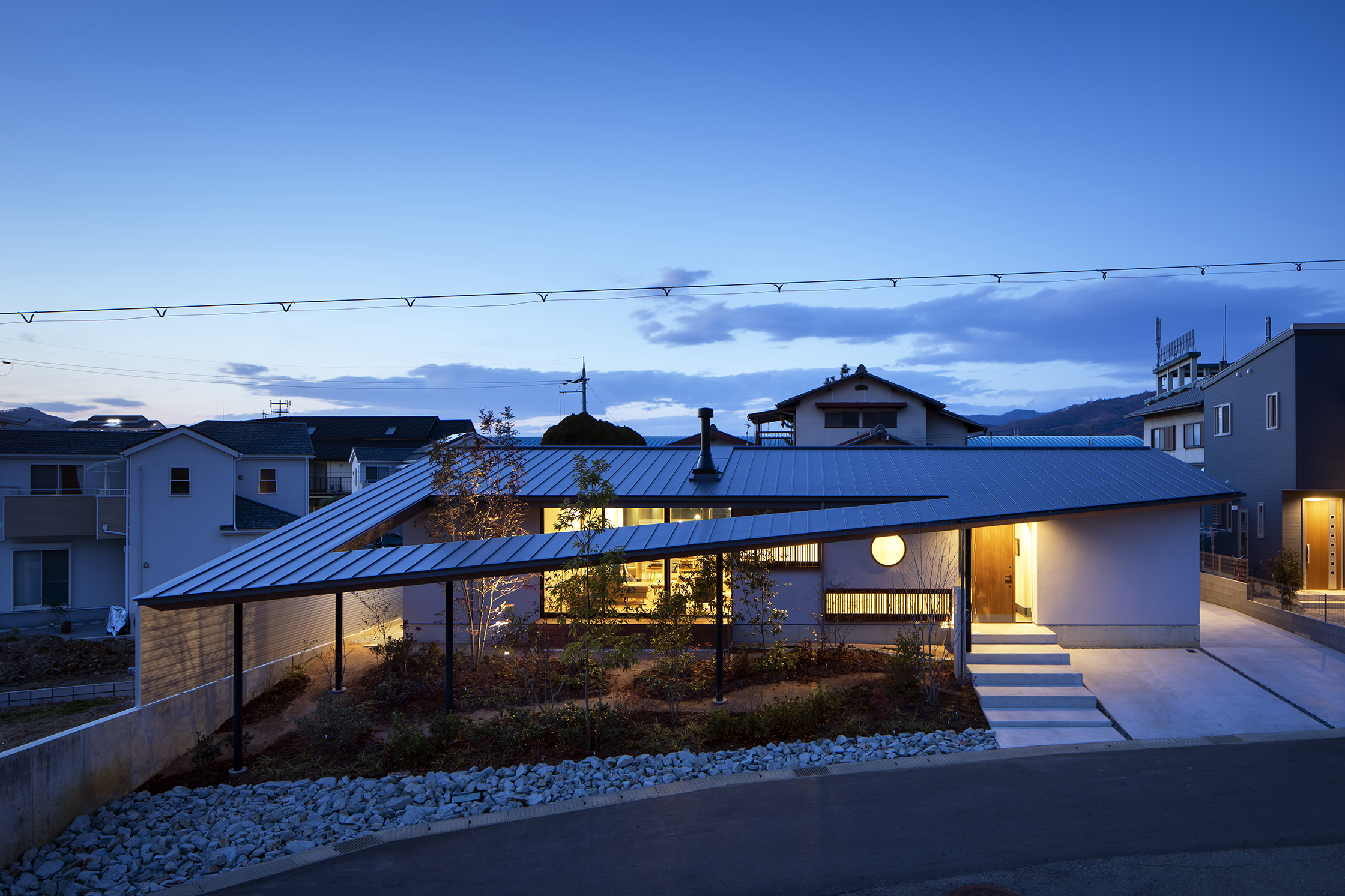 There is a maximum level difference of 1.4m between the site and the road. The plan is to make use of the level difference. The garden goes down a gentle slope towards the road. The roof stretches along the slope of the slope and goes down. The outside garden is surrounded by a perforated roof so that the garden is continuous with the room.