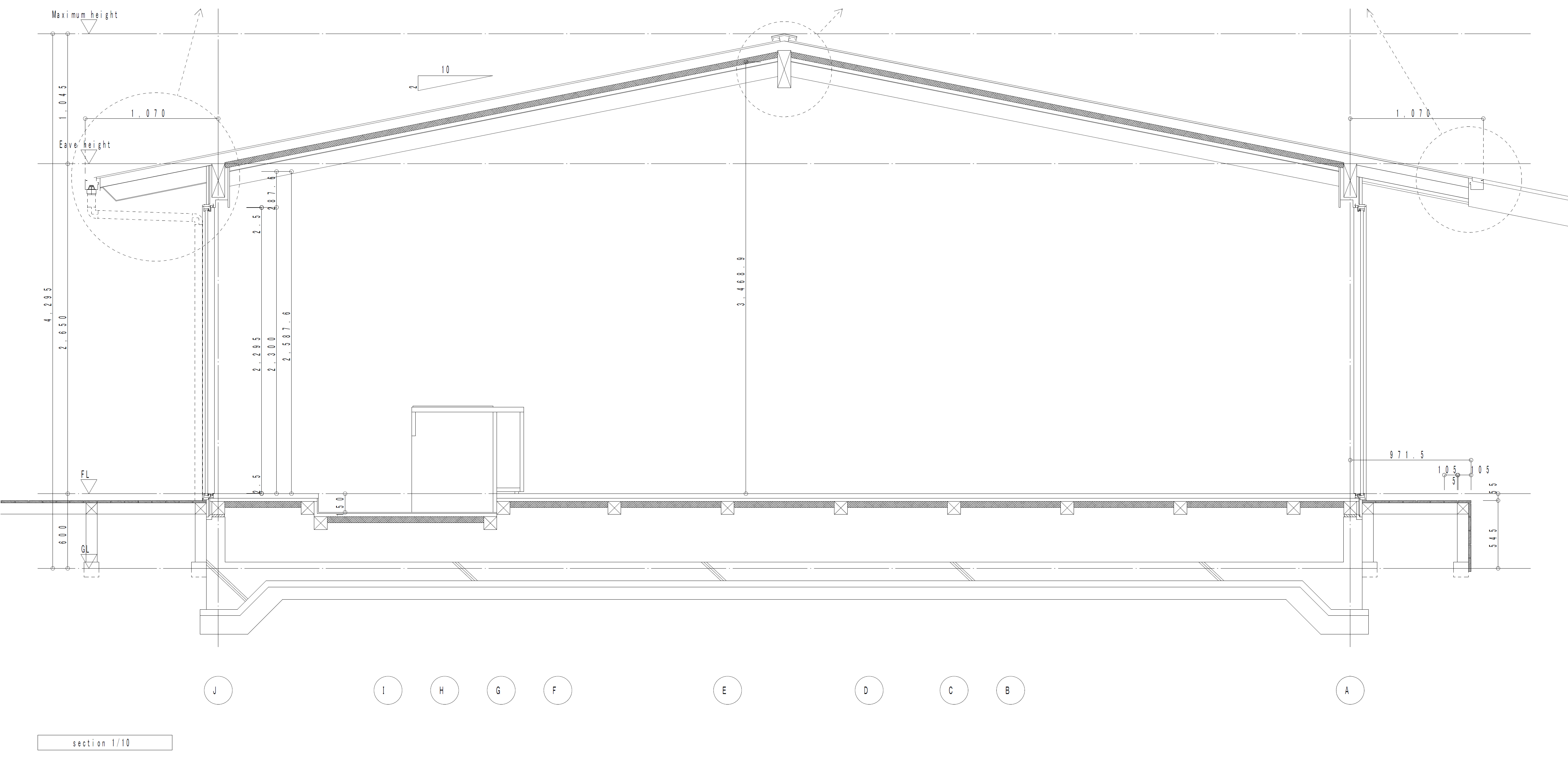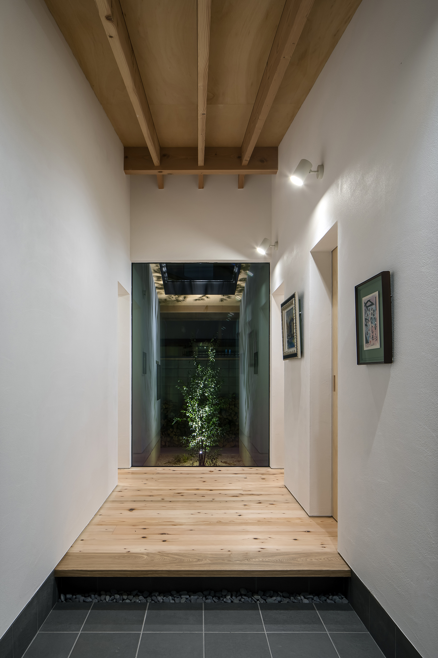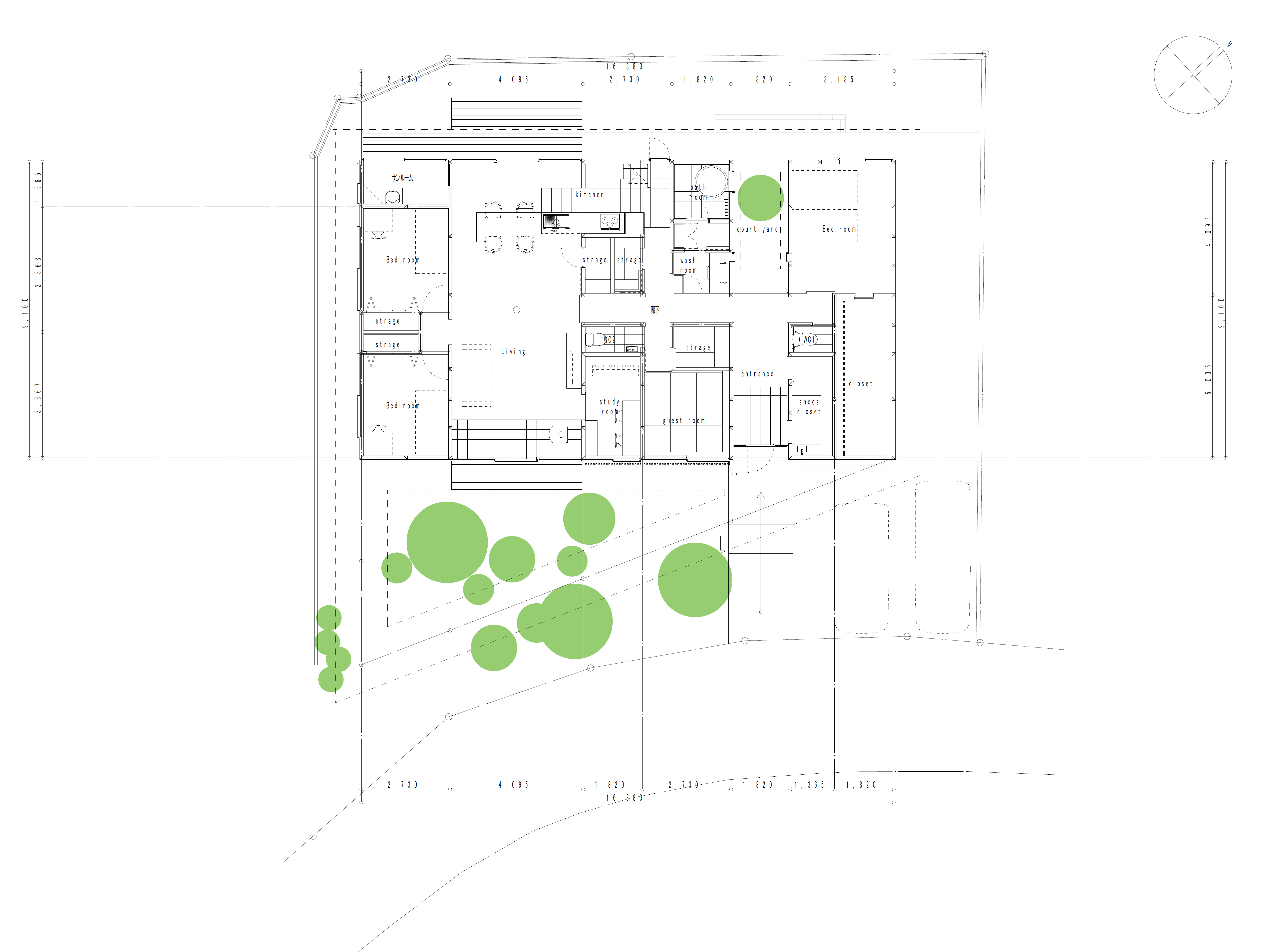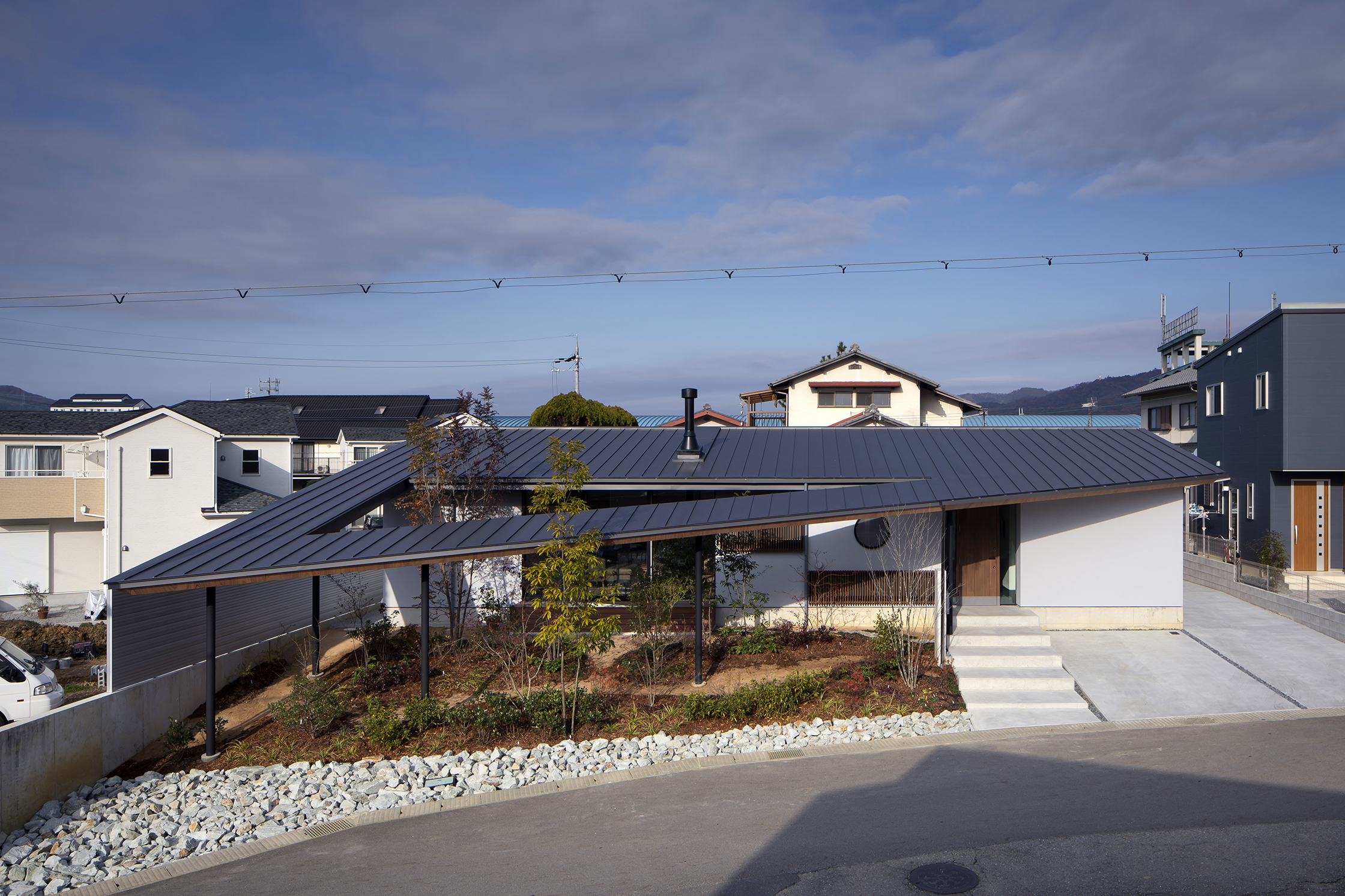 There is a maximum level difference of 1.4m between the site and the road. The plan is to make use of the level difference. The garden goes down a gentle slope towards the road. The roof stretches along the slope of the slope and goes down. The outside garden is surrounded by a perforated roof so that the garden is continuous with the room.
