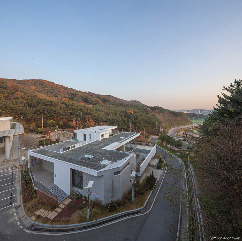 At the foot of Yeongchuksan Mountain in Yangsan, Gyeongsangnam-do, Hansong Art Village is the last project site among urban planning facilities and is located at the entrance to the Art Village. Yeongchuksan Mountain, where Tongdosa Temple is located, has a steep incline in the east and a gentle valley has developed in the west, contrasting with the topography of the east. The spatial meme on the western edge contains the shape created