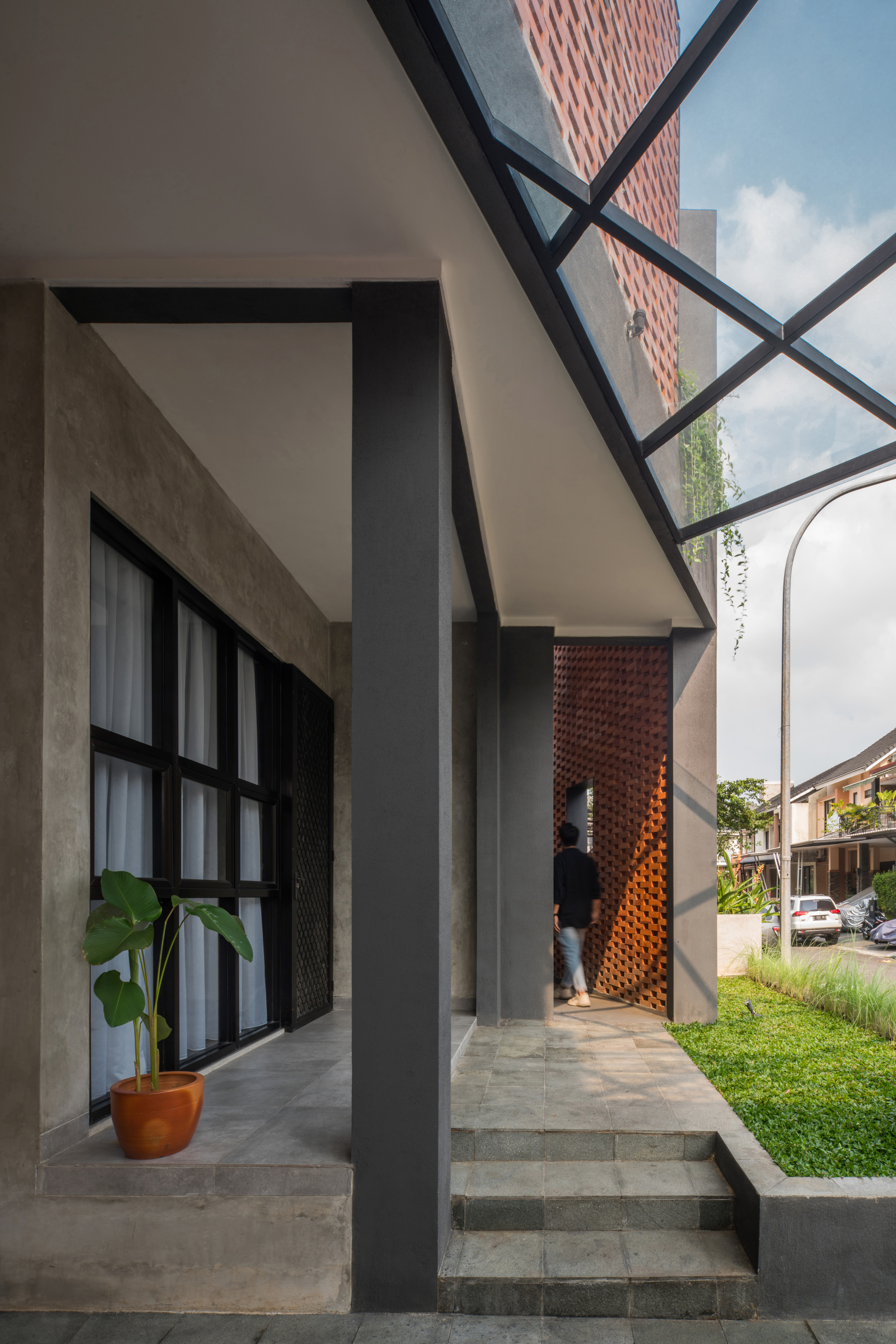 This project is a residential renovation project located in Tangerang Indonesia which has a tropical climate and is quite hot and humid. The existing building cannot meet the client's needs both in terms of space programs and in terms of design desires. Seeing this, we created a design by combining the needs of the occupants and the building itself, where the front of the building directly faces west so that the rooms in the front area have a hot air temperature until the evening. Therefore we added a layer on the facade of the building which aims to filter the light that enters the house. Because the name of the occupant is DJ, we also make the analogy of making the shape of the building as if it were two separate parts between the right and left sides like a turntable.