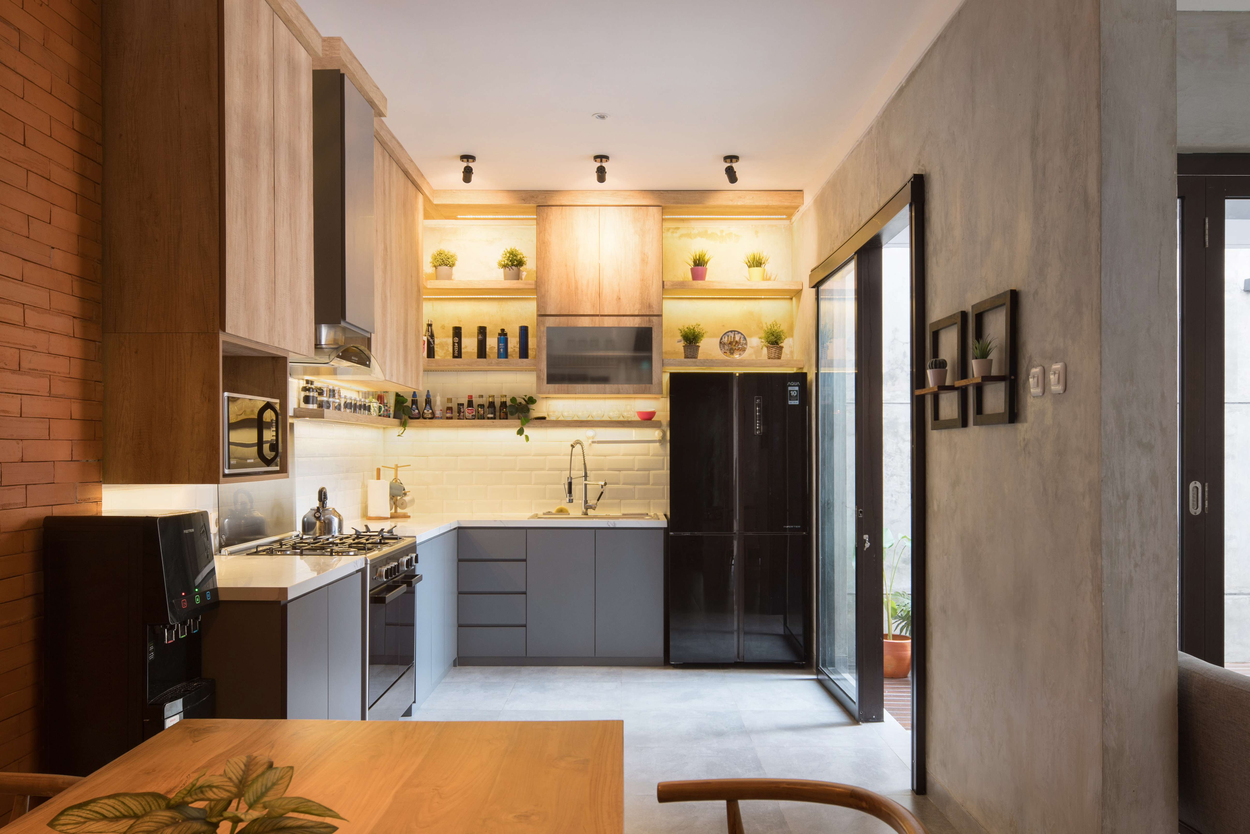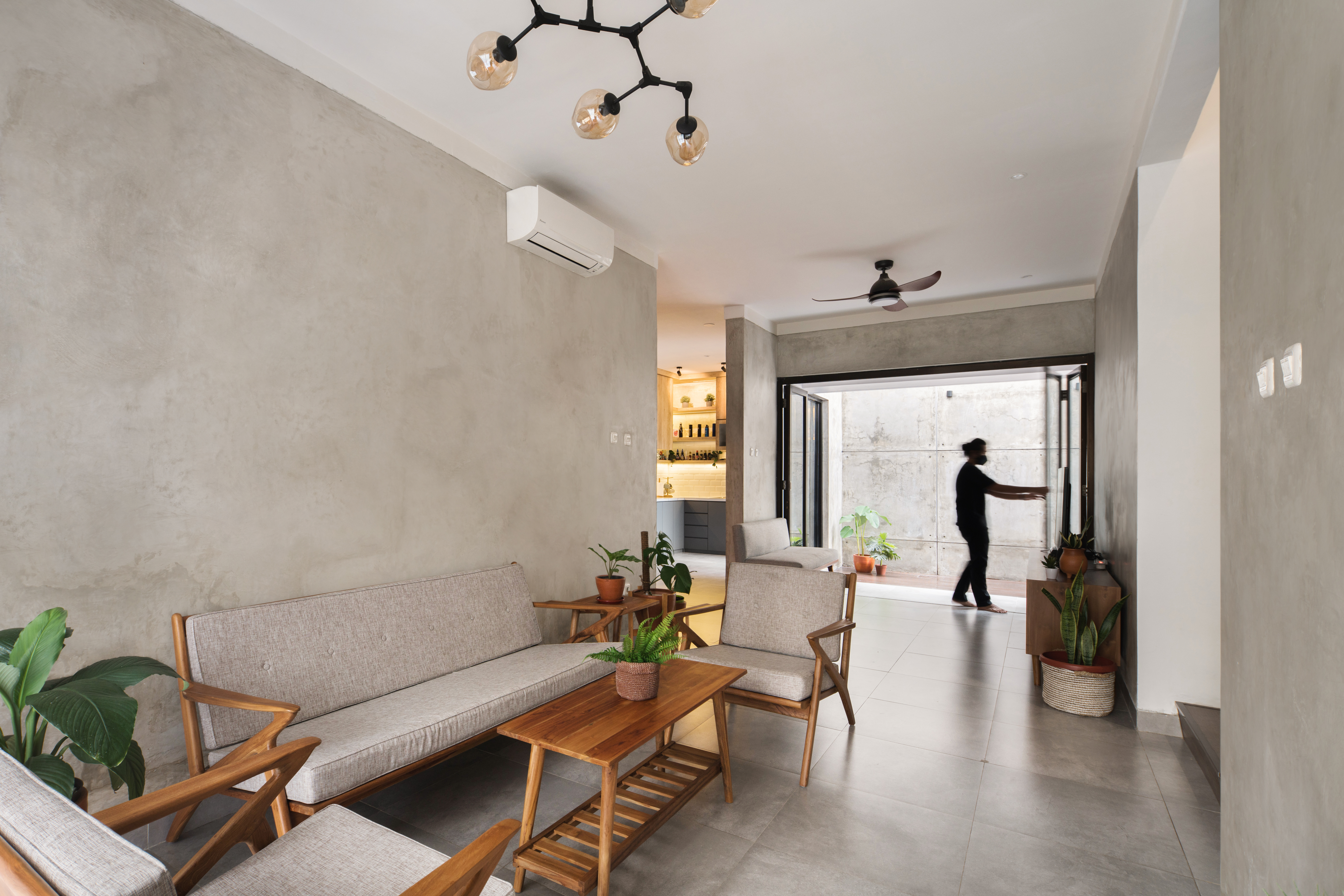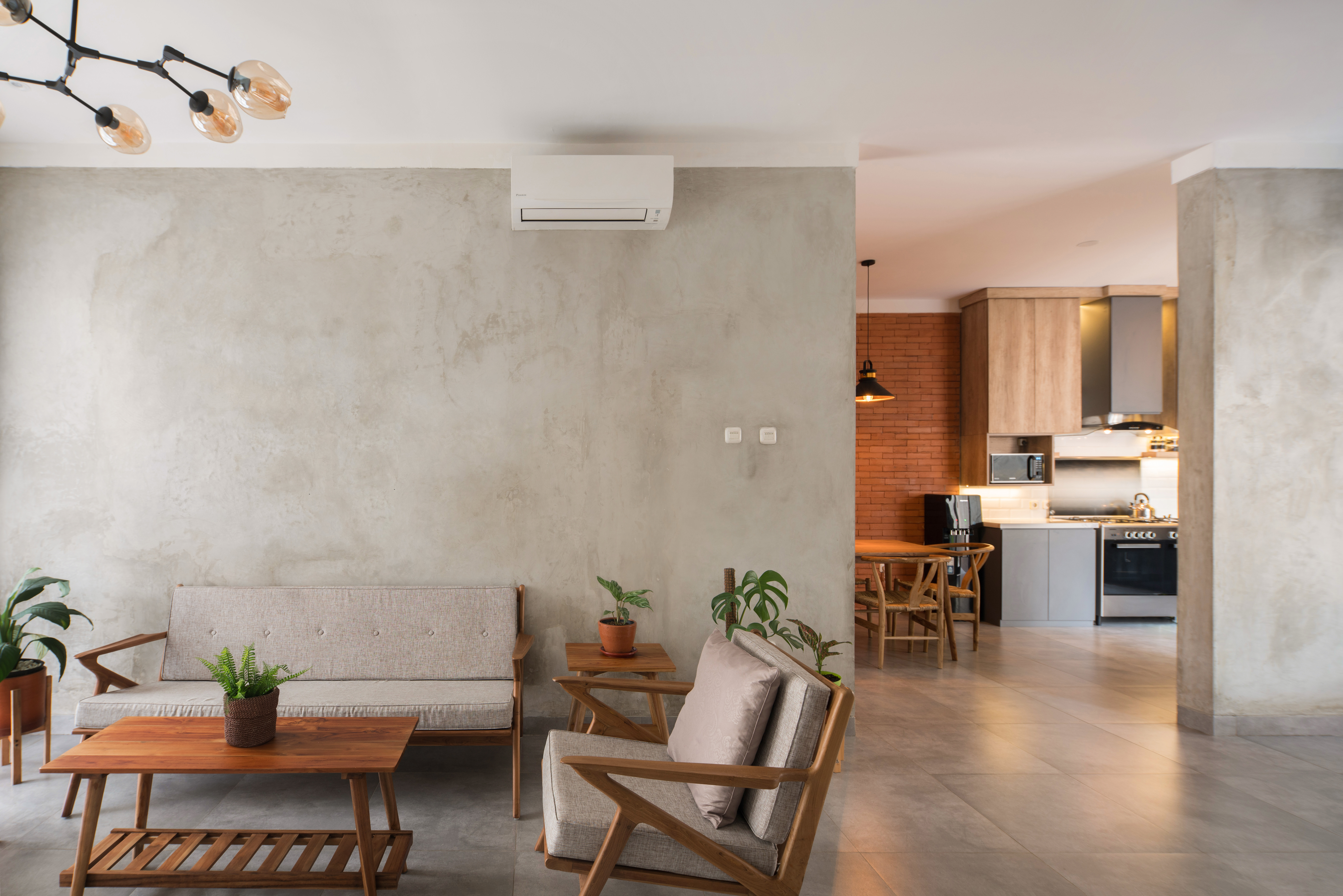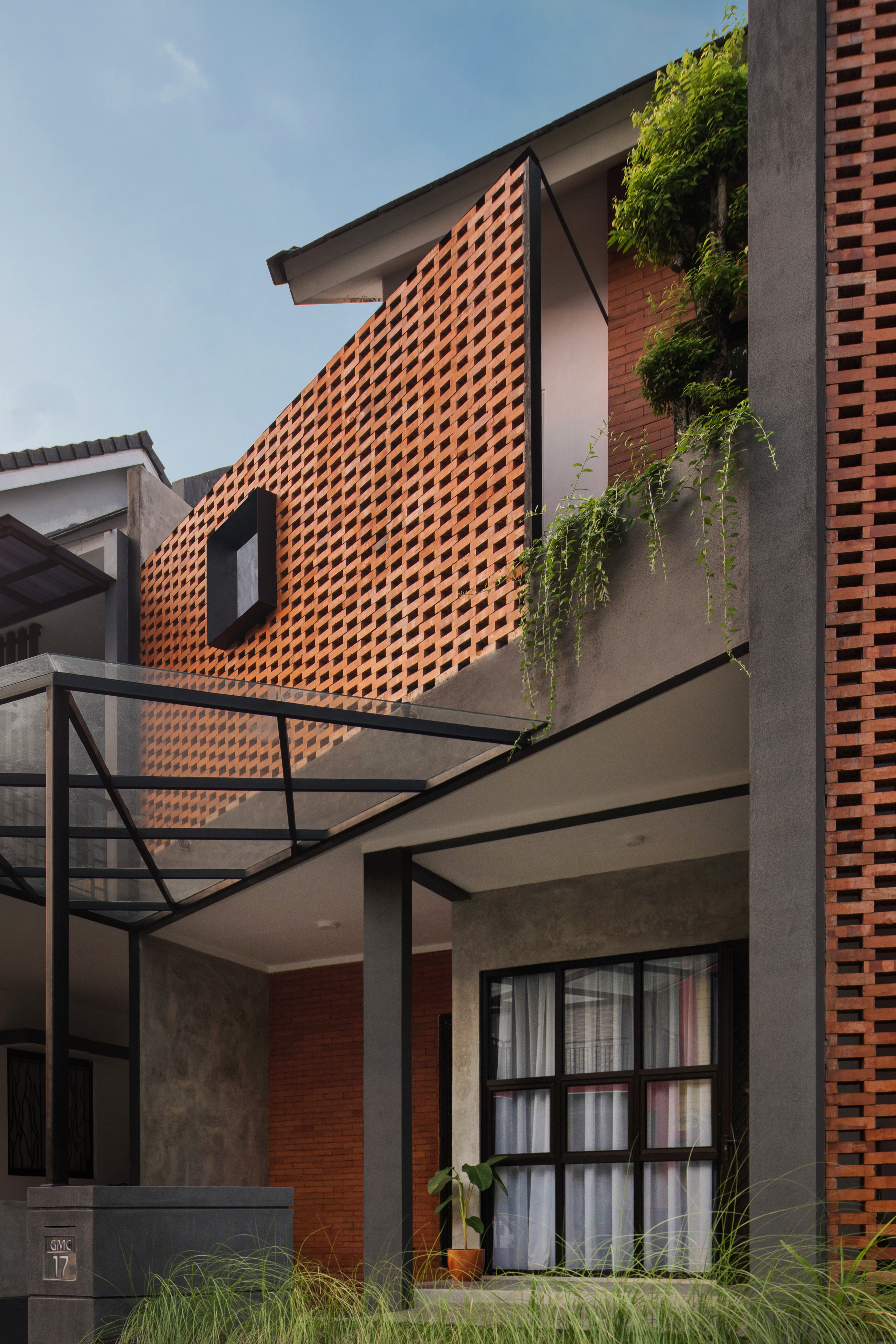 We use a lot of exposed materials on the exterior and interior to give a different feel from the existing building and provide visual satisfaction to clients who are young families. The dominant material in this project is brick, especially on the facade. There are two types of bricks used, namely interlock bricks and outboard bricks. The technique of installing interlock bricks on the facade is of course by adding iron reinforcement as a binder between the bricks to make it more sturdy with the shape of a brick arrangement that is spaced to form a perforated plane as air flow and forming shadows from sunlight. natural, namely using exposed cement on the walls, and gray floors.