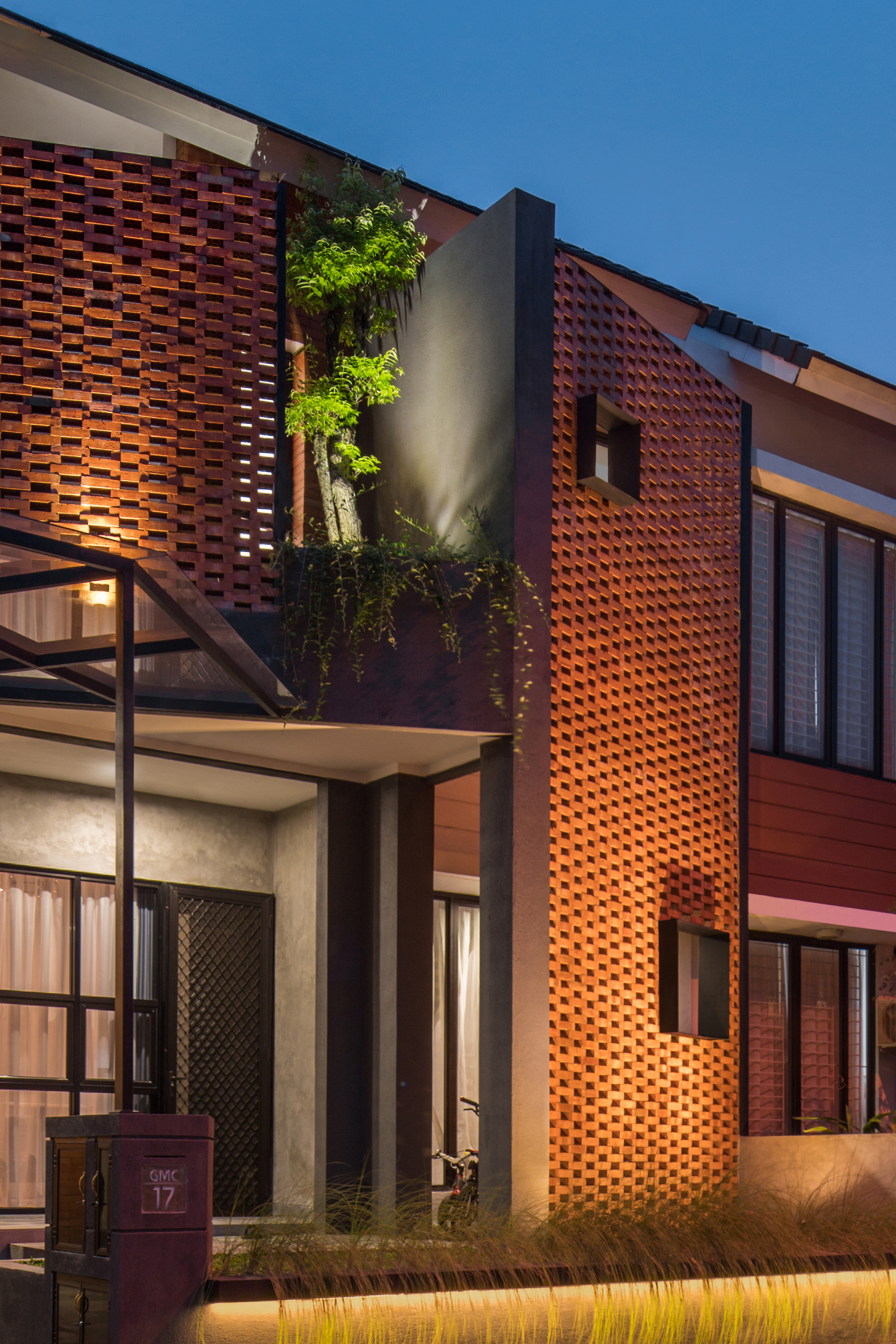 외관은 노출된 벽돌과 콘크리트가 주로 사용됐으며, 특히 입구 부분에는 태양빛을 막고 사생활을 보호하기 위해 가벽같은 것이 하나 더 세워졌다. 벽돌은 두 종류가 사용됐는데, 벽돌을 파사드에 고정하면서 일정 부분은 공기가 흐를 수 있도록 특별한 배열 형태를 가지고 있다. 독특한 배열은 벽돌 사이에 철강 보강재를 넣어서 견고한 구조를 가지고, 햇볕을 통해 들어오는 다양한 그림자를 만들며 심미적으로도 우수하다.
