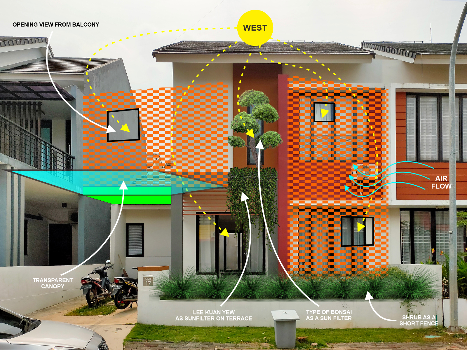 덥고 습한 열대 기후를 가진 인도네시아 탄게랑에 옛 주택을 개조하여 만들어진 DJ 하우스가 있다. 대지에 있던 옛 주택은 저녁에도 무더운 이 지역의 기후와 맞지 않는 부분이 많았으며, 시각적으로 노후화되어 있는 상태였다. 건축가는 젊은 가족인 건축주를 위하여 완전히 새로운 외관과 햇볕을 막고 공기의 순환을 돕는 몇가지를 제안했다.