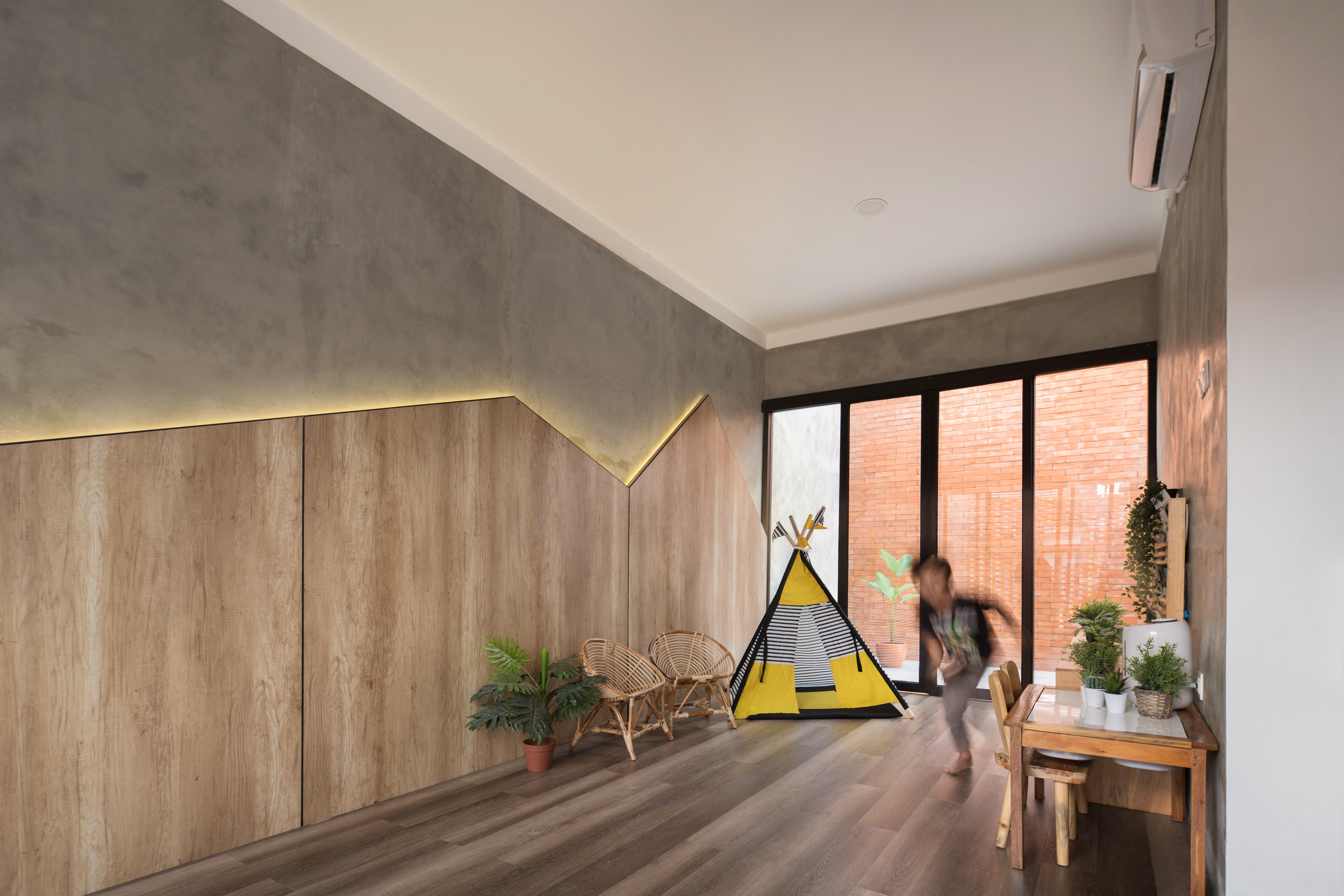 We use a lot of exposed materials on the exterior and interior to give a different feel from the existing building and provide visual satisfaction to clients who are young families. The dominant material in this project is brick, especially on the facade. There are two types of bricks used, namely interlock bricks and outboard bricks. The technique of installing interlock bricks on the facade is of course by adding iron reinforcement as a binder between the bricks to make it more sturdy with the shape of a brick arrangement that is spaced to form a perforated plane as air flow and forming shadows from sunlight. natural, namely using exposed cement on the walls, and gray floors.
