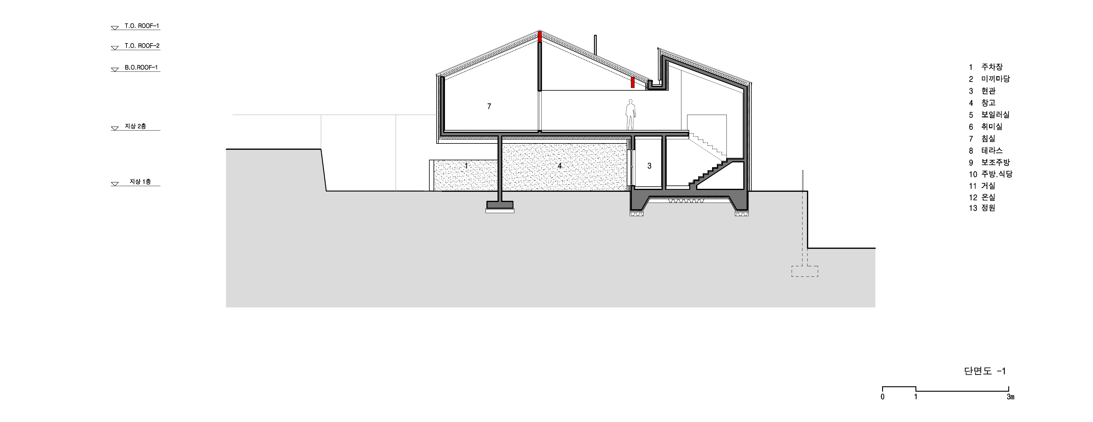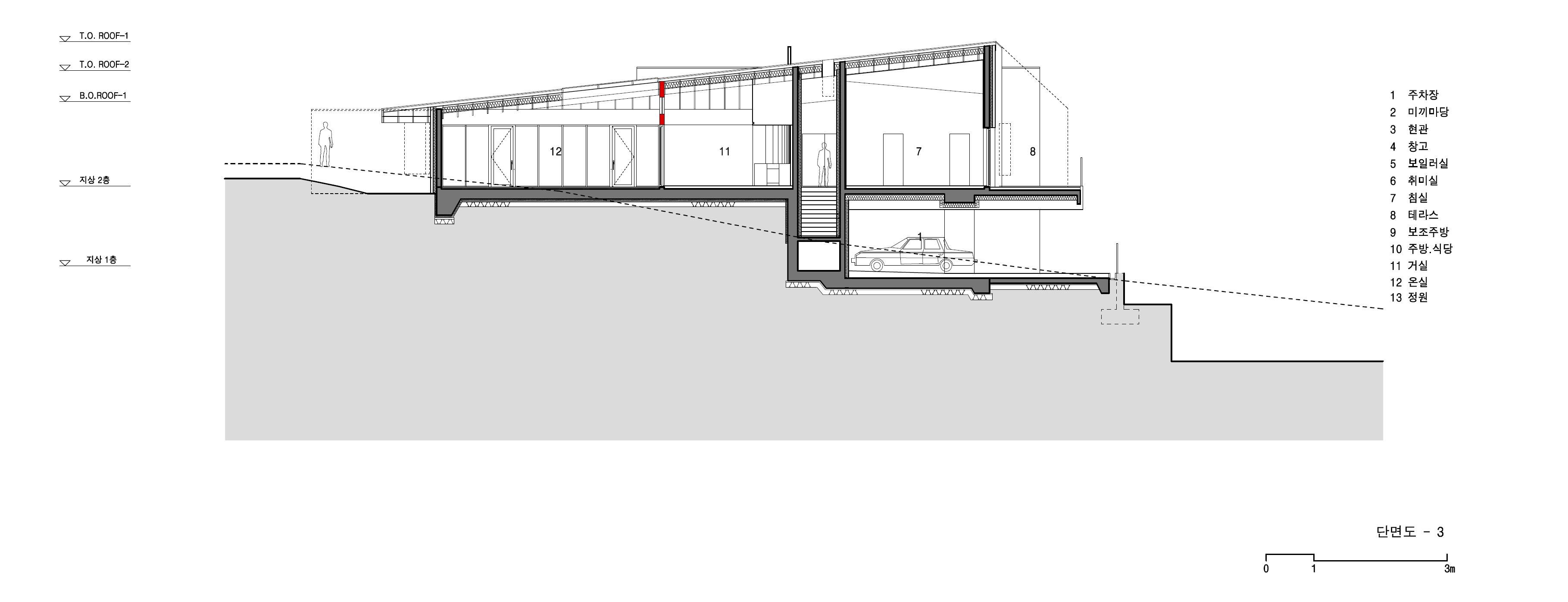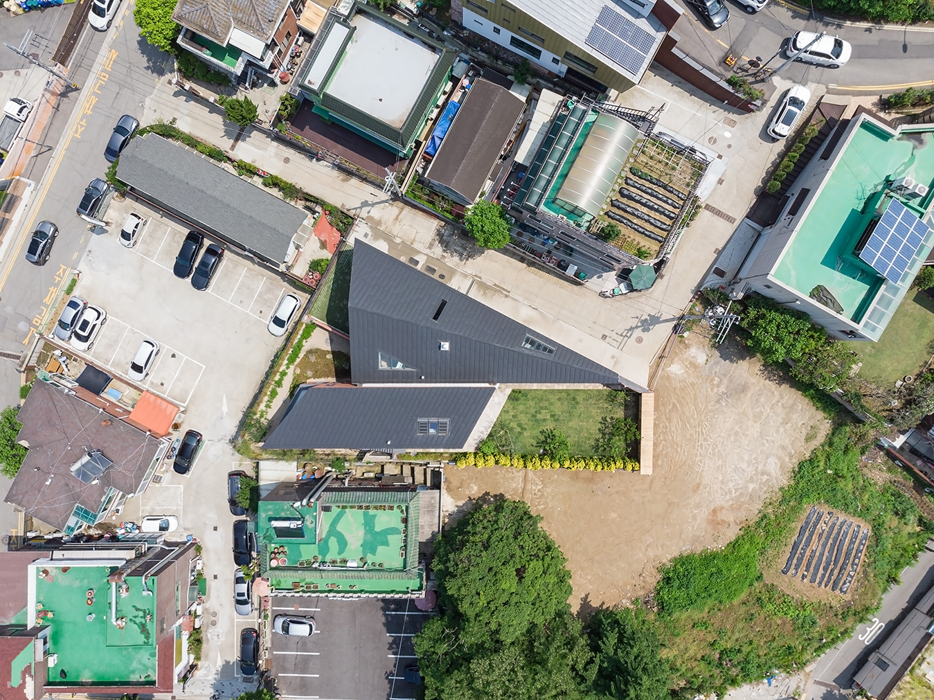 The land is a little less than 200 pyeong, divided into two axes 3.5m high, and has a pointed triangular shape in the south. The requirement of the owner who cultivated flowers and trees and enjoyed calligraphy was a yard with a small greenhouse, and the greenhouse was connected to the corner of the living room to complete ‘Dongchun Greenhouse’.