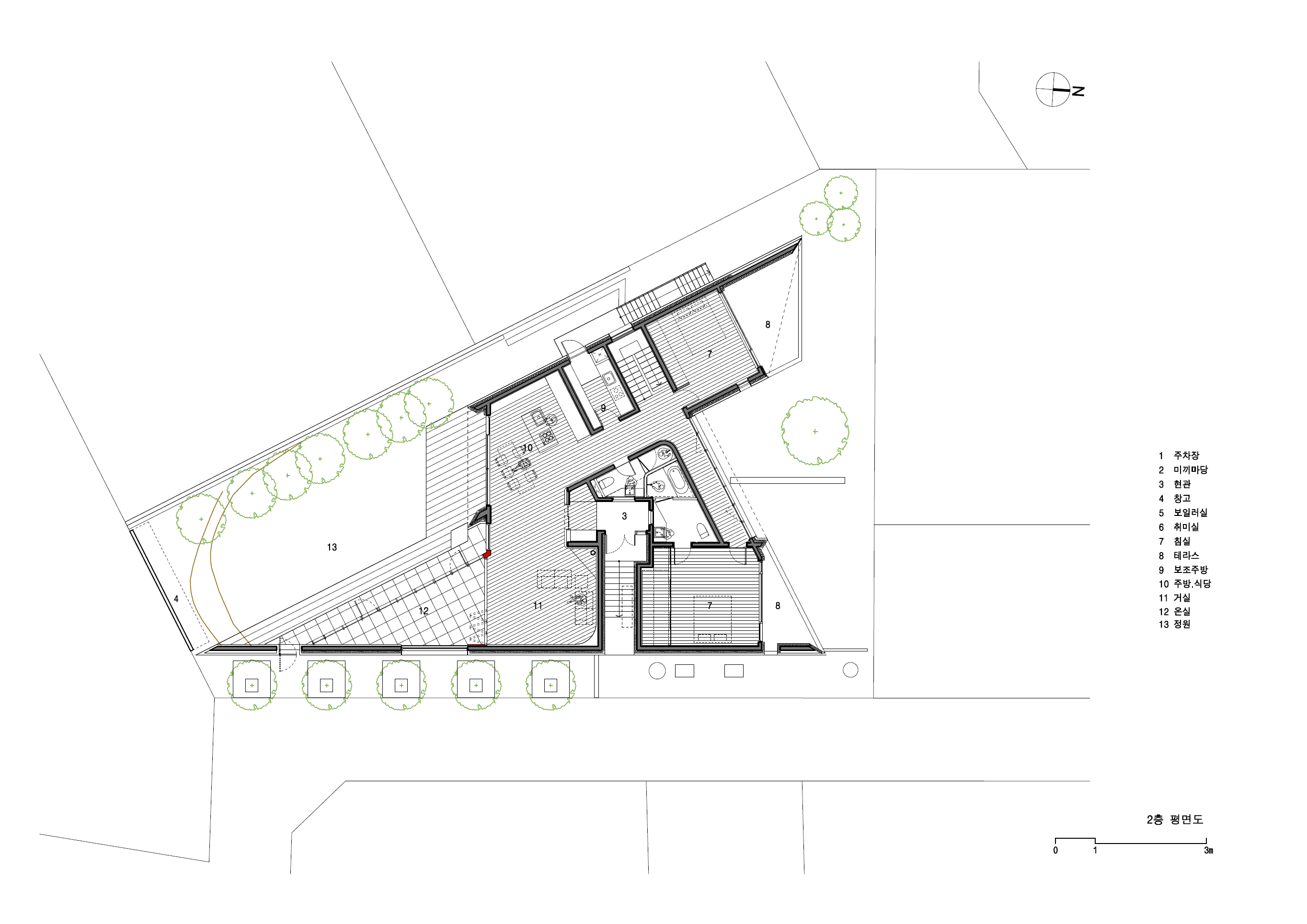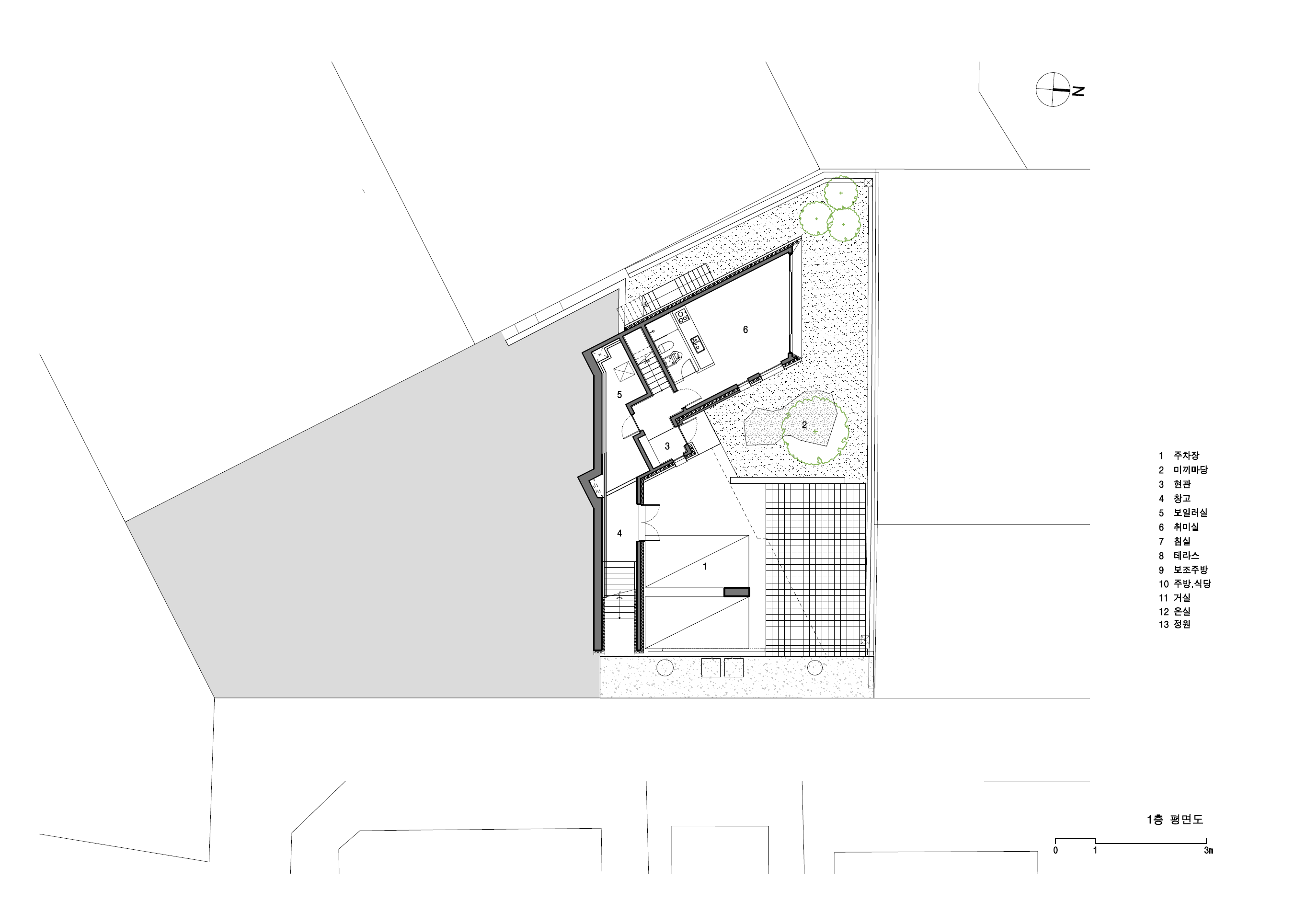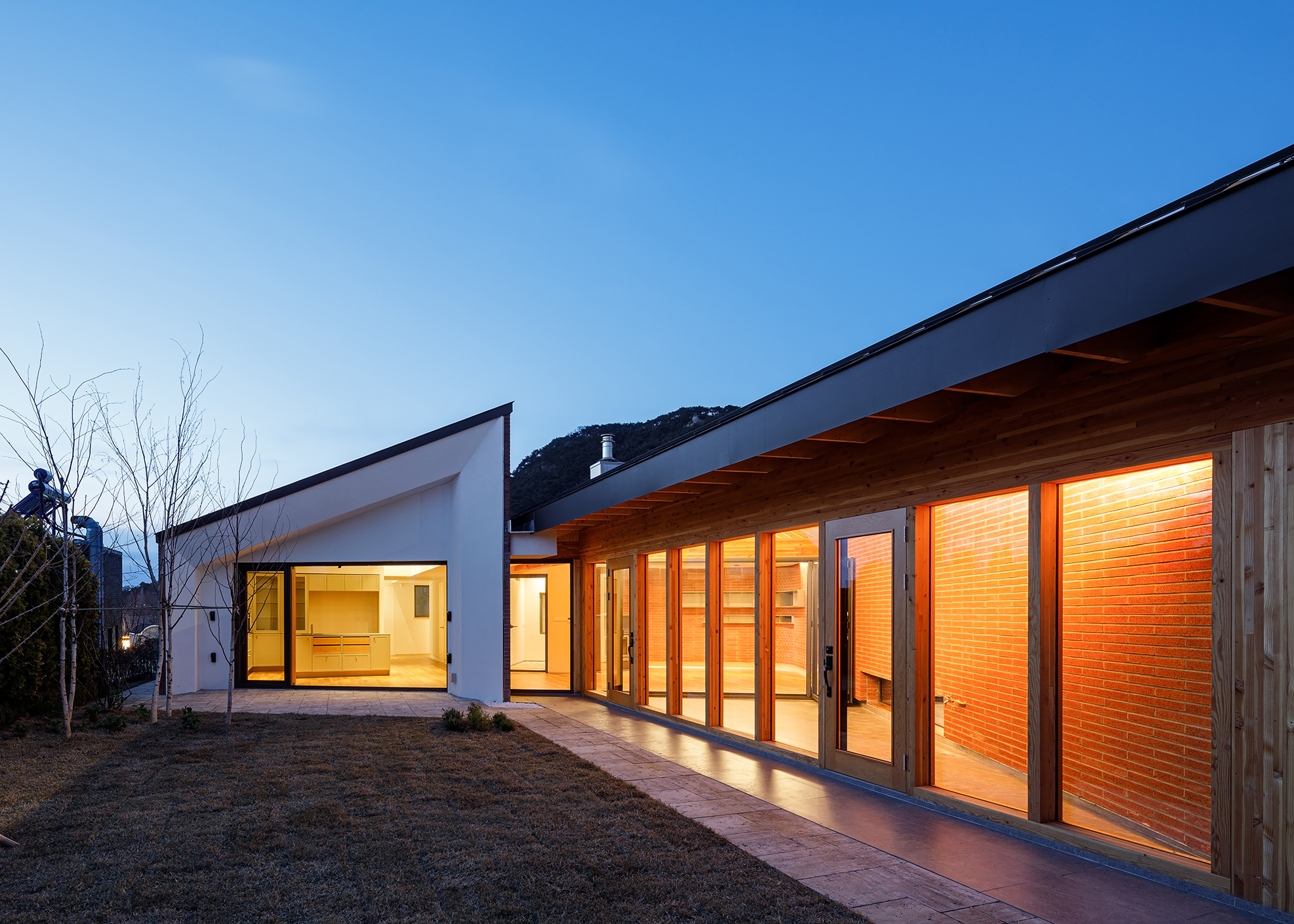 The land is a little less than 200 pyeong, divided into two axes 3.5m high, and has a pointed triangular shape in the south. The requirement of the owner who cultivated flowers and trees and enjoyed calligraphy was a yard with a small greenhouse, and the greenhouse was connected to the corner of the living room to complete ‘Dongchun Greenhouse’.