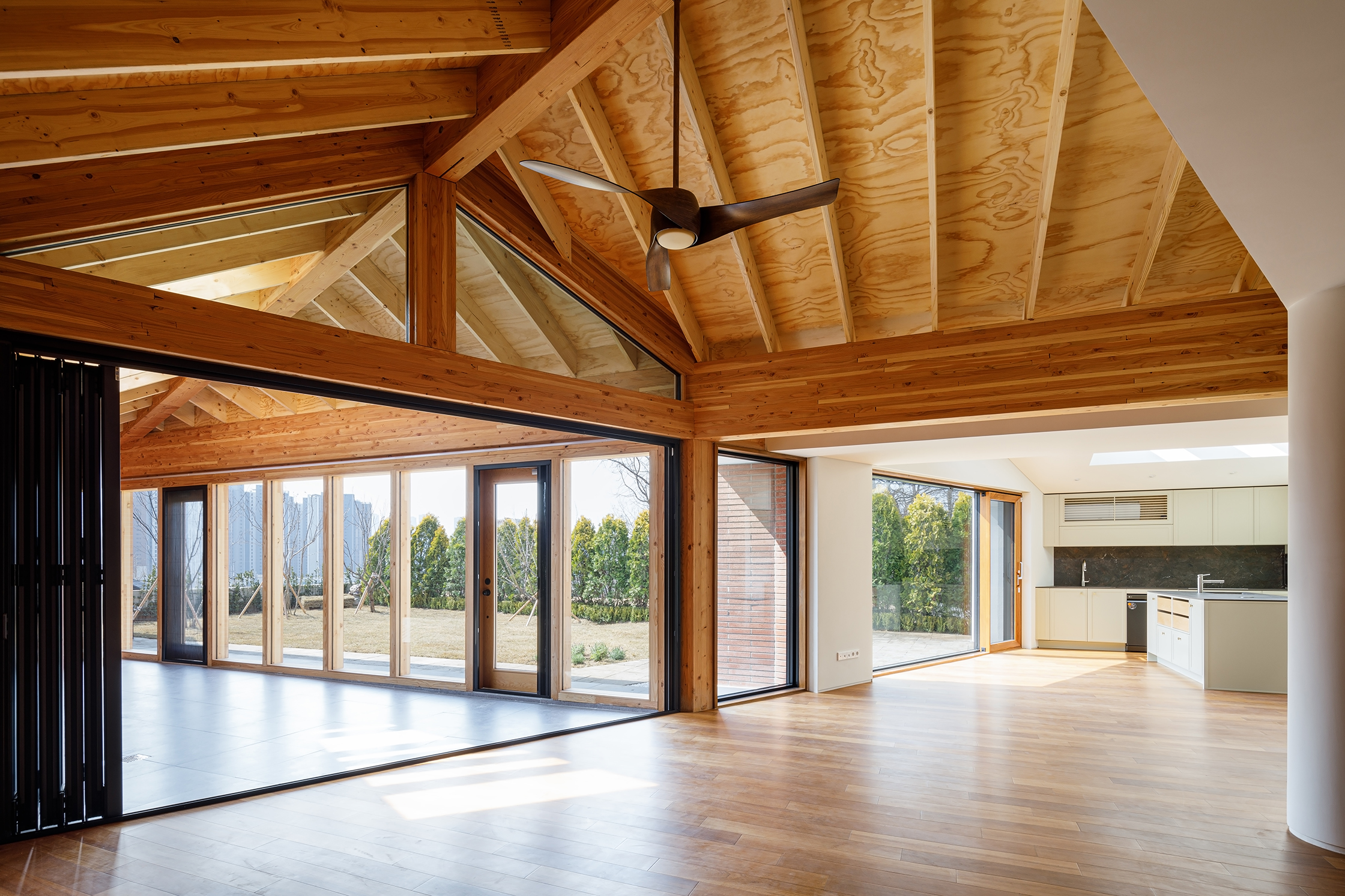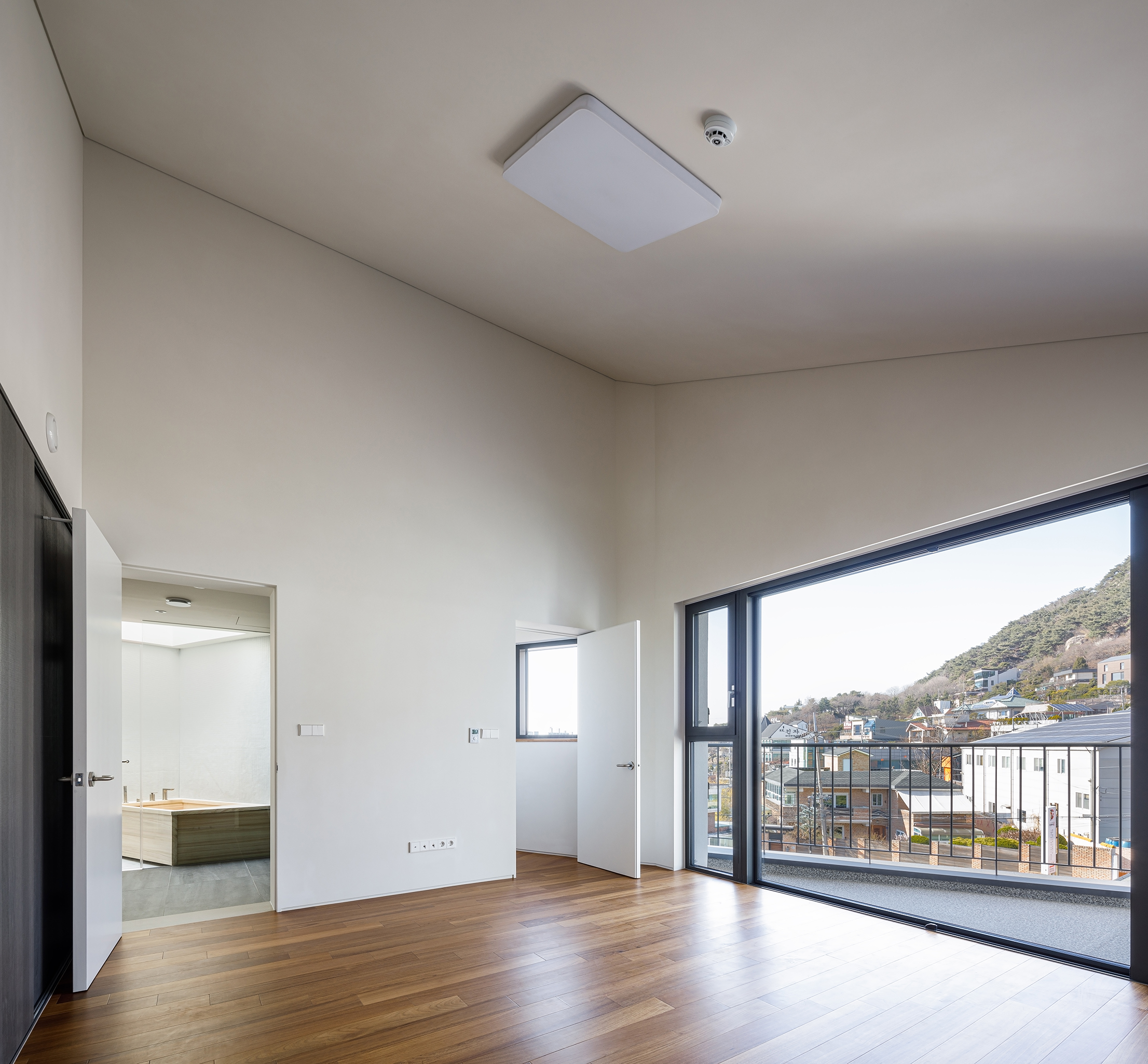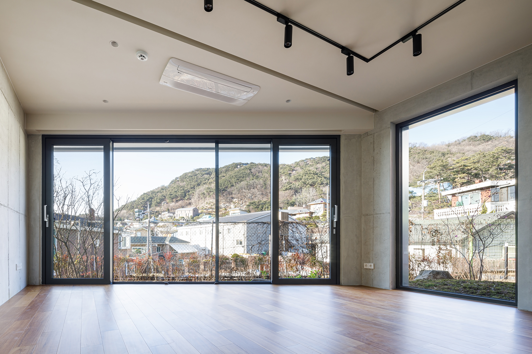 The land is a little less than 200 pyeong, divided into two axes 3.5m high, and has a pointed triangular shape in the south. The requirement of the owner who cultivated flowers and trees and enjoyed calligraphy was a yard with a small greenhouse, and the greenhouse was connected to the corner of the living room to complete ‘Dongchun Greenhouse’.