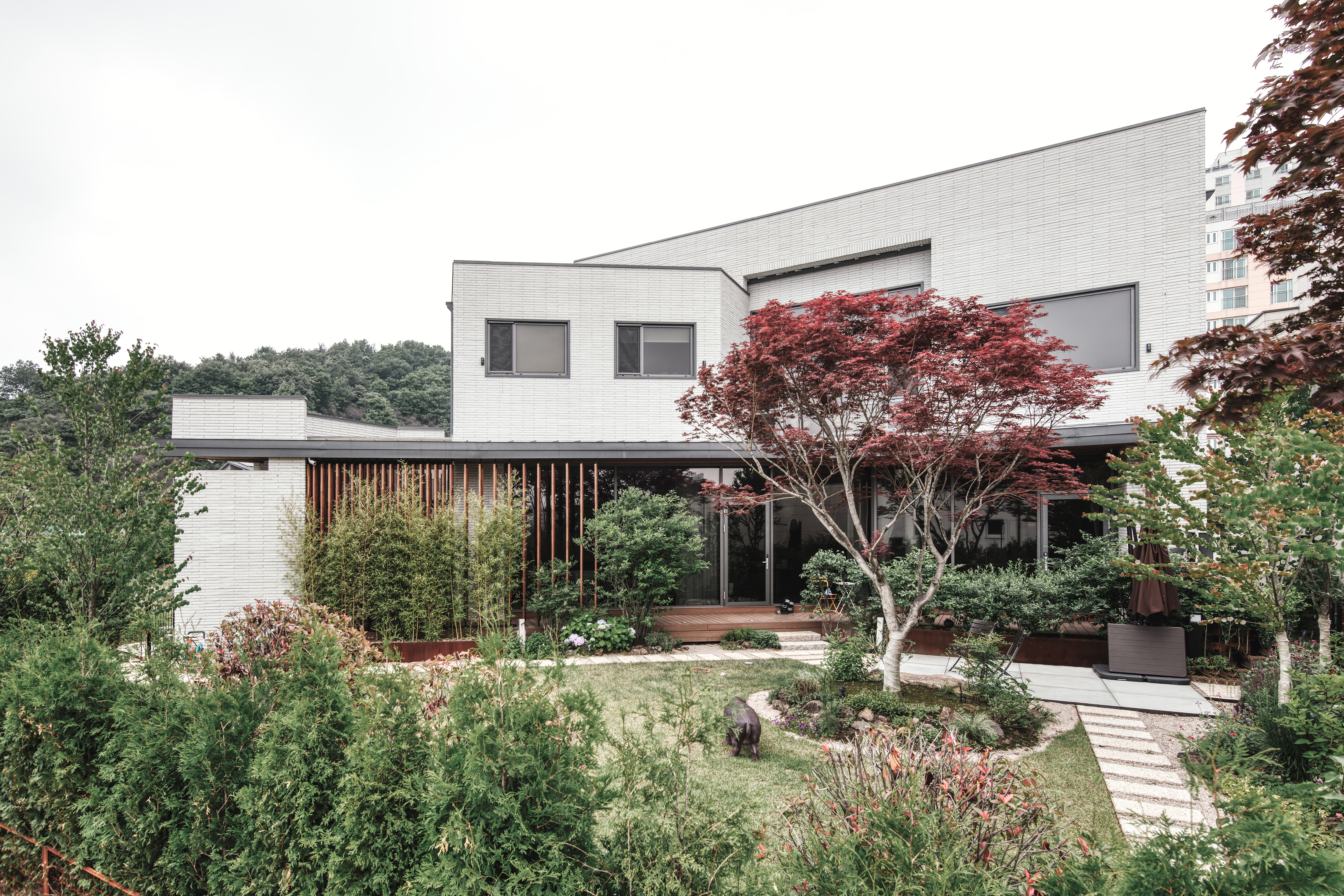 Located in a detached house complex in Sejong City, Siseonjae Pass was created by intervening diagonal elements on a square shaped site. The diagonal runs along the axis of the house's vertical mov..