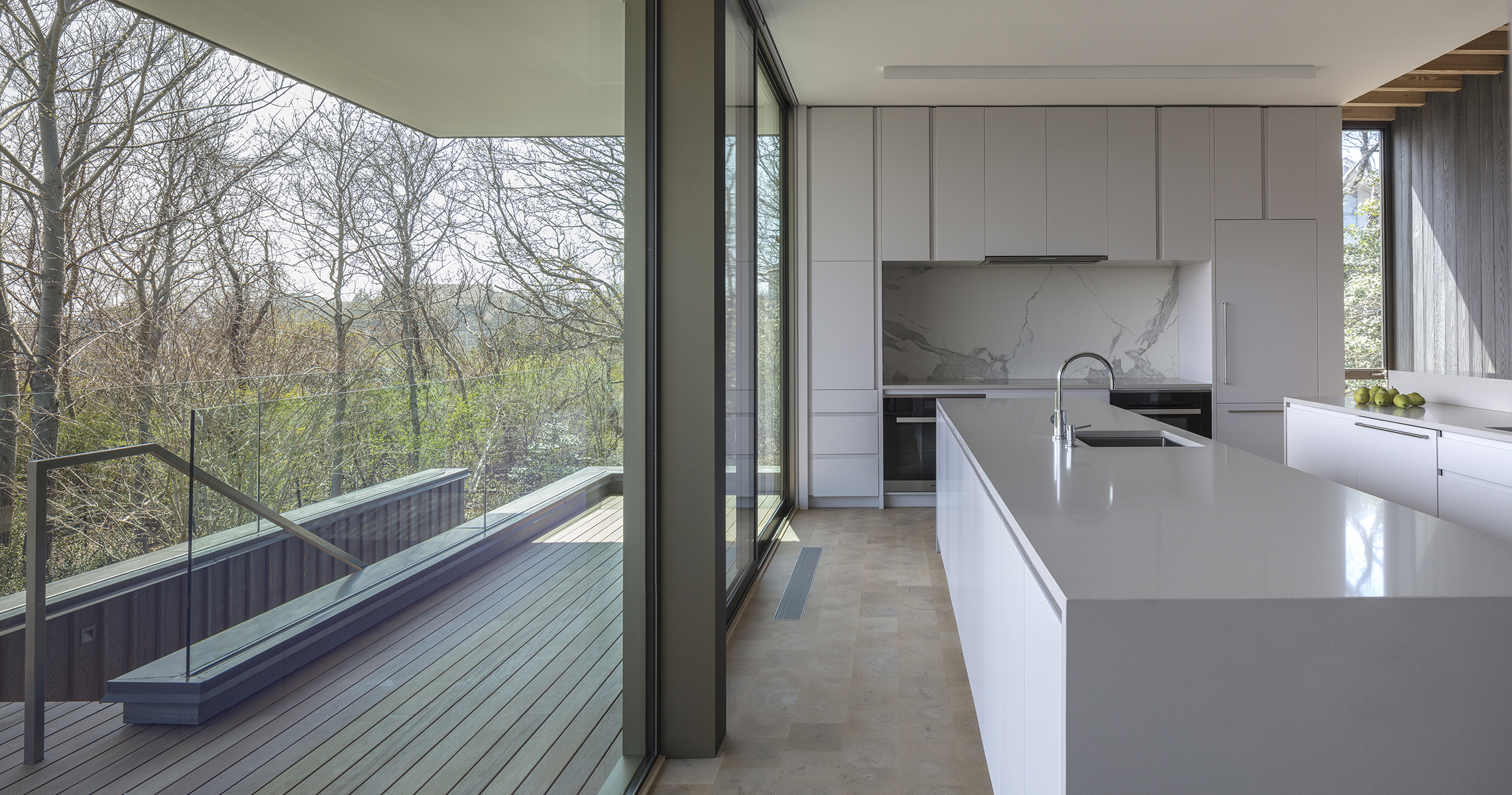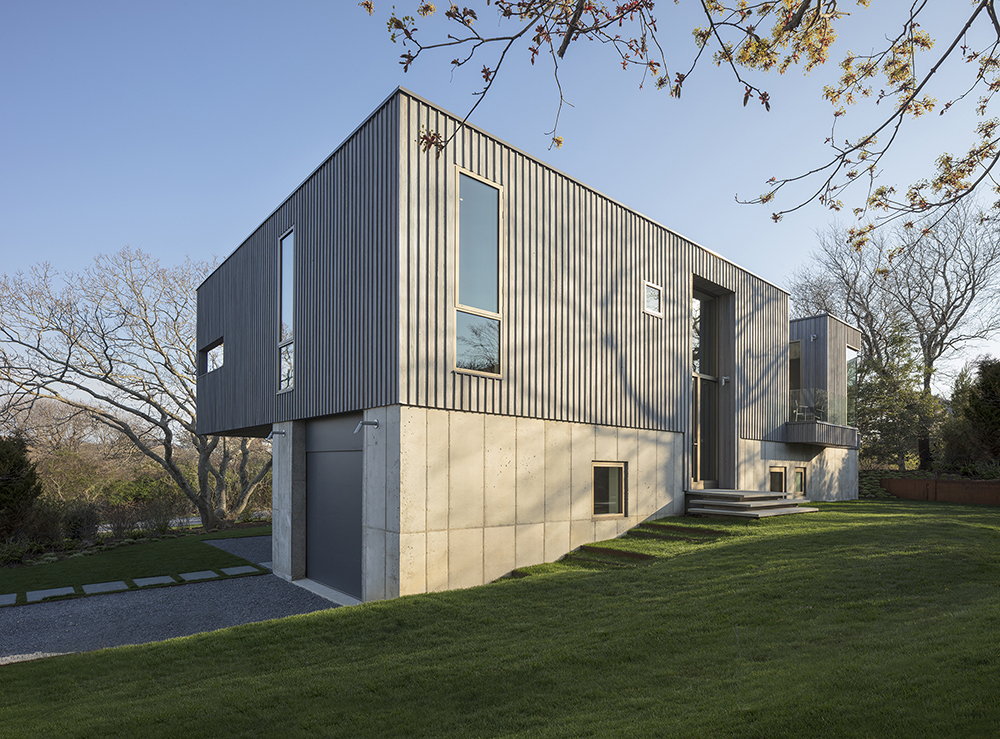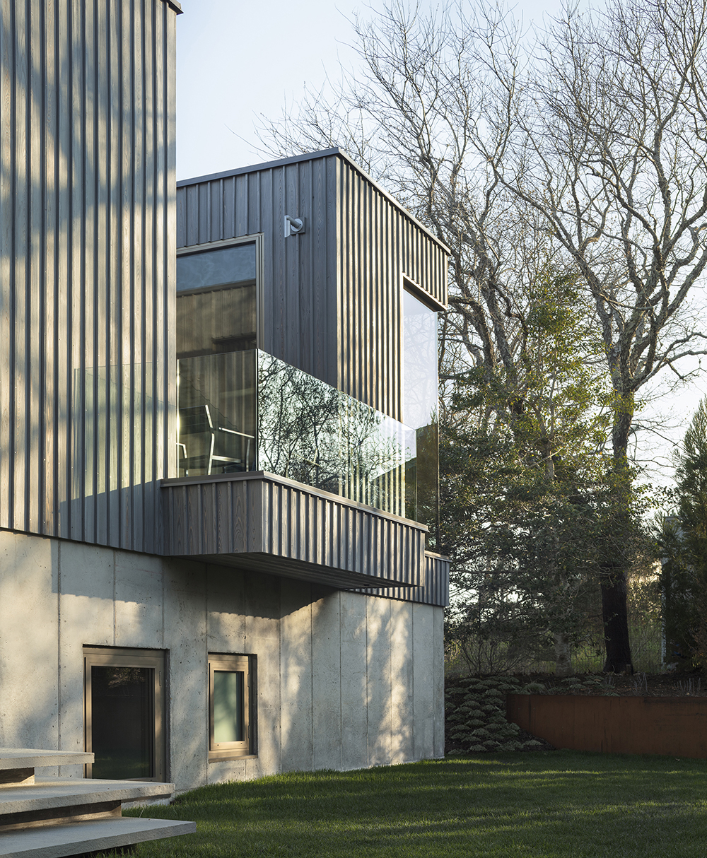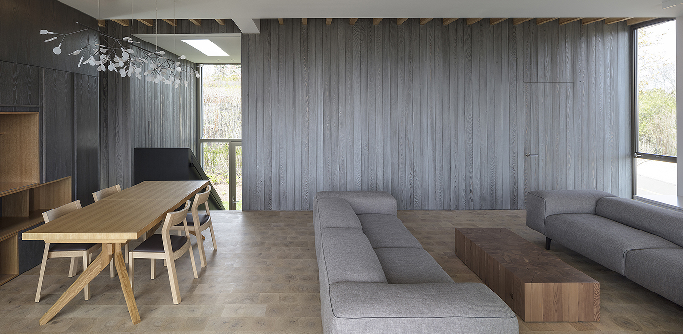 The house facade is a combination of exposed concrete and shou sugi ban- a rainscreen of wood that lets the facade breathe. Shou sugi ban is a traditional Japanese process of burning the surface of wood to make it rot-proof and bug-resistant. The wood color and texture reference vernacular Montauk architecture while articulating an iconic, crisp, modern form. The wood wraps into the interiors, framing the living spaces on the upper floor and cascading down the staircase to the family room.