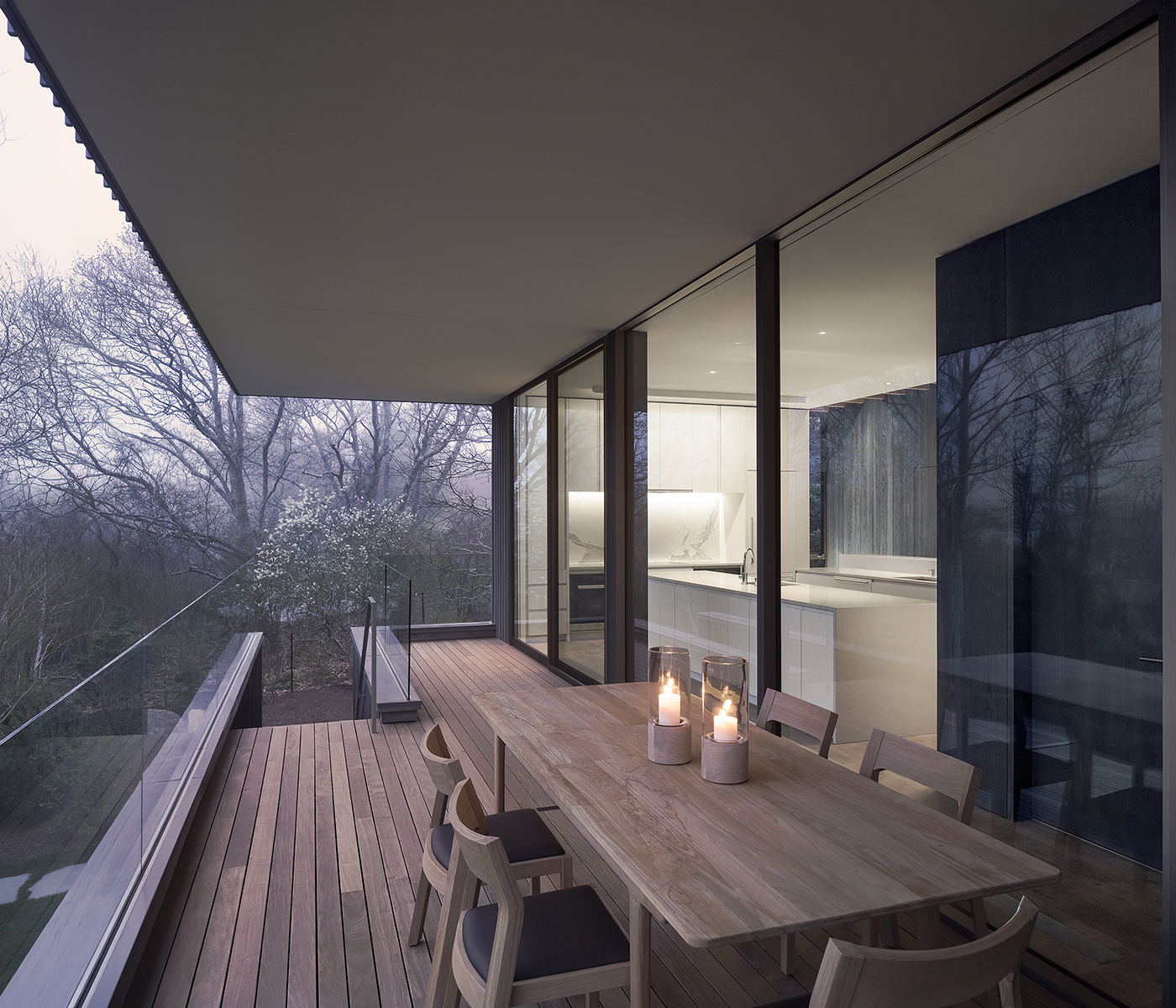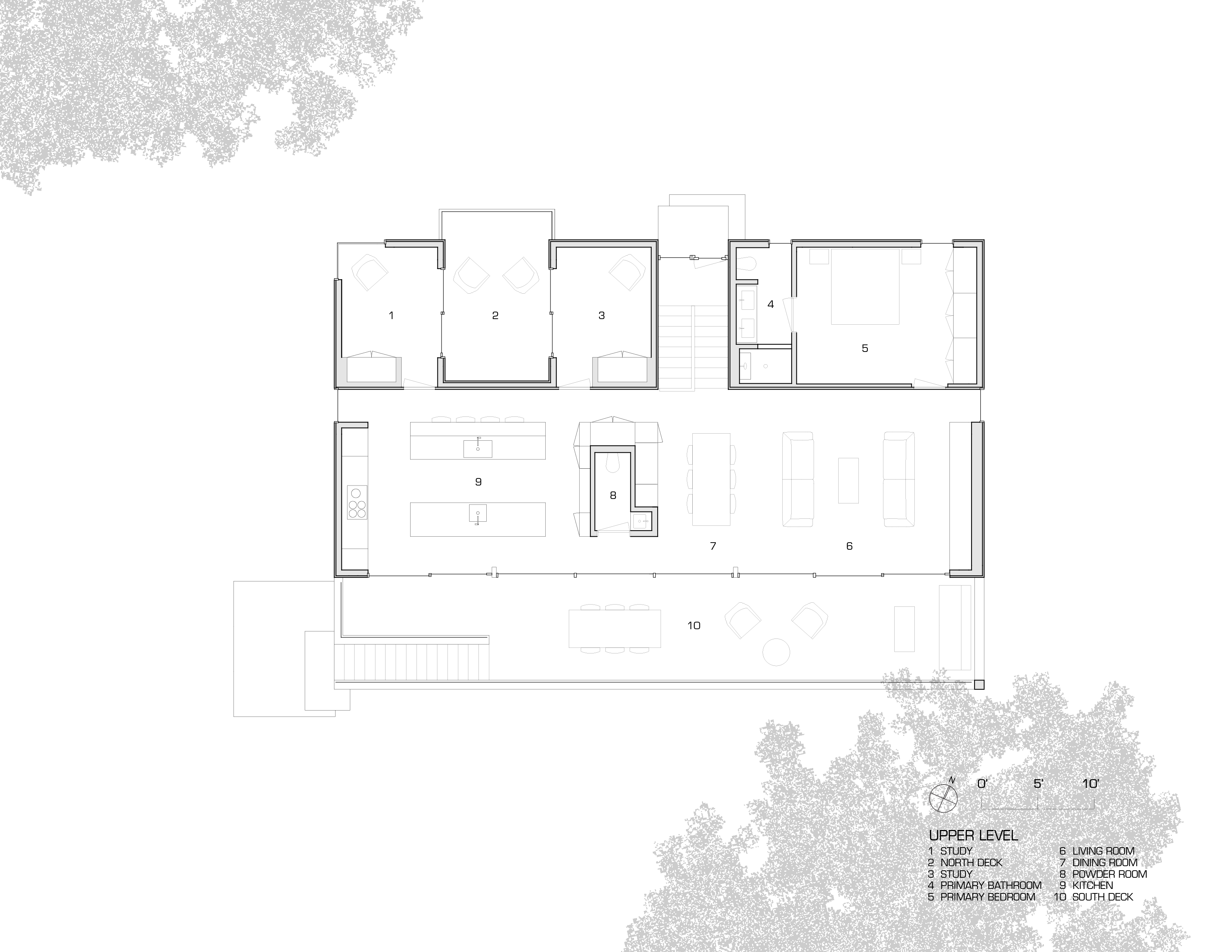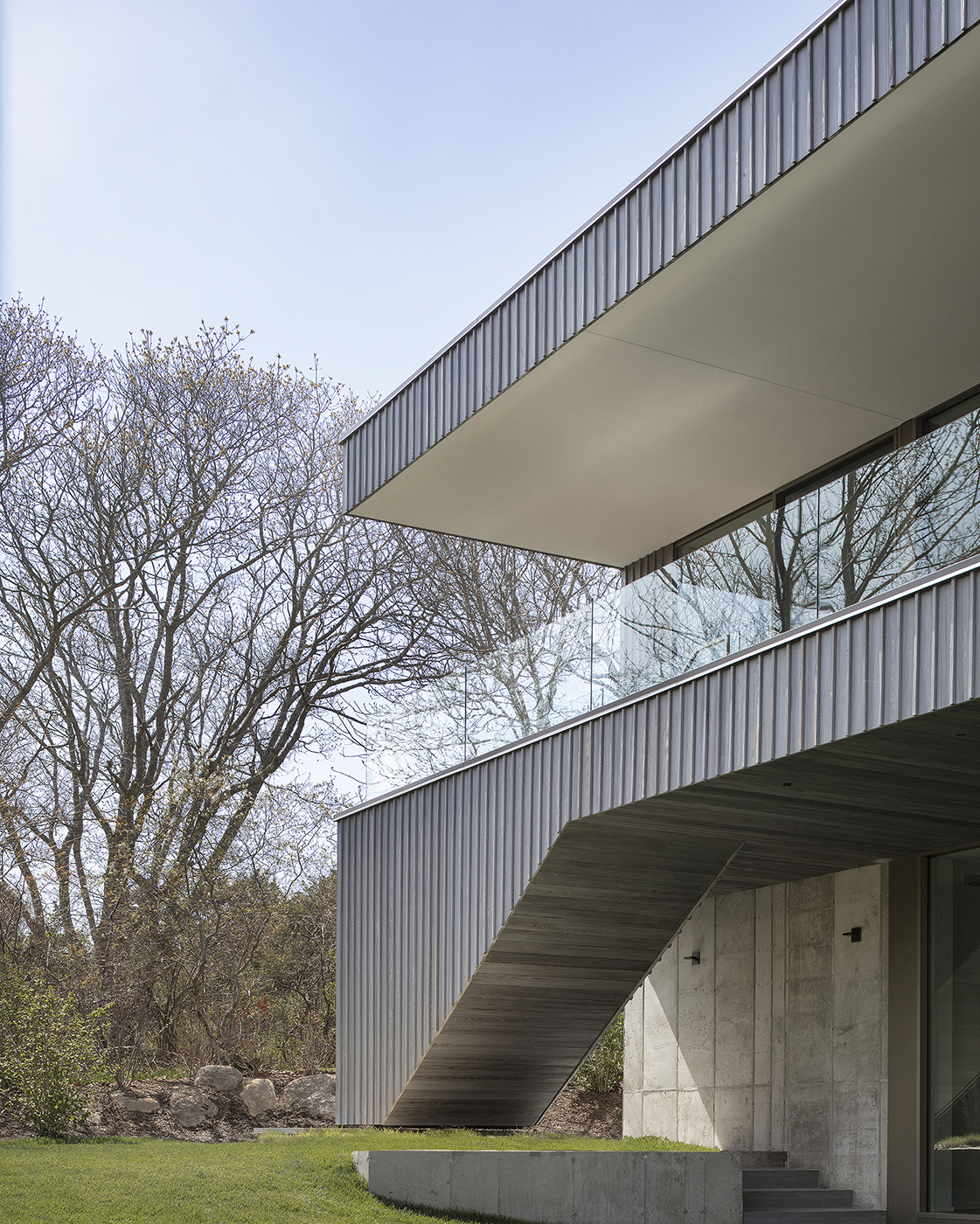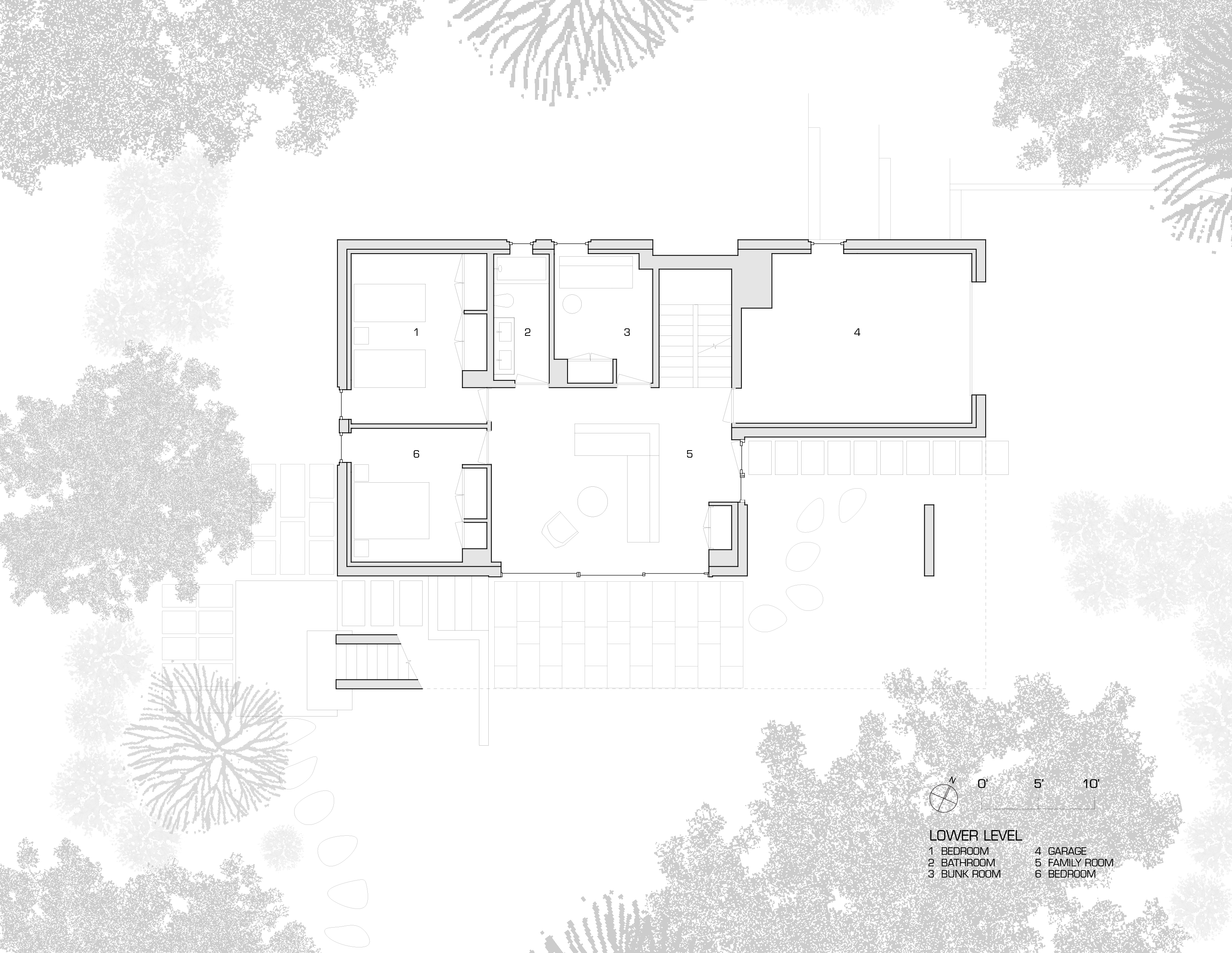 The house was designed to promote family interaction with easy flow between indoor and outdoor activities and clear sight lines across large sections of the home. Three terraces allow family activities to spill out to the outdoors. One is a “garden” terrace that connects the family room to the landscape. A second, “reading” terrace is shared by the parents' studies. The third, “breezeway” terrace spans the living/dining areas & kitchen. Covered by a cantilevered roof, it allows the family to live and dine outside, essentially doubling the size of the living/dining areas in the summer.