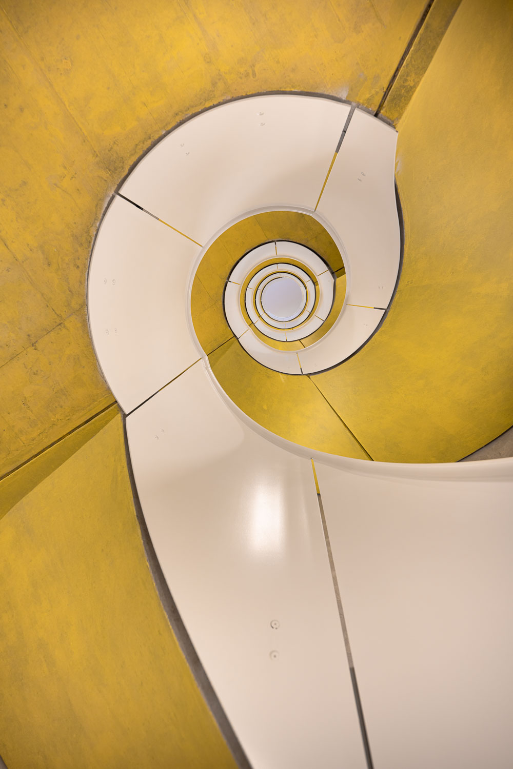 Once you enter any of the three- or four-storied buildings, you instantly know which one you are in, since the inner ceilings in semi-public spaces are painted in corresponding colour. Equally applied on the underside of the spiralling concrete staircases, which creates a near-psychedelic effect. The exterior hues are correspondingly applied on the windowsills, balcony fences and retractable awnings.
