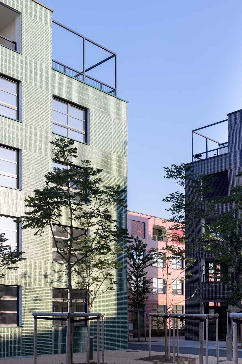 Angular, shimmering brick veneer facades in green, yellow, aubergine, and red gives a strong identity to HHF Architects’ winning entry for part of the new master plan Parc du Simplon in Renens, Lausanne. The ruggedness and simplicity of the bricks are evocative of the site’s industrial history, while the glazed surfaces contribute to the lively atmosphere of the area.