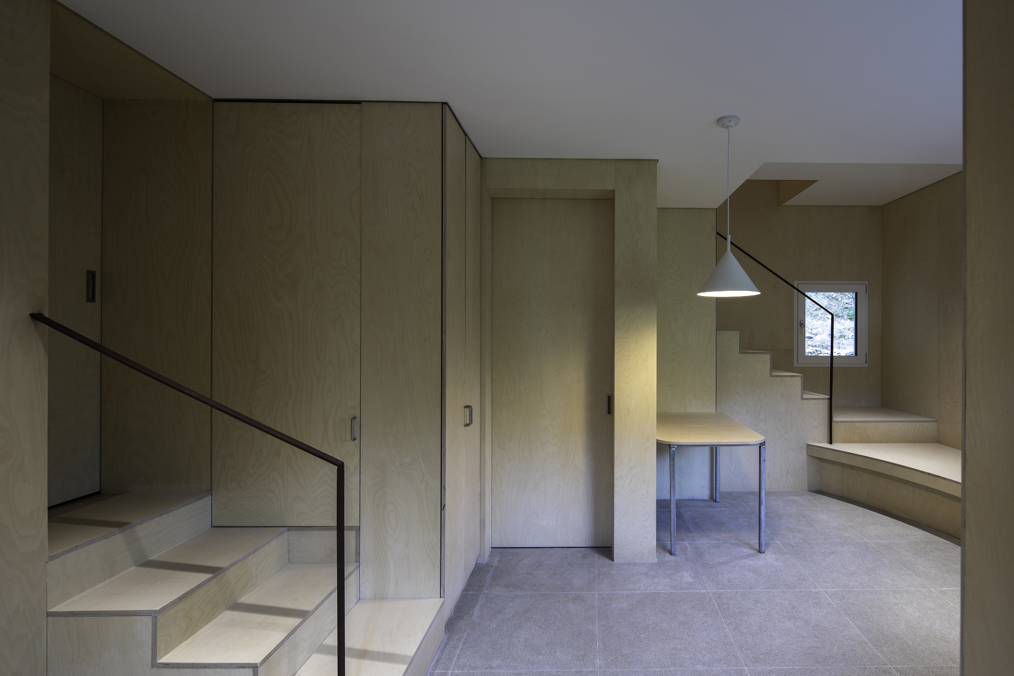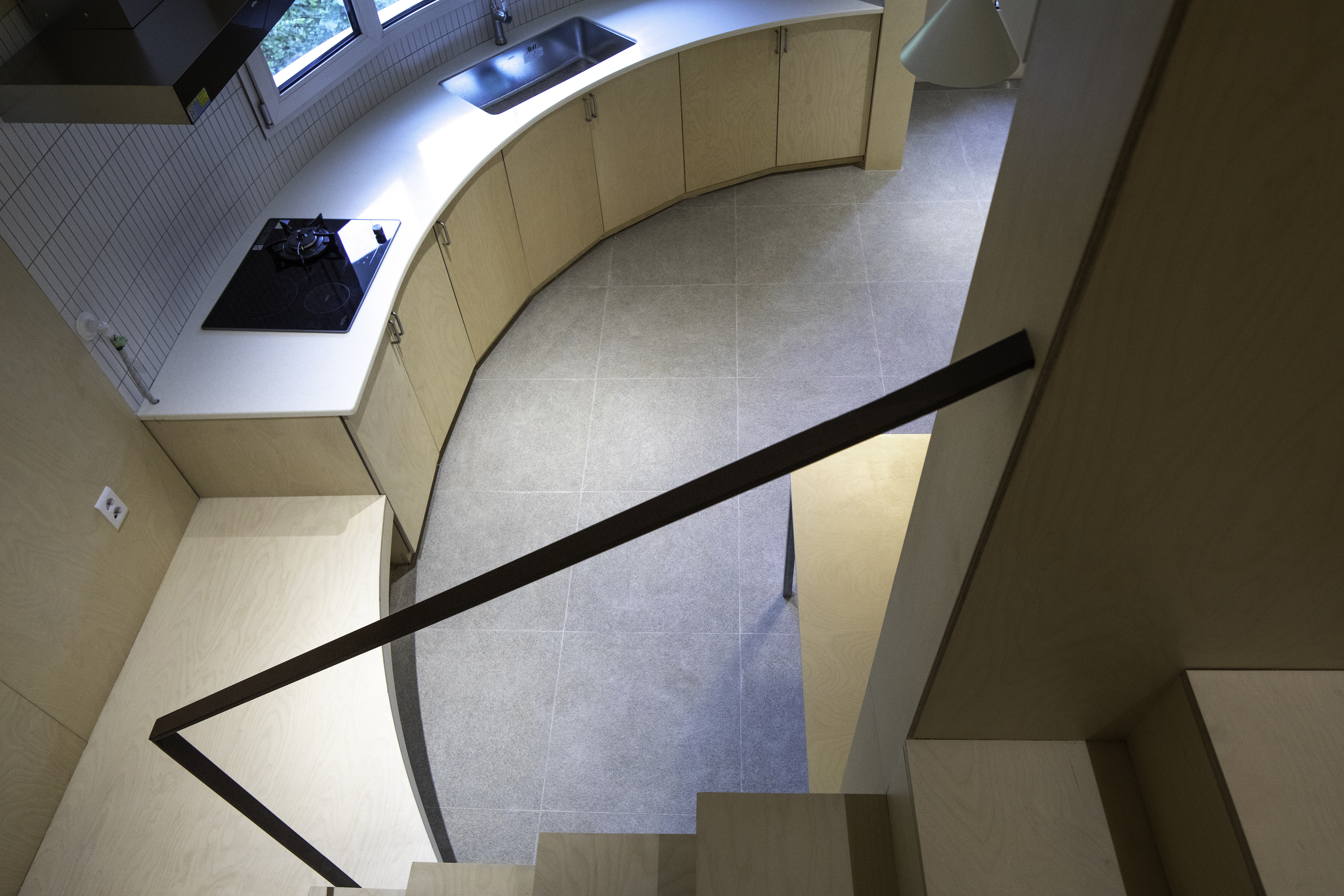 이 주택은 산 중턱에 위치하여 콘크리트 공사는 배제해야 했고, 시공사 선정에도 어려움이 따랐다. 작은 건축이지만 실력 있는 시공사를 찾다가 지인의 소개로 만난 시공 소장은 우리에겐 건물이 완공된 지금에서도 너무나 고마운 사람이다. 공사 기간은 총 11주가 걸렸다. 현장이 산중이기에 인근에 숙소를 정해 놓고 공정별로 훌륭한 기술자들이 시공했기에 디테일의 완성도가 아주 높다. 기초는 철근콘크리트로 바닥을 완성하고 벽과 지붕은 경량목구조를 한 후 지붕은 징크, 외벽 마감은 모노쿠쉬를 사용하여 외벽의 곡면을 단정하게 정리하였다. 내부 공간을 계획할 때 1층과 2층의 성격이 다르기에 다른 분위기로 마감을 하기로 했다. 1층은 공유 주방의 성격을 가져 바닥은 석재 타일을 시공하여 물청소가 가능하도록 하며 벽은 자작나무로 마감했다. 곡면 벽에 있는 주방 가구는 자작나무로 제작하였으며 싱크대 앞에 서면 바깥 풍경을 볼 수 있다. 신발을 벗고 자작나무 벽을 따라 계단을 오르면 백색의 규조토로 마감한 2층 공간이 펼쳐진다. 동서남북 주요 위치마다 창을 배치하여 마당을 내려다보기도 하고 멀리 산을 볼 수 있다.