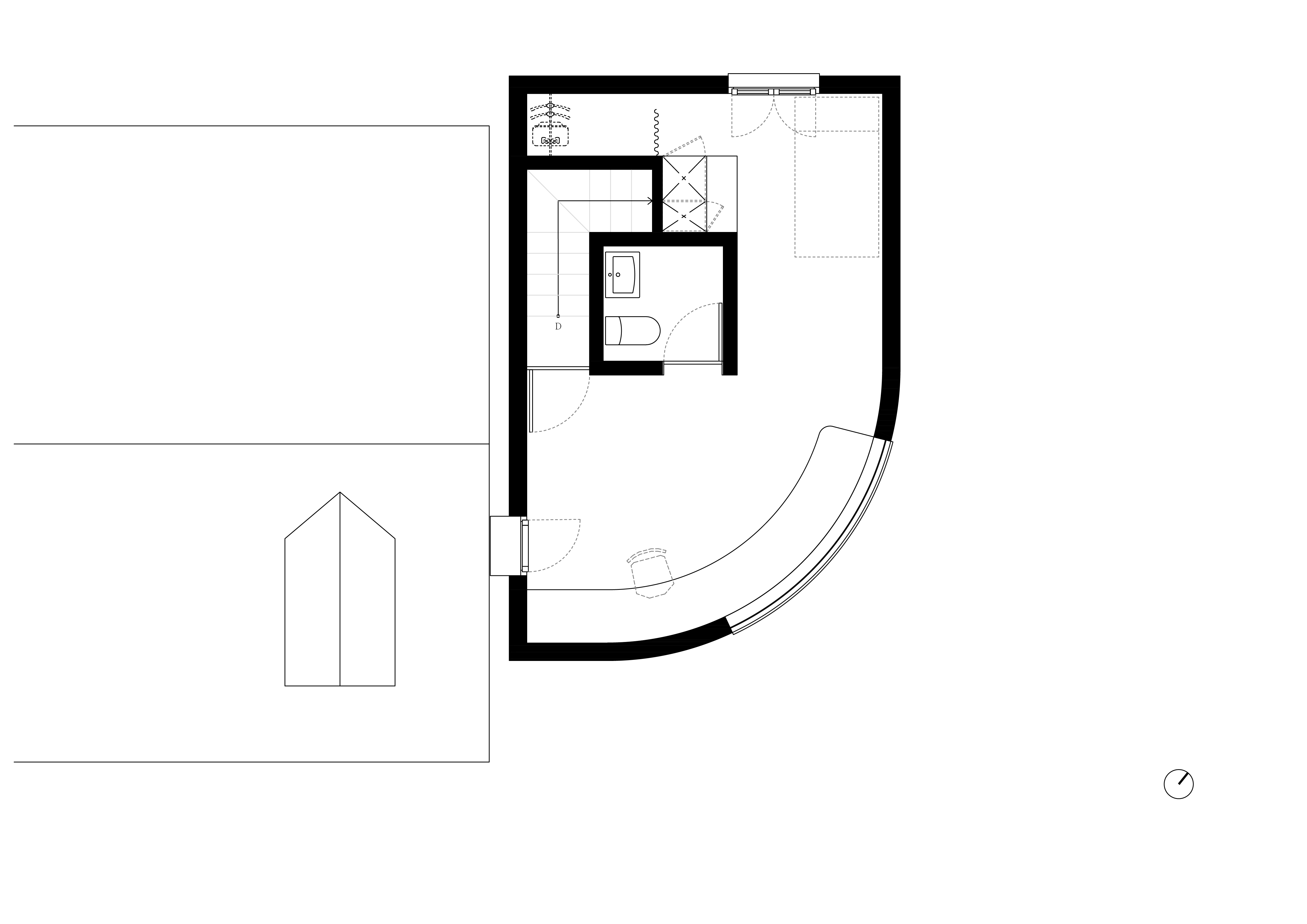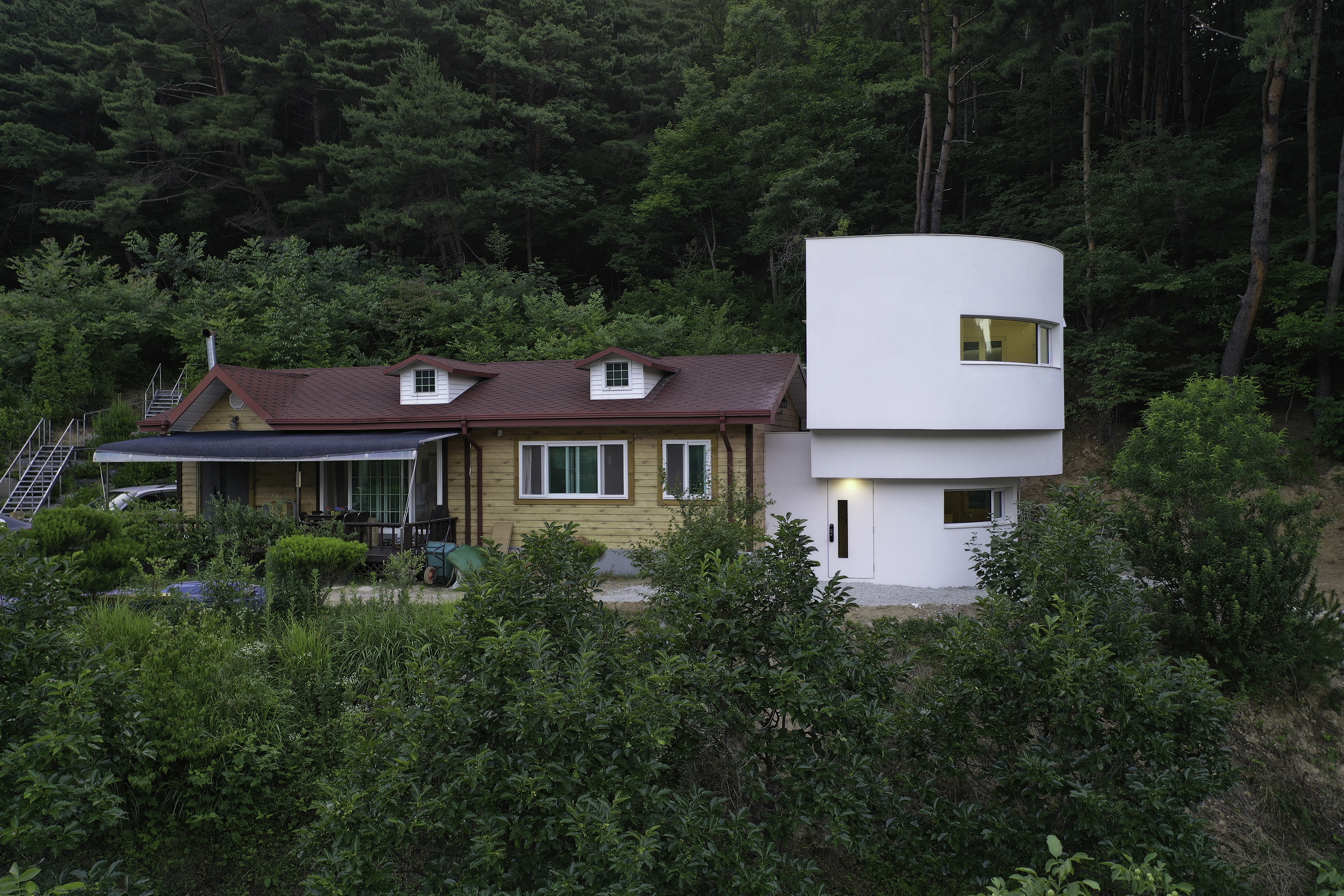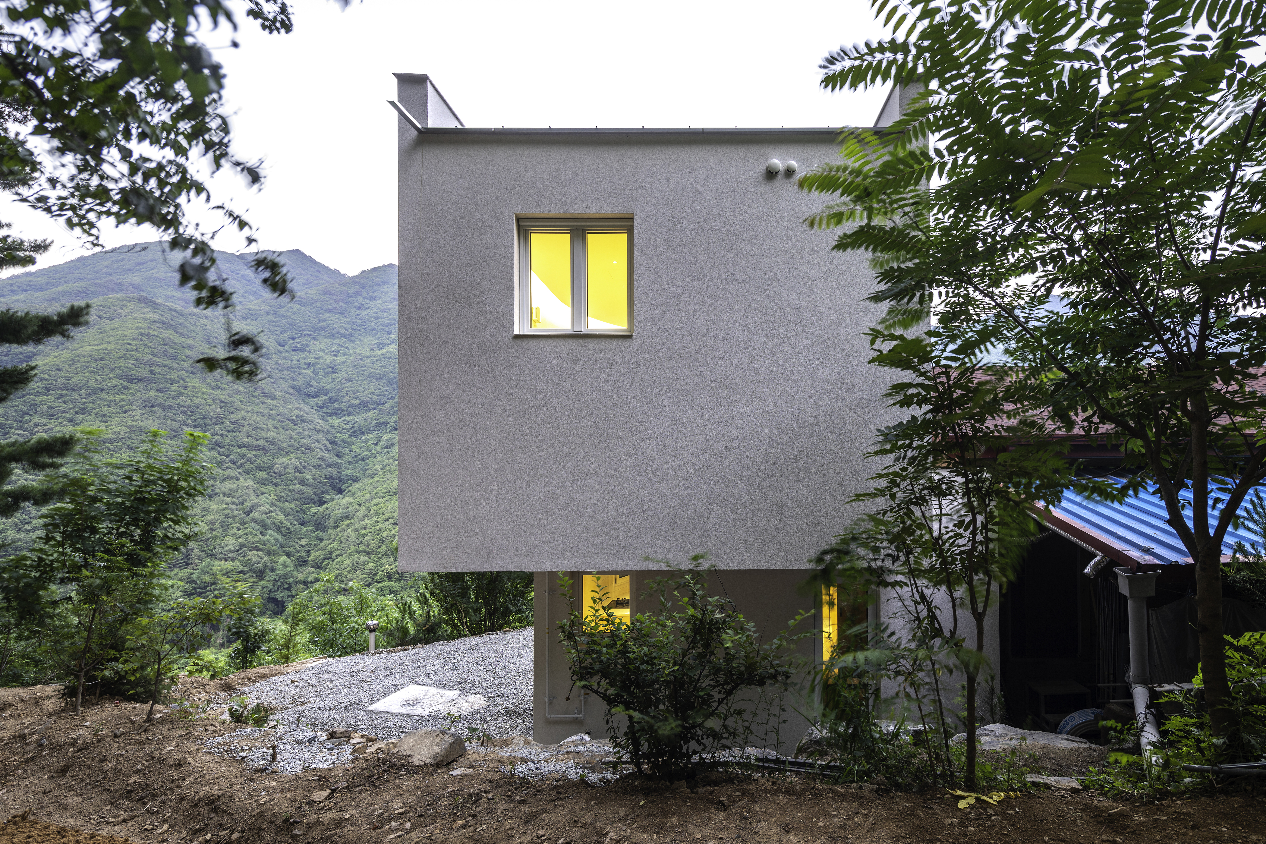 건축주는 인적이 드문 조용한 마을을 찾아 부모님과 함께 살 집을 지을 땅을 구입하고 설계를 의뢰해왔다. 진입 도로에서 60m 높이의 가파른 경사를 올라오면 산 중턱에 위치한 670m2 대지에 80m2의 농가 주택이 자리 잡고 있었다. 기존 농가 주택은 인테리어를 해서 부모님을 모시고, 본인은 옆에서 혼자 살 집을 짓기로 하고 설계를 시작했다. 새로운 주택의 계획 조건은 1층은 주방 겸 창고로, 2층은 방으로 하되 1층에서 기존 농가 주택과 연결되는 것이었다. 실내이지만 외부공간의 성격을 가지는 1층이 공유공간의 역할을 하고, 2층은 사유공간으로 사용하길 원한 것이다. 사실 처음 이 땅, 그리고 샌드위치 패널 구조의 기존 주택을 보고 어떻게 조화롭게 신축 주택과 배치를 해야 할지, 재료는 어떤 걸 사용해야 할지, 외관은 어떠한 관계성을 가져야 할지 고민이 많았다. ‘조화가 과연 가능한 걸까.’ 결국, 기존 주택과는 기능적 동선만 해결하도록 하고 신축 주택은 독자적인 외관을 가지는 것으로 방향을 설정하고 계획을 했다. 건축주는 미리 평면을 그려 배치와 규모를 가늠하고 각종 친환경 자재와 설비 자료에 대한 연구를 열심히 한 상태였다. 따라서 많은 자료를 살피고 나누며 건축주가 원하는 집에 대한 시공 기술을 함께 고민하며 진행했다. 배치 계획상 건축주가 살 신축 건물은 기존 건물의 우측 안쪽에 자리하게 되었다. 따라서 건축 가능한 면적이 30m2 이내인 작은 주택이기에 가구 위치만 바뀌어도 새로운 평면을 구성해야 했고 여러 대안을 발전해가며 건축주와 모형, 3D 모델링 자료를 주고받아 세세하게 도면을 정리했다. 부모님 사시는 농가 주택의 주방 및 다용도실을 통해 두 주택을 연결하고자 했는데, 대지 경계선과 가까우며 외부 통로까지 고려하다 보니 1층은 20m2 정도의 협소한 공간밖에 없었다. 그래서 2층은 캔틸레버 구조로 1m를 확장하여 공간을 확보하고, 곡면 벽을 활용해 제작 가구를 만들어 실용성을 높였다. 동시에 풍경을 파노라마로 볼 수 있도록 했다.