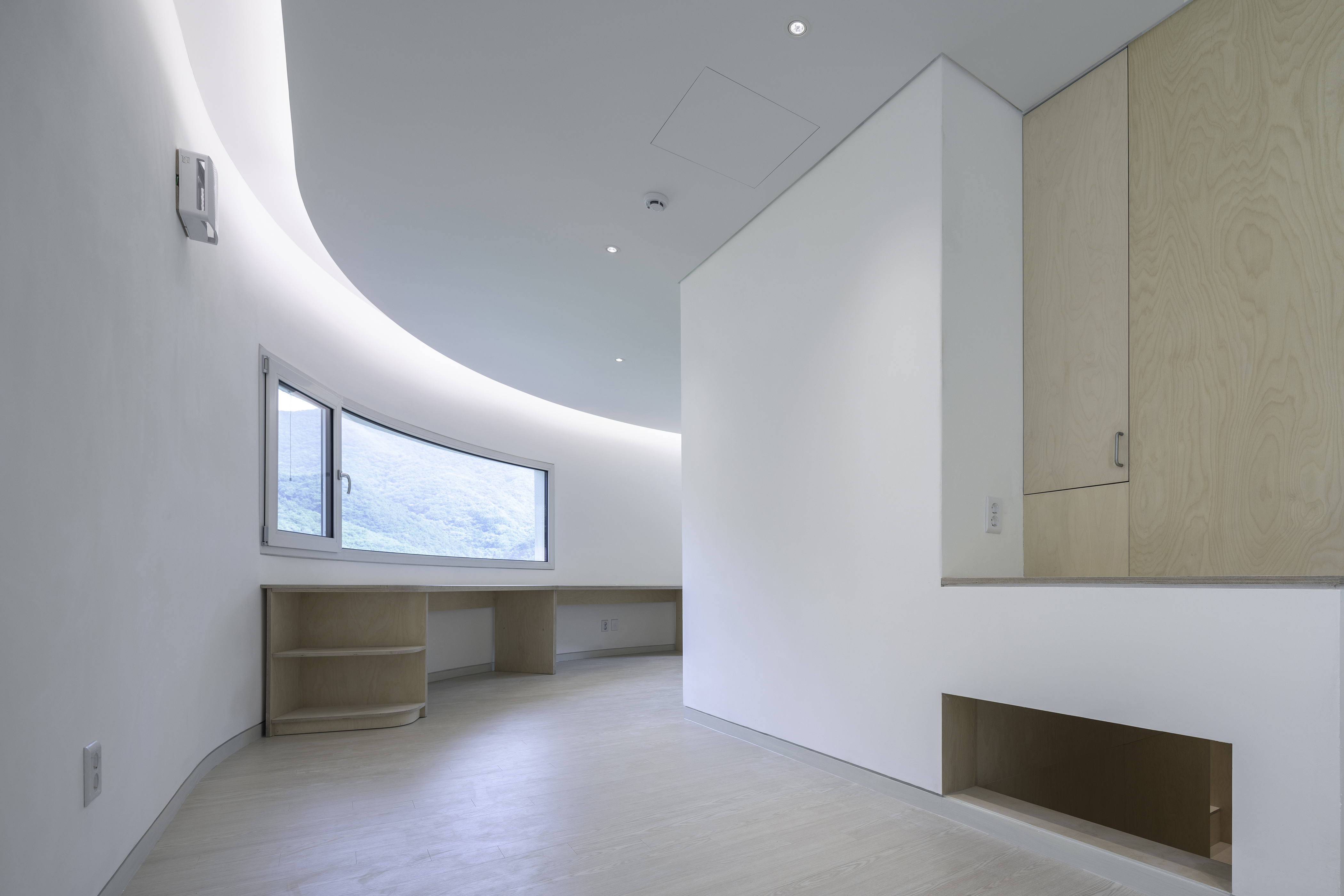 Because this house is located in the middle of the mountain, a simple construction technique was required and we had difficulty selecting the right construction company. Although the construction scale was small, we wanted a competent construction company in the capital rather than a local construction company. Finally, we met a manager of a construction company through the introduction of an acquaintance; we are still really grateful to him even after long the construction work has been completed. Selecting the wrong construction company can result in poor outcomes, even if a design is nicely worked out. Construction lasted eleven weeks. We stayed in lodgings close to the construction site, because of the mountainous location, and brought in the best technicians for each construction phase or process. As a result, the completed details were of a very high quality. For the foundations of the building, we finished the floor using reinforced concrete and applied a light weight wood framing system to the walls and the roof. After that, the roof was finished with zinc and the outer walls were finished with monocouche to neaten up the curved surface of the outer walls. When planning the internal spaces, we decided to create different atmospheres, because the first floor and the second floor have different characteristics. In the shared kitchen we laid porcelain tiles on the first floor, making them easy for the client to clean, while the walls were finished with birch. The kitchen furniture along the curved wall is made of birch so people can gaze at the outside view in front of the sink. When you go up the stairs lined with the birch walls, after taking off your shoes, you reach the spaces on the second floor. This space was finished with diatomite, which is an eco-friendly material. We installed windows in primary positions in all directions so that the occupants can look down the yard or out over the distant mountains.