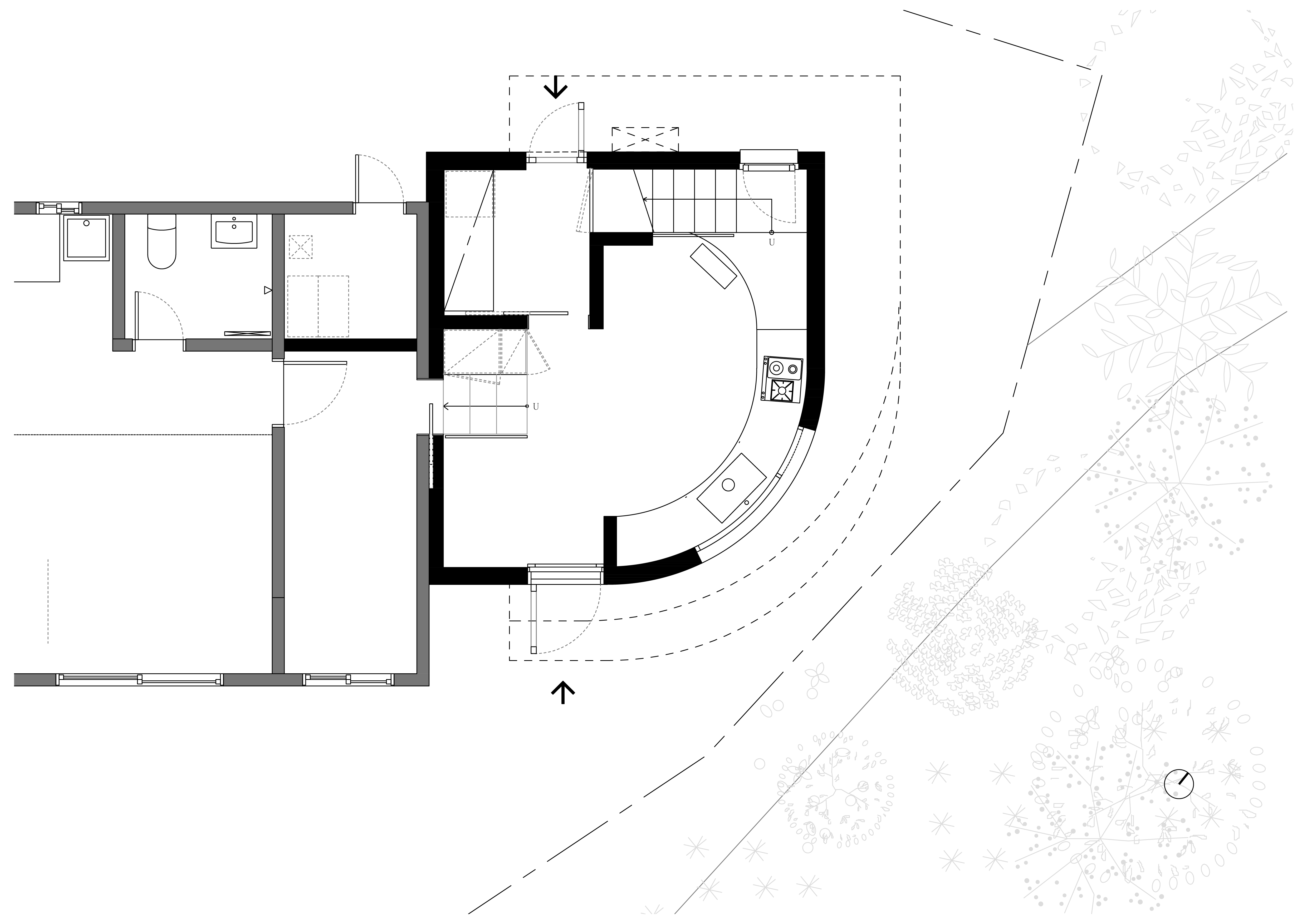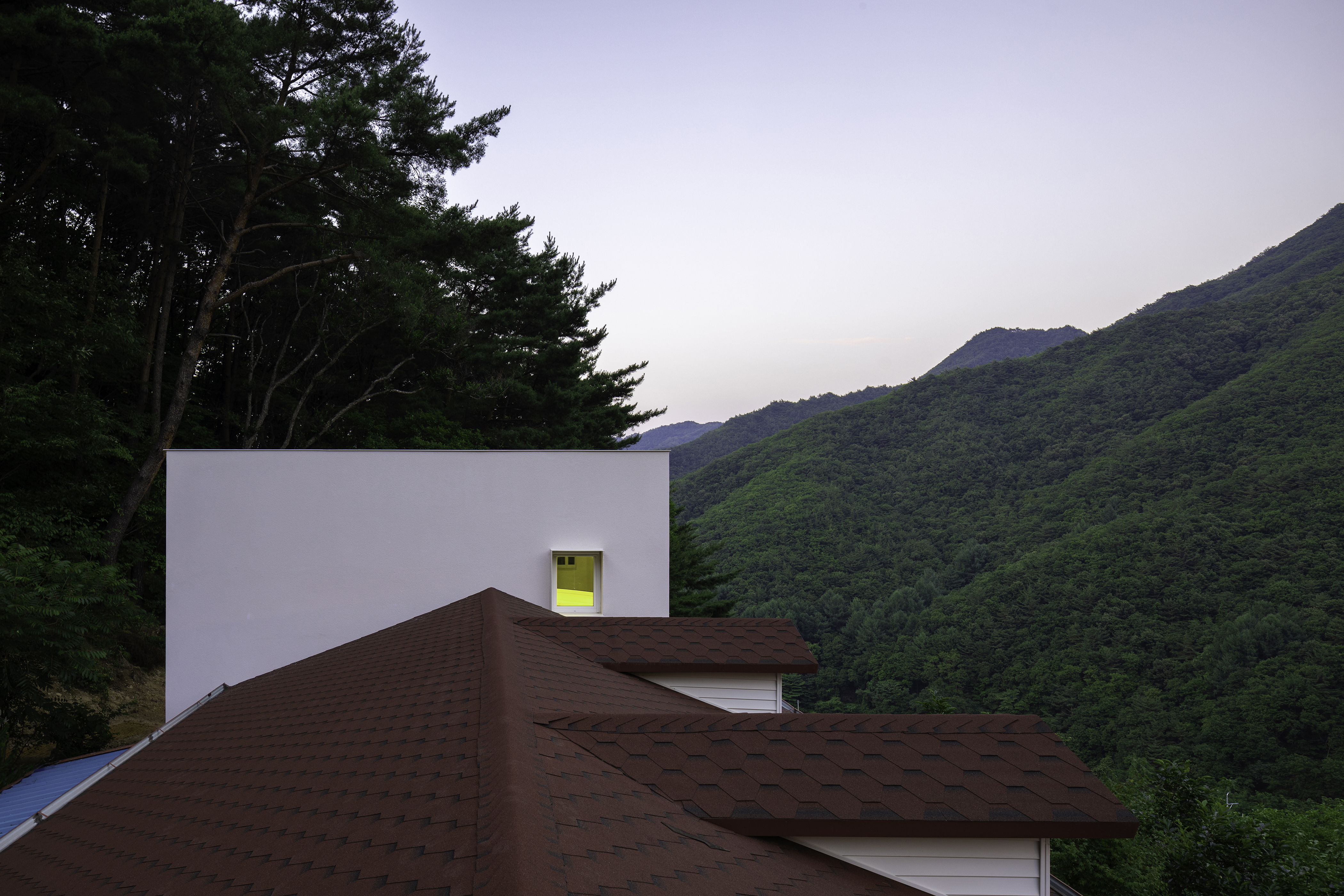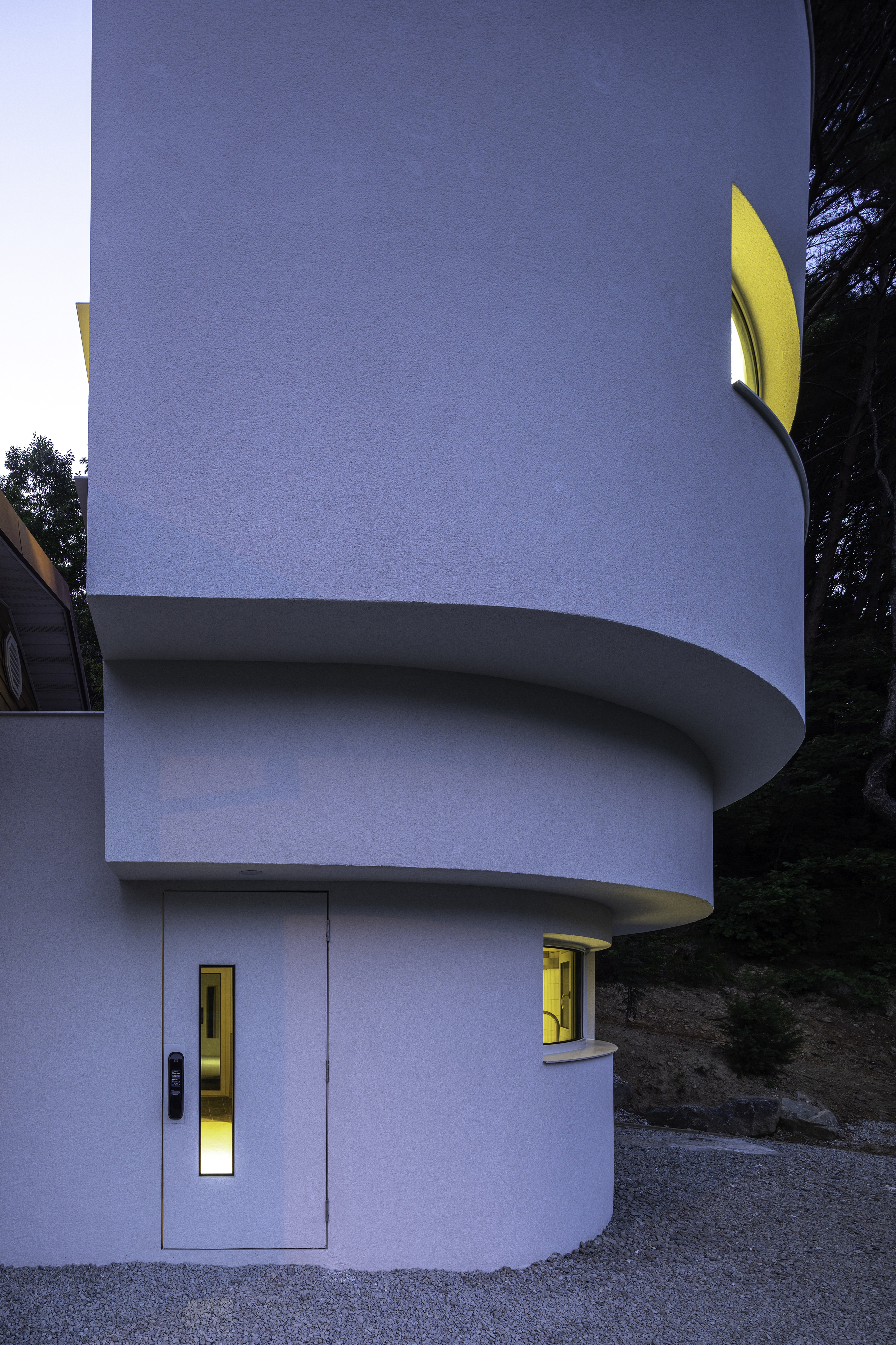 건축에서 외관을 만드는 일은 단순히 형태나 파사드를 가리키는 것은 아니고, 내부 공간과 외부 공간의 경계가 어떻게 구성되어 공간을 구축하고 있는지를 정의하는 것이다. 외부 공간과 내부 공간이 어떤 식으로 공간의 경계를 구성하고 있는지는 내부와 외부의 관계성에서 비롯된다. 이 주택의 외관은 땅의 경계로부터 빚어지고 내부 공간과 외부 공간은 곡면의 창호를 통해 관계를 맺고 있다. 대지는 산으로 둘러싸여 있으며 가을 단풍, 특히 설경이 매우 아름다운 곳이다. 주변의 풍경을 주택 내부로 끌어들이고 자연에 둘러싸인 채 명상을 즐길 수 있는 집이다. 단일한 덩어리의 집이지만 주변을 향해 부드럽게 감아 도는 외벽은 숲으로의 확장과 연계를 유연하게 받아들이는 모습이고, 반대로 내부에서 곡면 유리를 통해 바라보는 외부의 전경은 다양한 숲의 표정에 시선을 던지게 한다.