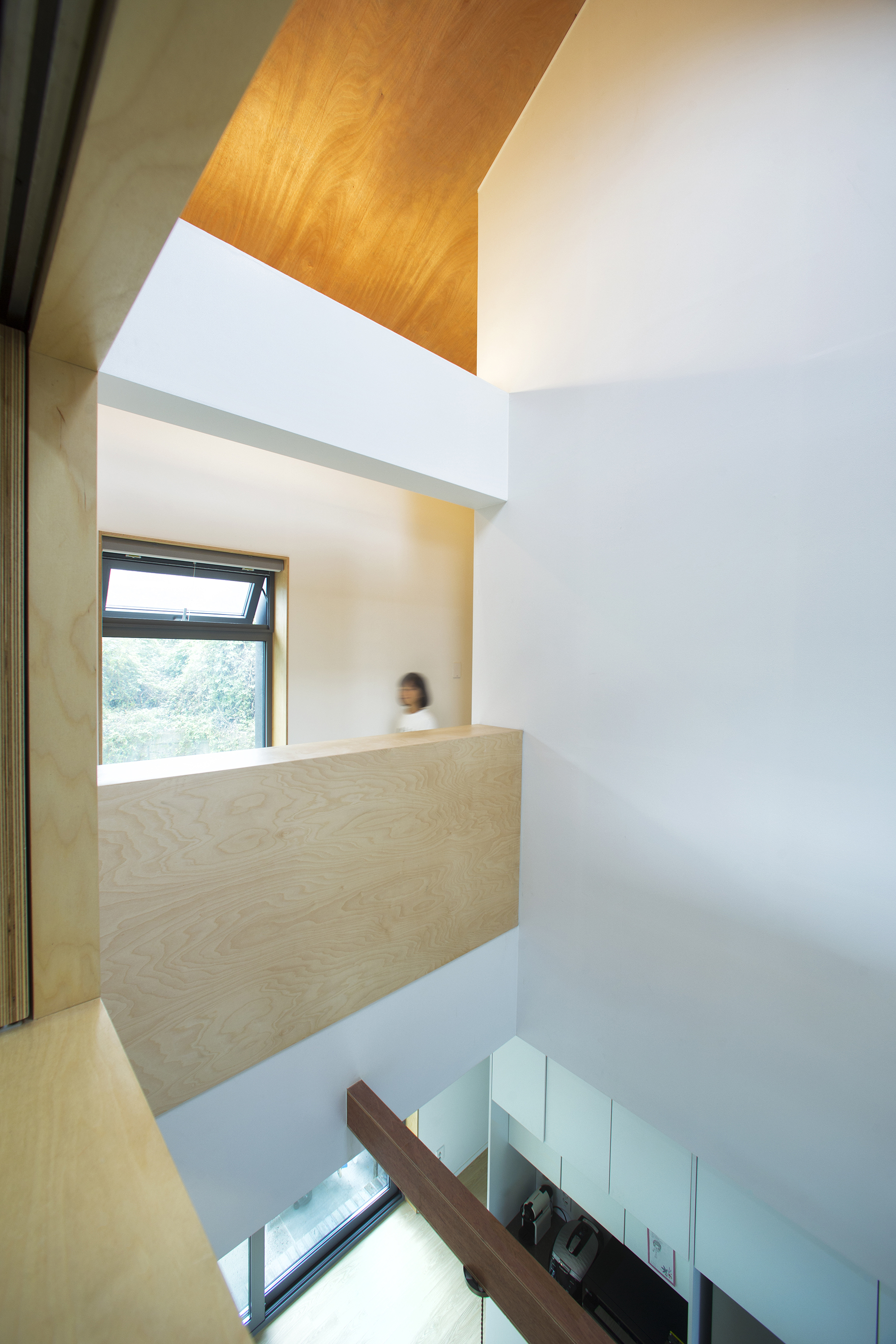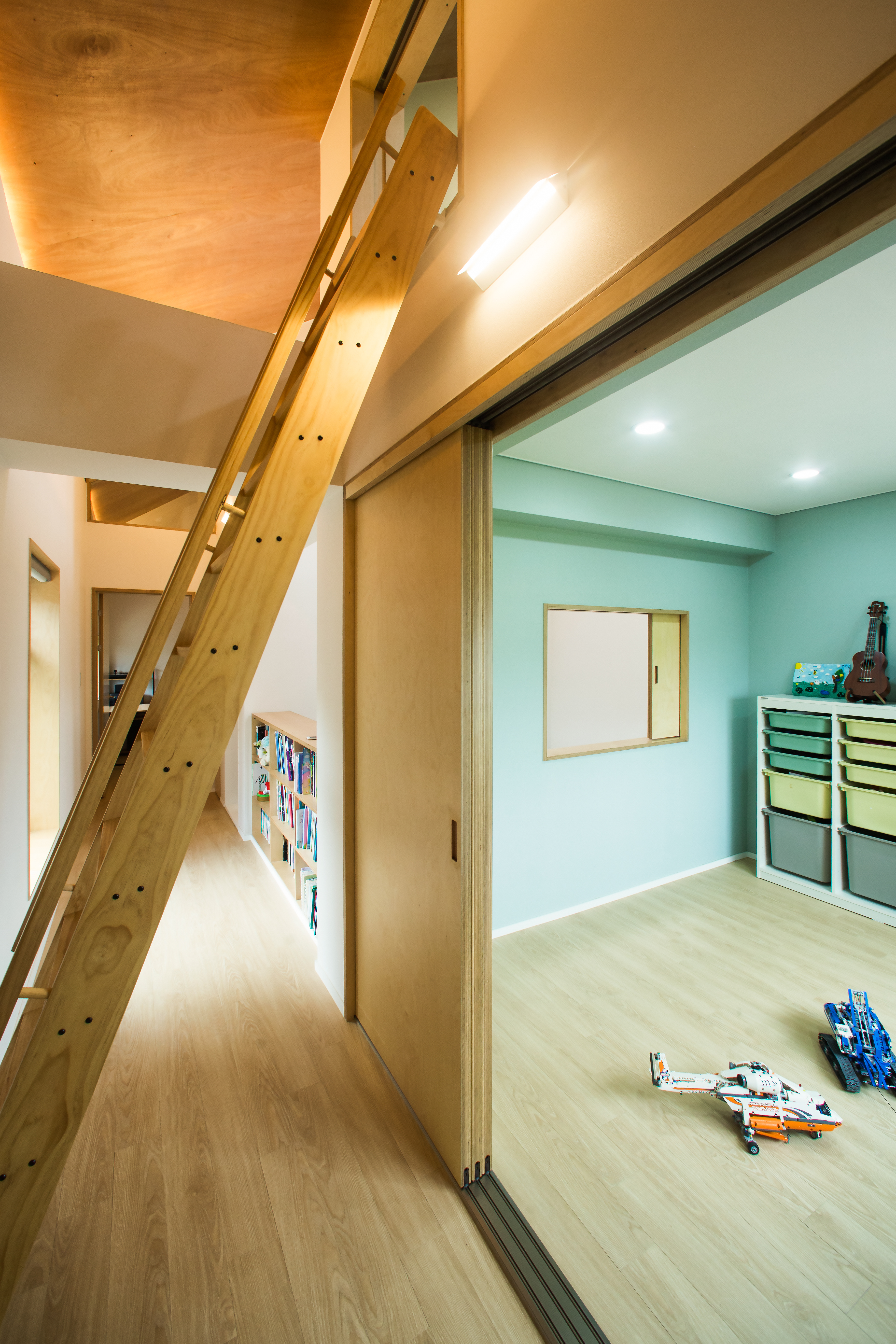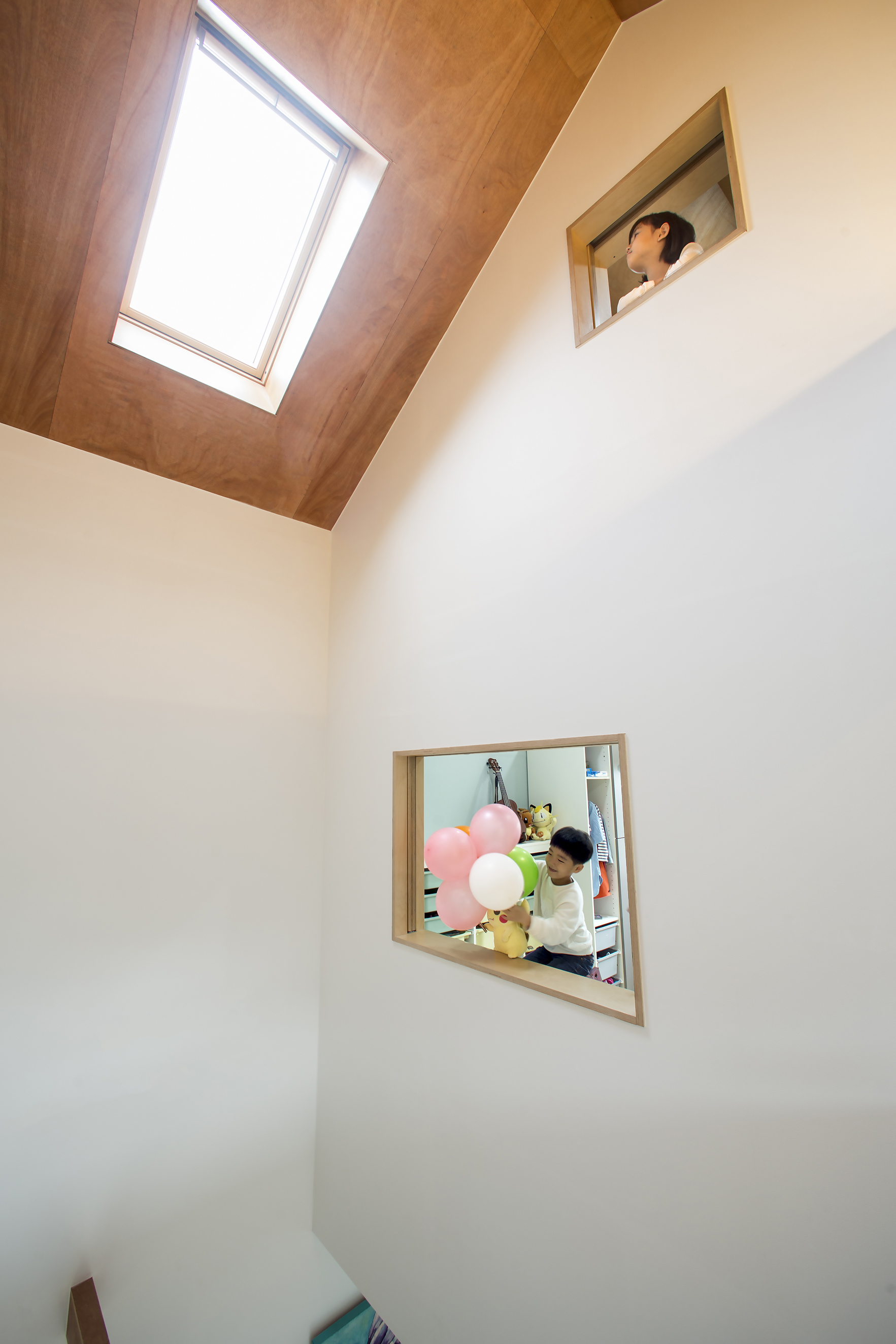 Ongi House is single-family house for a client's family with minimal living requested a cozy and tidy space. At the end of the uphill road, it was surrounded by trees and grasses without a gap and faced the ground where the outline could not be seen. A house is built on the border of landscaping stones piled up in layers right next to the road, and a height that exceeds the height of a person. There is a neighbor's house on a 4m high concrete retaining wall in the southwest, so I was worried if sun could enter the building well. The layout of the building was planned in consideration of these surrounding conditions. A large window was placed in the living room to connect with the yard so that young children could run around, and a small hideout was built on the second floor facing the stairwell. An attic was set up close to the children's room to plan a three-dimensional space for children to play. A small room for the elderly mother is located on the first floor and an independent small yard is built. By placing an atrium inside, made ventilation and lighting improved, and attempted visual communication at the same time, and we hoped it to be a space where a bond between family could be made easily. It was expected that the space would be emptied, and the warmth of the family would be filled with warm sunlight