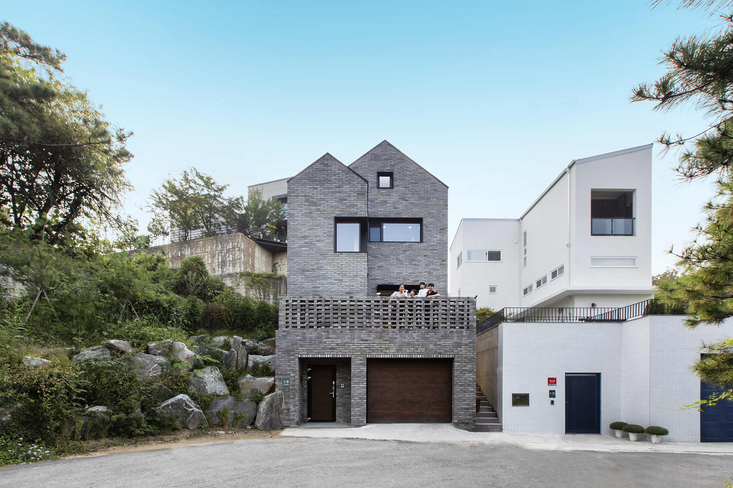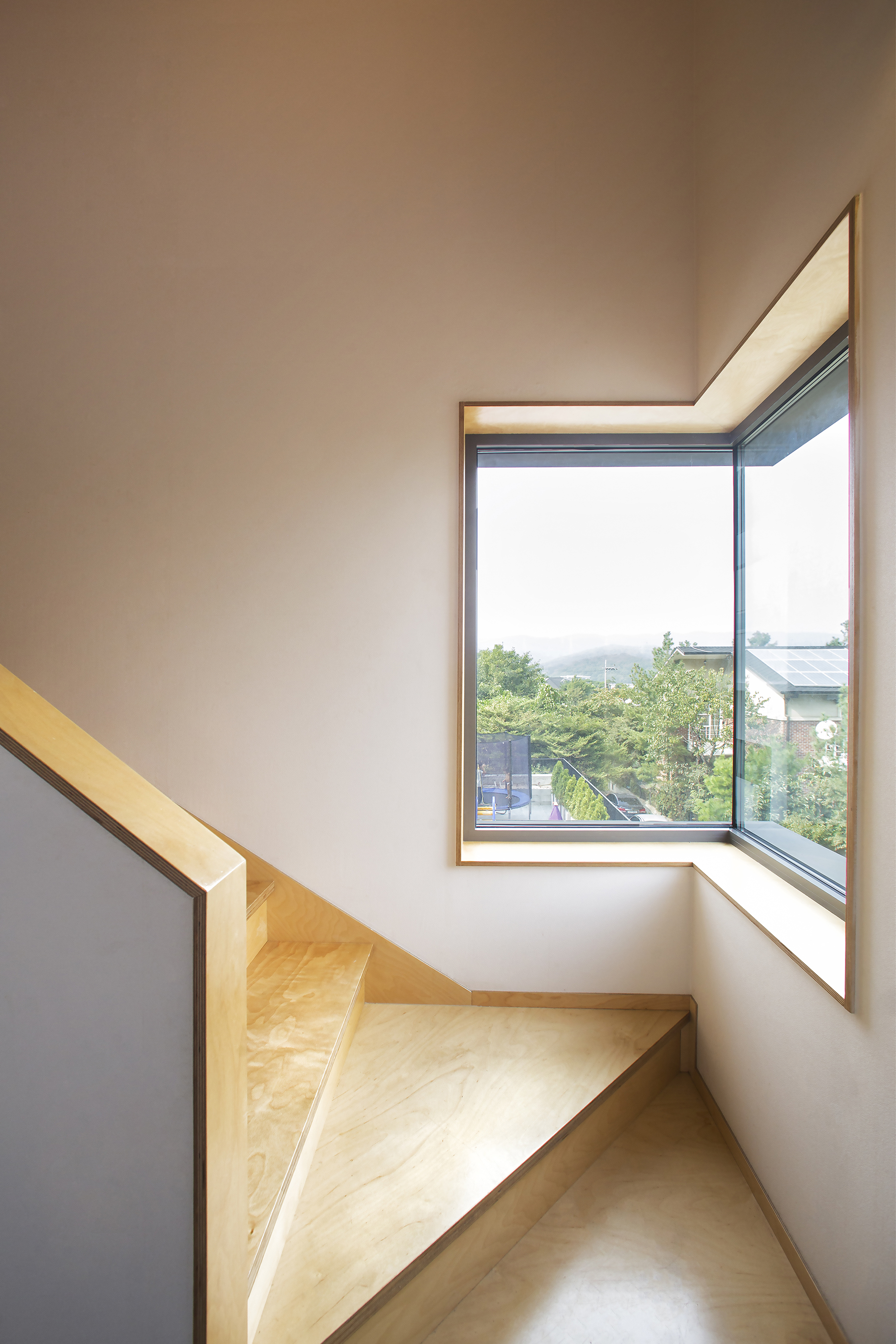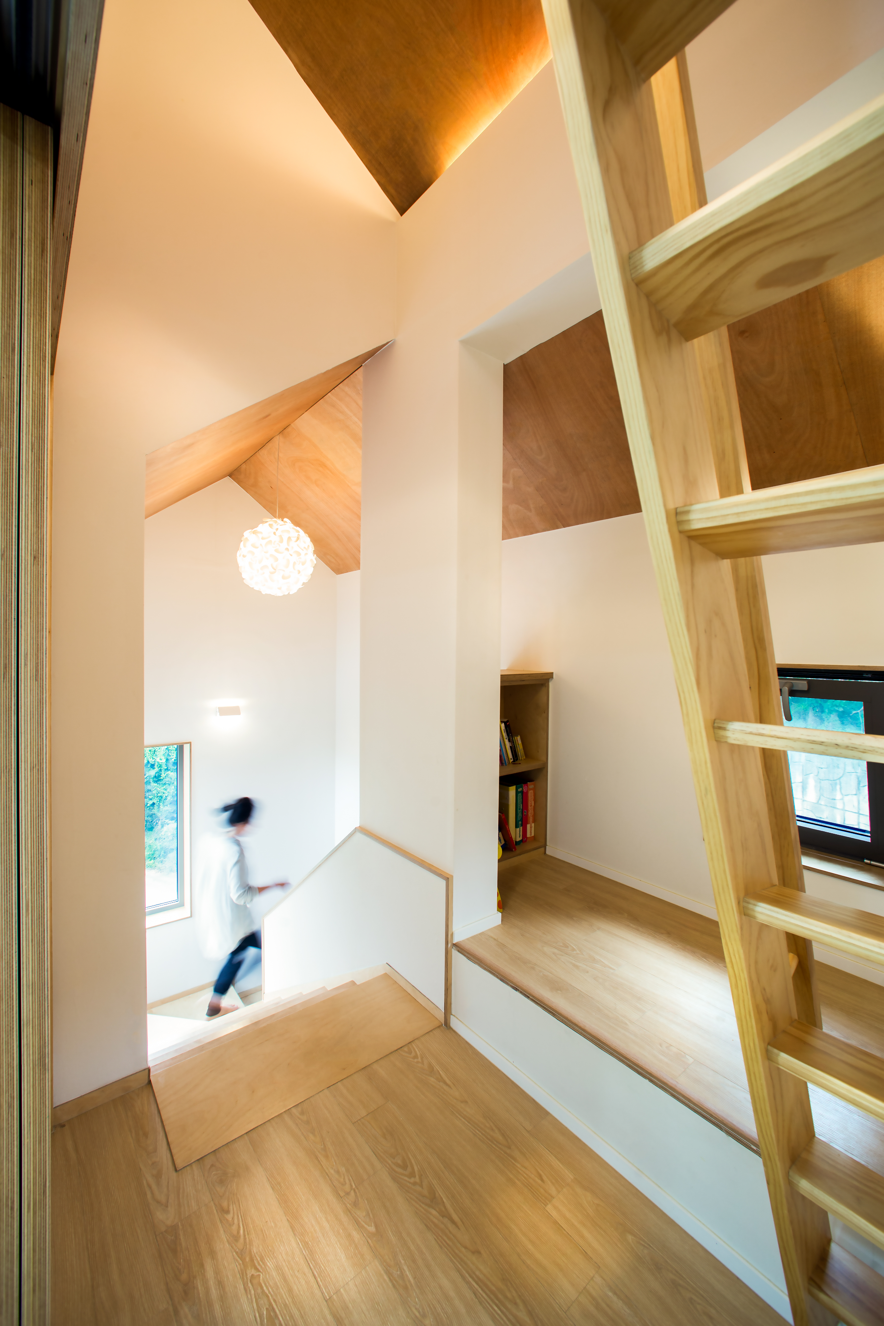 Ongi House is single-family house for a client's family with minimal living requested a cozy and tidy space. At the end of the uphill road, it was surrounded by trees and grasses without a gap and faced the ground where the outline could not be seen. A house is built on the border of landscaping stones piled up in layers right next to the road, and a height that exceeds the height of a person. There is a neighbor's house on a 4m high concrete retaining wall in the southwest, so I was worried if sun could enter the building well. The layout of the building was planned in consideration of these surrounding conditions. A large window was placed in the living room to connect with the yard so that young children could run around, and a small hideout was built on the second floor facing the stairwell. An attic was set up close to the children's room to plan a three-dimensional space for children to play. A small room for the elderly mother is located on the first floor and an independent small yard is built. By placing an atrium inside, made ventilation and lighting improved, and attempted visual communication at the same time, and we hoped it to be a space where a bond between family could be made easily. It was expected that the space would be emptied, and the warmth of the family would be filled with warm sunlight