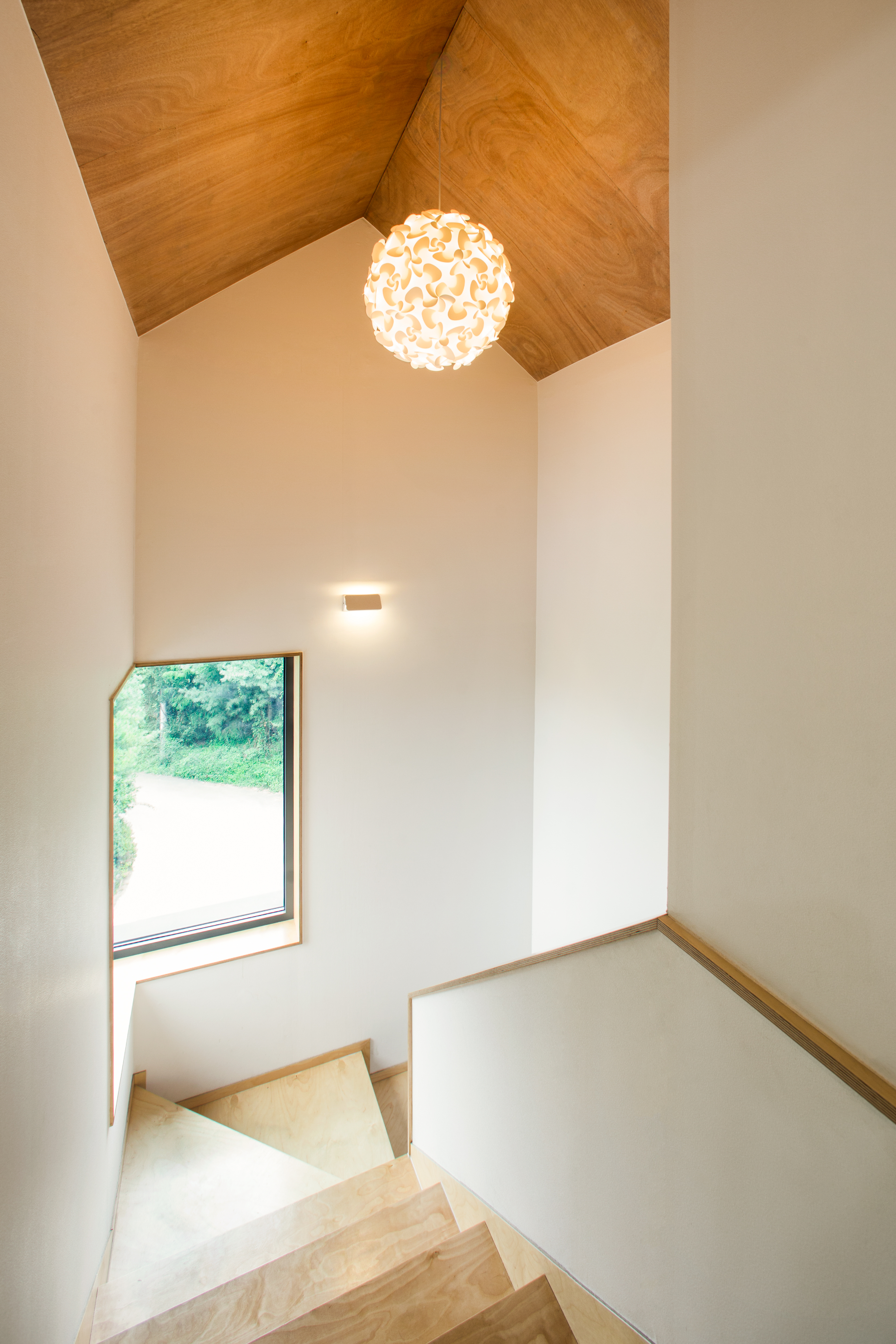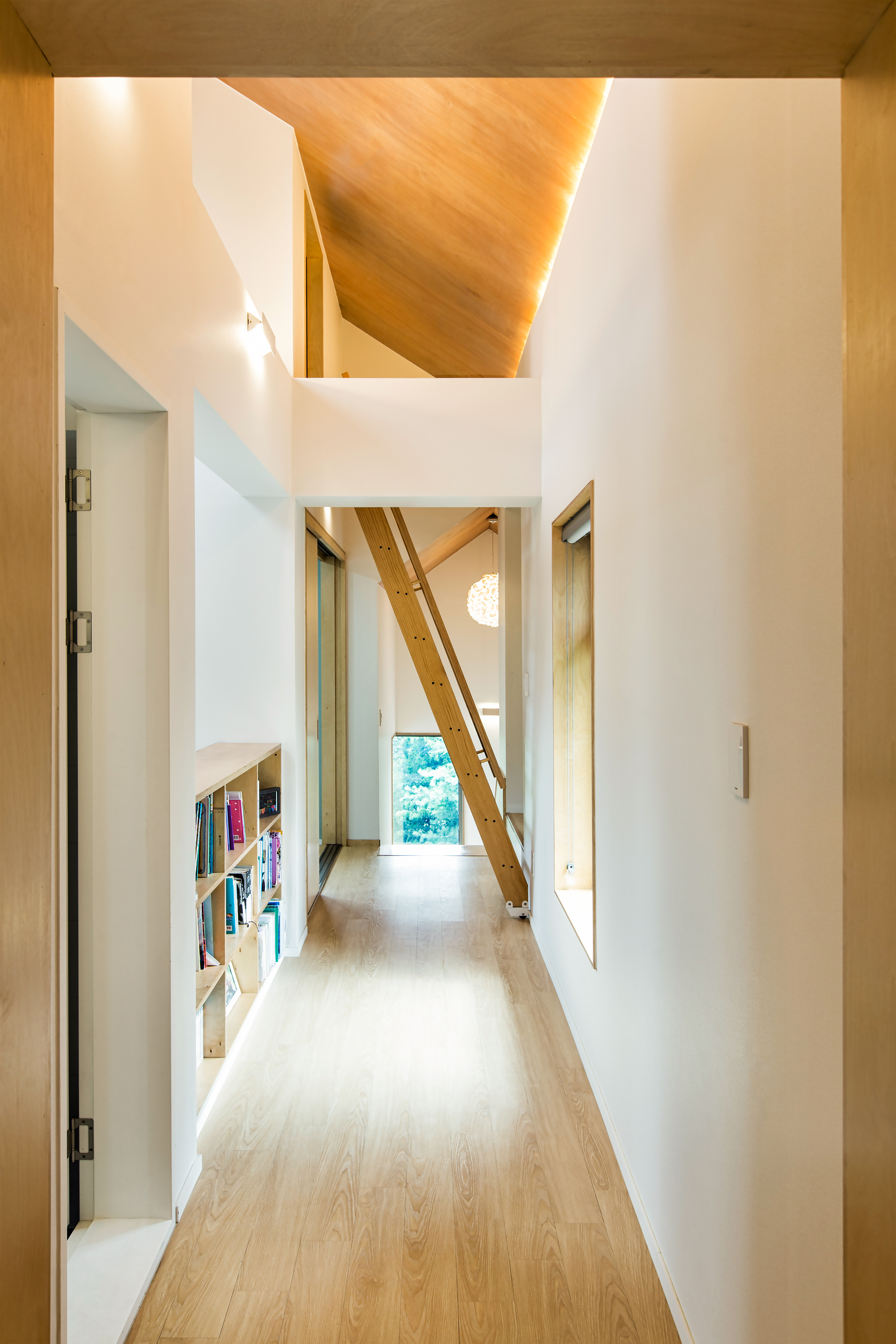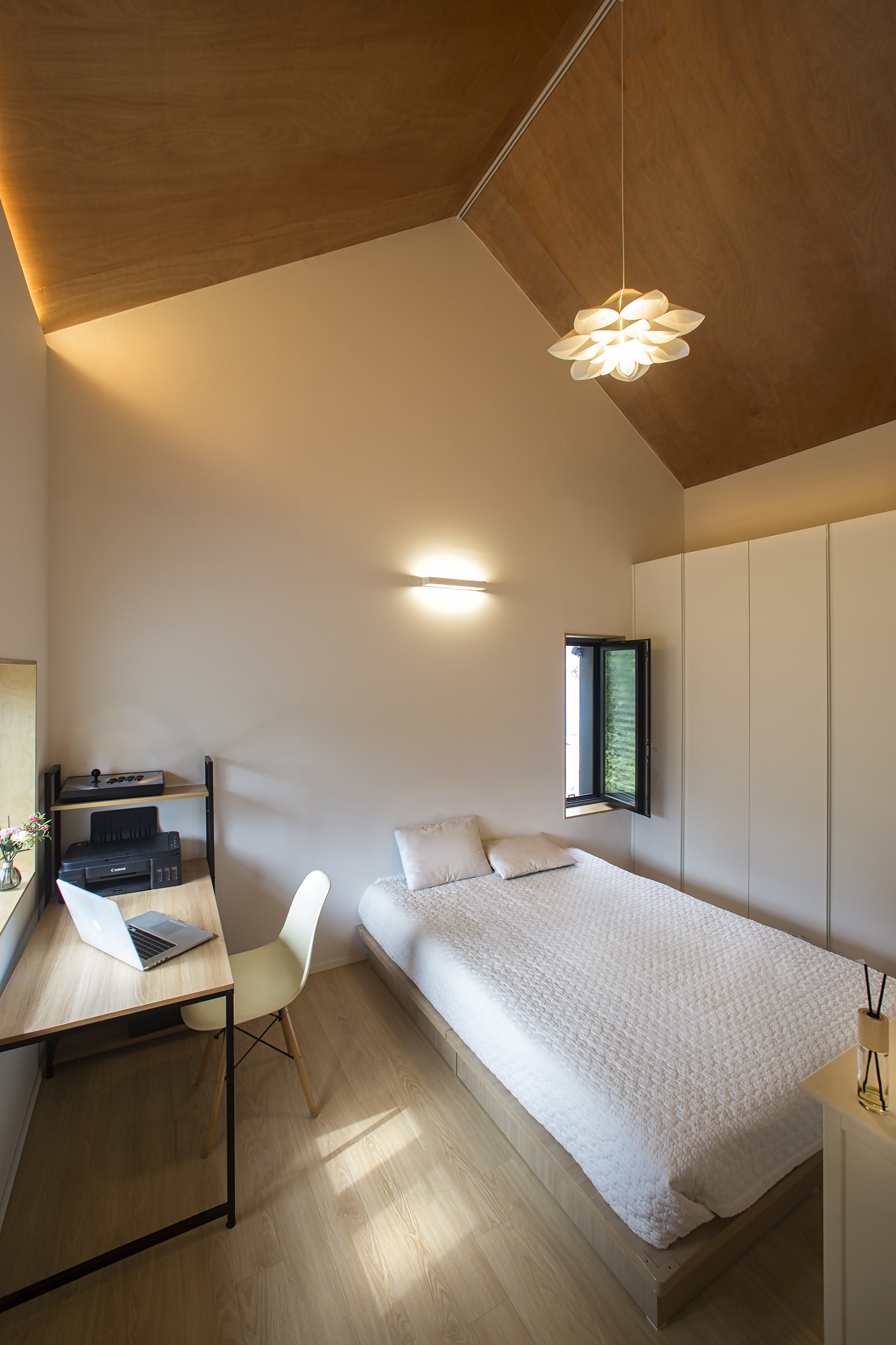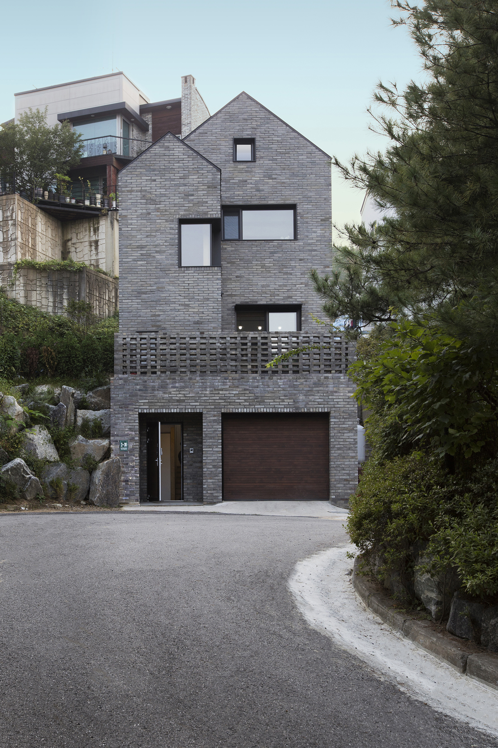 Ongi House is single-family house for a client's family with minimal living requested a cozy and tidy space. At the end of the uphill road, it was surrounded by trees and grasses without a gap and faced the ground where the outline could not be seen. A house is built on the border of landscaping stones piled up in layers right next to the road, and a height that exceeds the height of a person. There is a neighbor's house on a 4m high concrete retaining wall in the southwest, so I was worried if sun could enter the building well. The layout of the building was planned in consideration of these surrounding conditions. A large window was placed in the living room to connect with the yard so that young children could run around, and a small hideout was built on the second floor facing the stairwell. An attic was set up close to the children's room to plan a three-dimensional space for children to play. A small room for the elderly mother is located on the first floor and an independent small yard is built. By placing an atrium inside, made ventilation and lighting improved, and attempted visual communication at the same time, and we hoped it to be a space where a bond between family could be made easily. It was expected that the space would be emptied, and the warmth of the family would be filled with warm sunlight