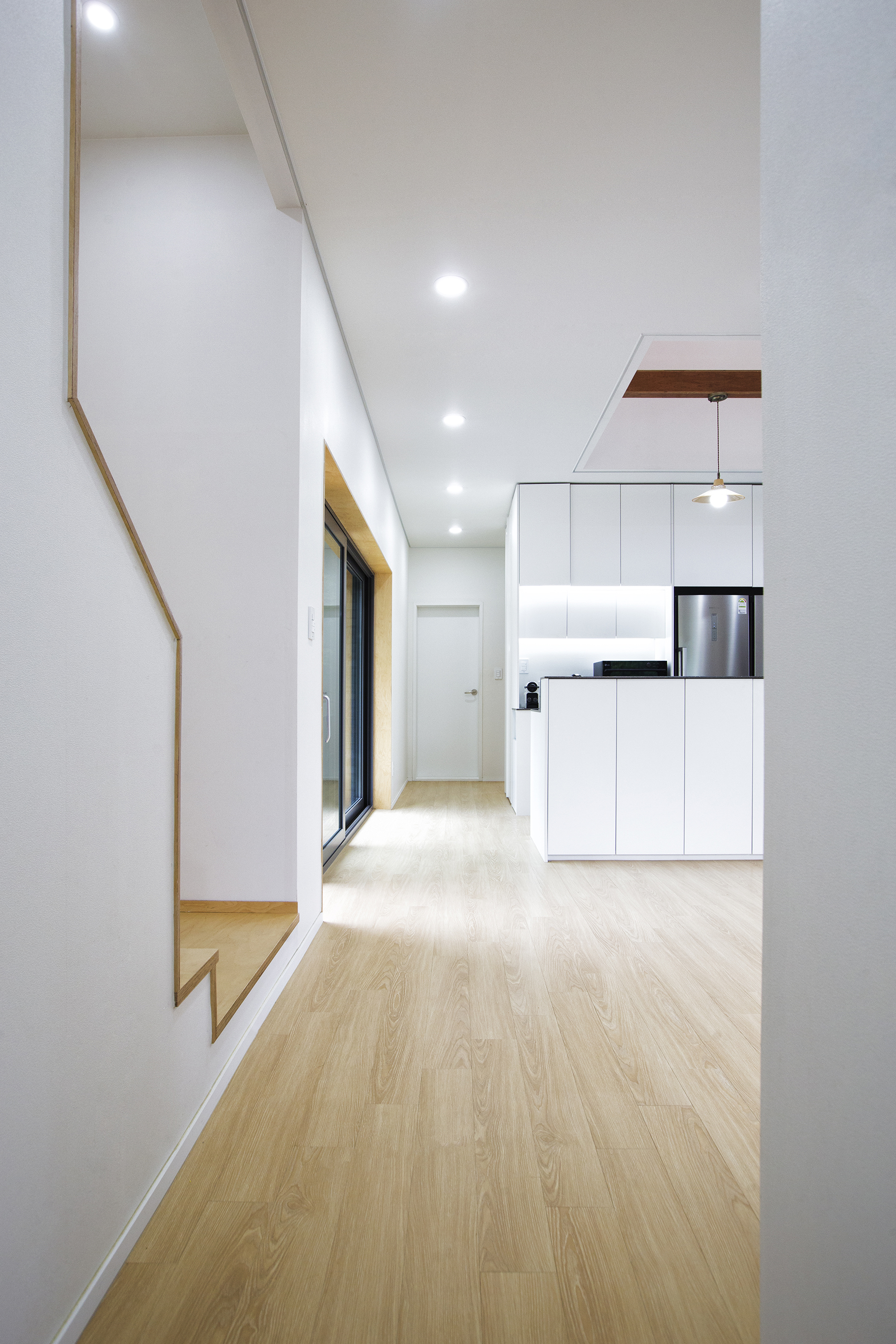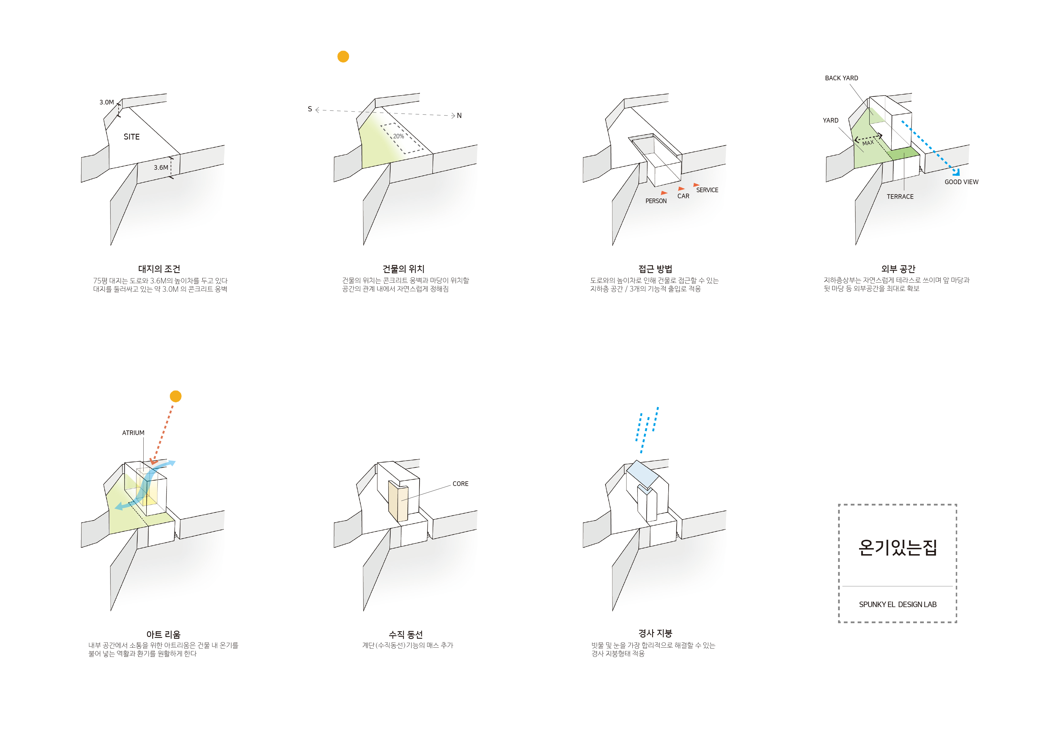 온기 있는 집은 간소한 살림의 가족이 거주하는 아기자기하고 단정한 느낌의 단독주택이다. 오르막길 끝에 나무와 풀들로 틈 없이 에워싸여 윤곽도 볼 수 없던 대지와 마주했다. 도로 바로 옆에 겹겹이 쌓여있는 조경석을 경계로 사람 키는 너끈히 웃도는 높이 위에 집이 들어섰다. 남서쪽에 4m 높이의 콘크리트 옹벽 위로 이웃집 있어 건물로 해가 잘 들지 않을까 우려했다. 건물의 배치는 이런 주변 여건을 고려하여 계획했다. 어린 자녀들이 뛰어놀 수 있게 거실에 큰 창을 두어 마당과 연결하고 계단참과 마주한 2층에 조그만 아지트를 만들었다. 아이 방과 가까운 곳에 다락을 두어 아이들이 놀 수 있는 입체적인 공간을 계획했다. 노모를 모실 수 있는 작은 방이 1층에 위치하고 독립된 작은 마당을 조성했다. 내부에 아트리움(Atrium)을 두어 환기와 채광을 개선하는 동시에 시각적 소통을 꾀하고 가족 간의 유대감을 쉽게 만들어 갈 수 있는 공간이길 바랐다. 공간을 비워내고 그 속에 따뜻한 햇살과 함께 가족 간의 온기가 가득 채워지길 기대했다.