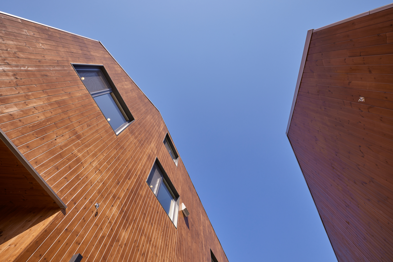 형태는 사각뿔을 사선으로 잘라서 별동을 약간 아래로 낮춘 것이다. 외장재는 지붕에서 외벽으로 같은 재료인 골강판을 사용하여 매스감을 강조했고, 두 매스 사이 절단면은 탄화목으로 따뜻한 속살처럼 표현되어 골강판과 대비된다. 경량 목구조 부분에는 거터와 선홈통을 숨기기 위해 스터드를 2겹으로 구성했다.