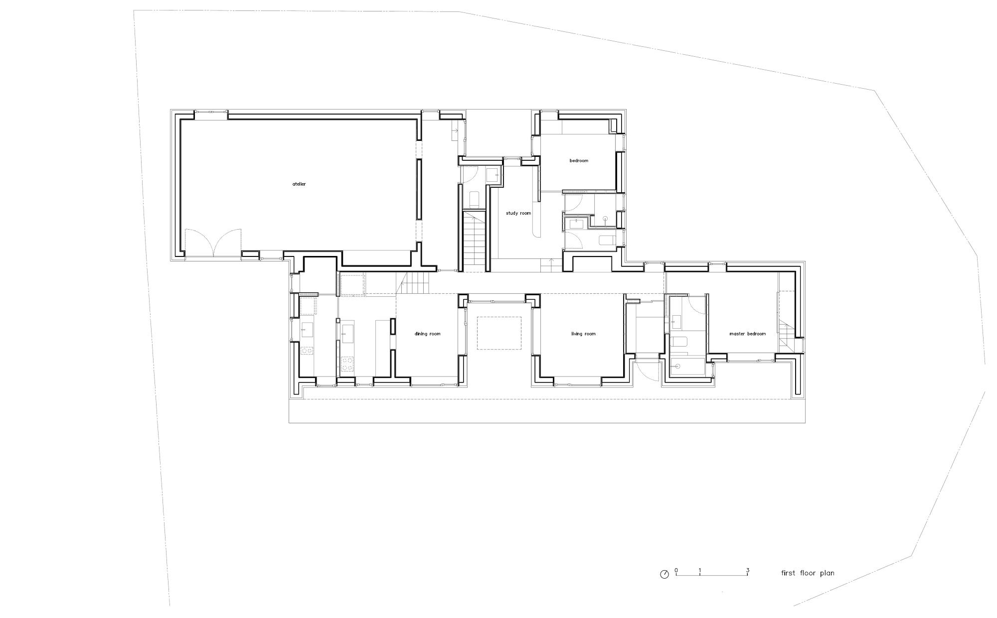 By walking up along the winding street, ‘House Jipyeong’ is situated on a land that overlooks the neighborhood with a scenery of mountains and fields. The house is designed as an atelier for a painter and a living space for her family. The house consists of two volumes that are connected lengthways. The rectangular volume that includes the high-ceilinged atelier is positioned to the back, while the gable-roofed volume, where the living space lies, is attached on the front. By making a staggered arrangement of two masses, separate entrances could be made. The floor plan of the linear type Hanok, with the kitchen, living room and bedroom assembled in a straight line, was the backbone on organizing the gable-roofed volume. The small courtyard under the gable roof with a roof-light is placed in-between the living room and the dining room.