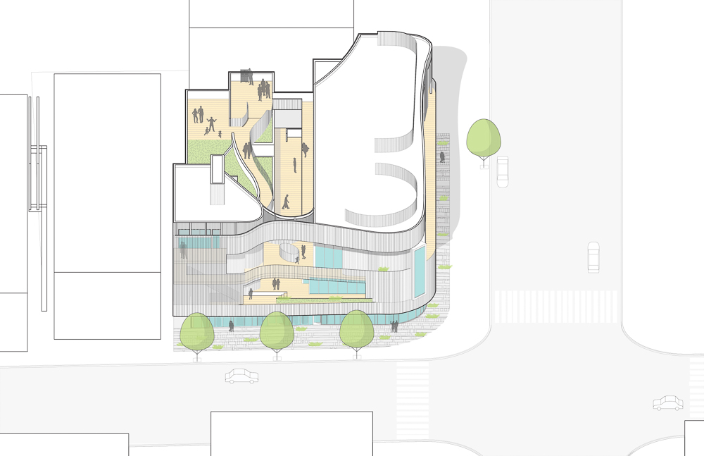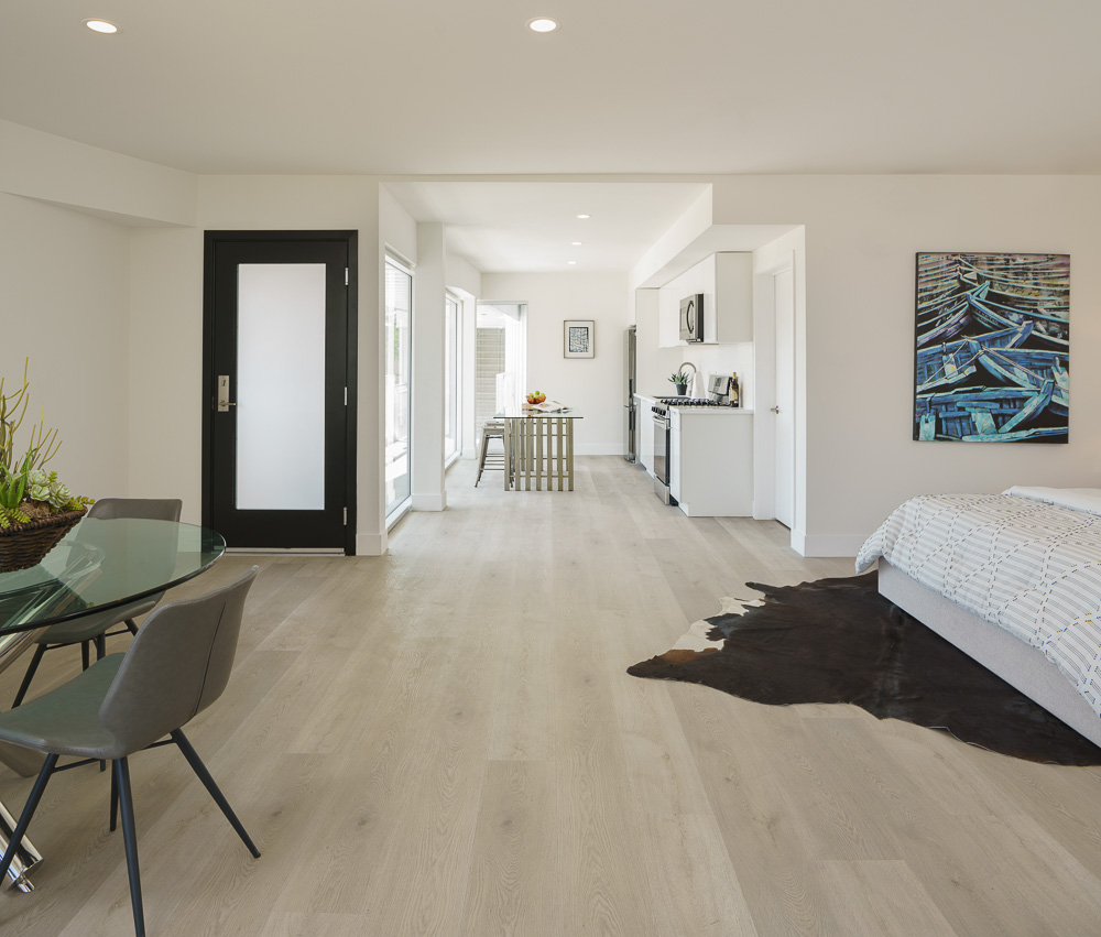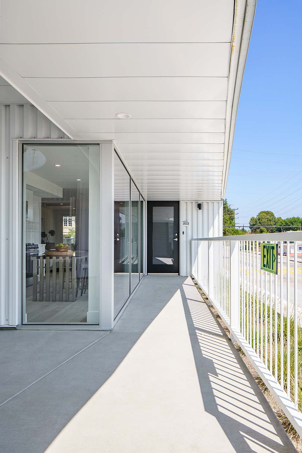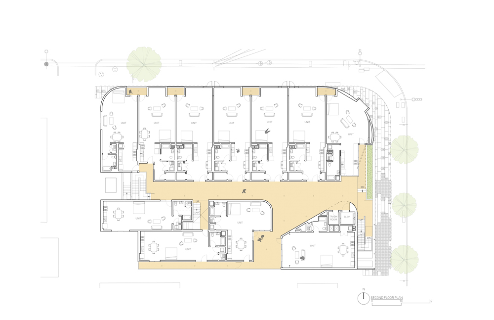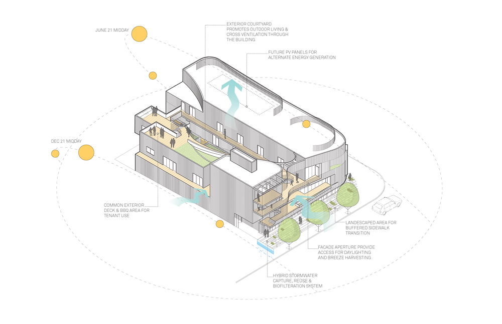 2층은 불빛으로 가득한 안마당이 거주자들에게 안정적이고 쾌적한 환경이 제공되며, 아래 도로와는 직접 연결된다. 외부 산책로는 여러 방향에서 불어오는 바람과 햇빛으로 온도조절 및 환기가 필요 없도록 했다. 넓은 유리창과 환기창은 채광을 극대화하고 건물의 성능을 높여준다. 실내 공기 질을 위해서는 배기가스를 줄여야 했다. 포름알데히드가 나오지 않는 MDF 수납장, no-VOC 페인트, 천연 리놀륨, LED 조명을 사용해 재료의 오염을 최소화했다. 이런 디테일들이 프로젝트의 질과 특성과 맞물려 비슷한 다른 프로젝트들과 차이를 만들고, 각 거주자뿐 아니라 지역사회에까지 좋은 영향을 줄 것이다.