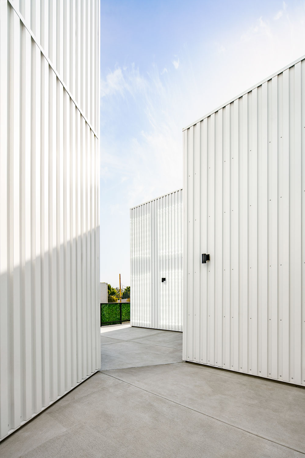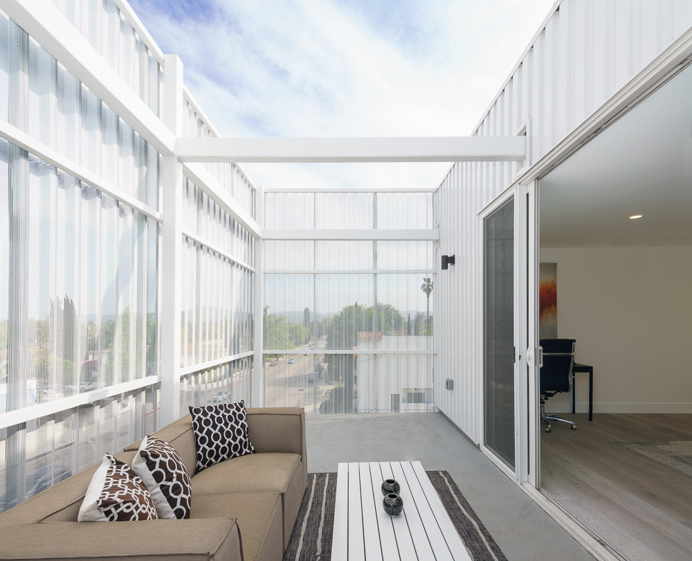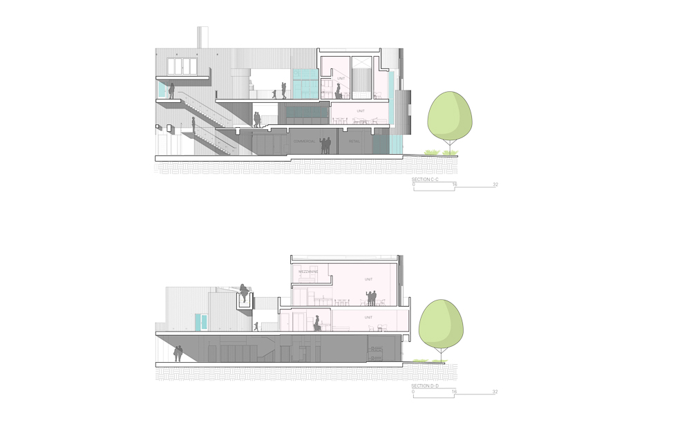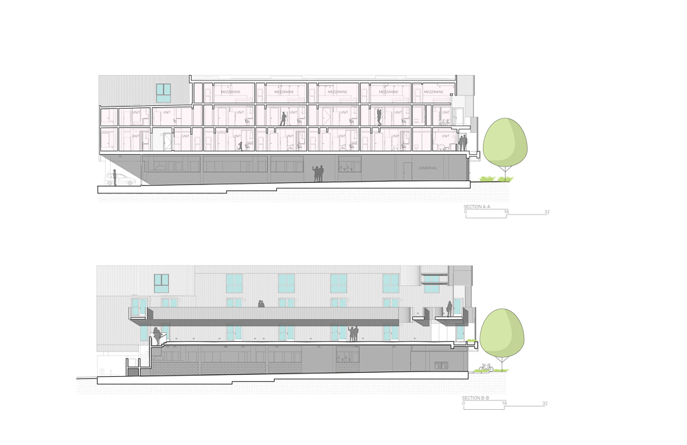 This 19-unit mixed-use multi-family building includes three stories of flats and double-height mezzanine loft apartments, as well as 1600 square feet of retail on the ground floor. The site of a former gas station has been transformed into a model for more compact, responsible urban living. The permeable layers of the perforated aluminum facade creates an ever- changing screen that sparkles in the sun and glows at night, while simultaneously providing shade to cool the building, reducing noise, enhancing privacy, and still allowing for spectacular views, great natural light and ventilation from prevailing breezes which pass through its millions of perforations. The material reappears as a strategic arrangement of screens on the east, west and north-facing walls, lending a subtle rhythm to the exterior circulation while filtering direct sunlight thru the facade. This lends unexpected visual depth, enhancing the structure’s geometric texture. Its unique architectural form and integrated function creates a high-performing building that is an expression of the people who live there and the environmental and cultural context in which it is built.