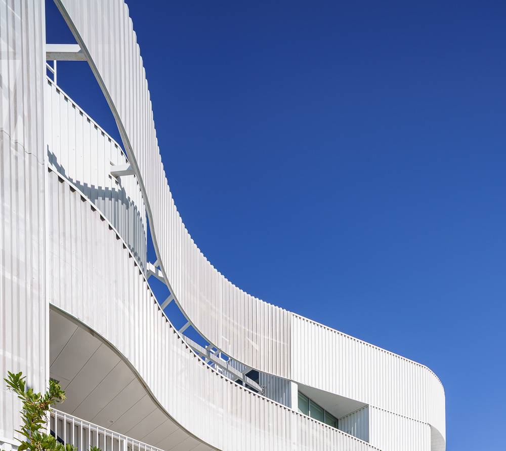 외관의 타공된 알루미늄판은 햇빛을 통과시켜 한낮의 태양 아래에서 반짝거리고, 밤에는 빛이 새어나와 외관을 끊임없이 변화시킨다. 동시에 그늘을 만들어 건물의 열을 식히고 소음을 줄여 사생활을 보호한다. 수백만 개의 구멍은 자연채광을 가능하게 하고, 바람을 통과시켜 환기를 가능하게 하면서도 여전히 멋진 전망을 보여준다. 동쪽과 서쪽 그리고 북쪽 벽에 패널을 전략적으로 배치해 외관에 미묘한 리듬을 주면서 파사드를 통해 직사광선을 차단한다. 또한, 예상치 못한 깊이감을 제공하여 건물의 기하학적인 모습을 강조한다. 독특한 건축적 형태와 합쳐진 기능은 그곳에 사는 사람들과 건물이 지어진 환경적, 문화적, 맥락을 표현하는 고성능 건물을 만든다.