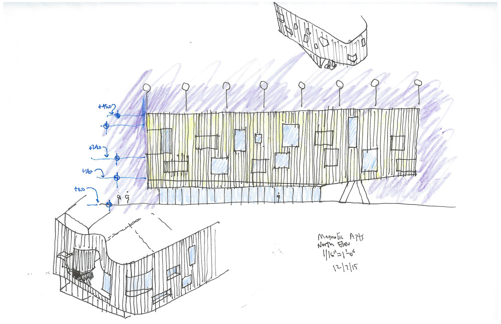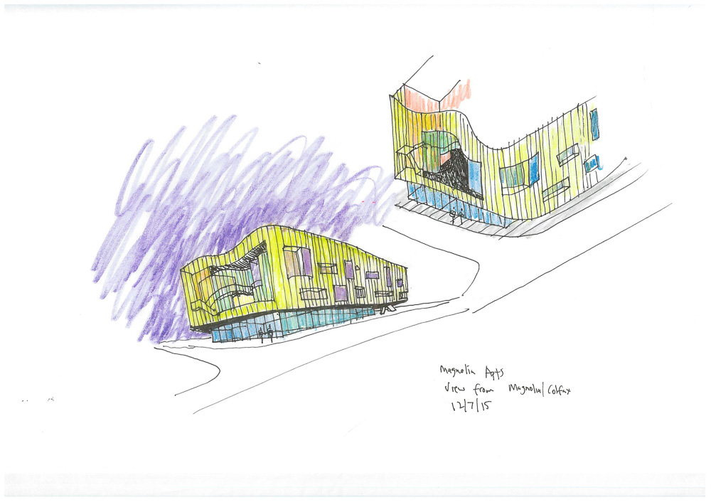 '마그놀리아 힐 공동주택'은 19개의 유닛으로 이루어진 복합 다가구 건물로, 주택은 복층과 단층의 아파트가, 1층에는 48평 정도의 상점이 있다. 주유소가 있던 자리에 지어진 마그놀리아 힐은 보다 컴팩트하고 책임감 있는 도시 생활을 위한 모델로 재탄생했다.