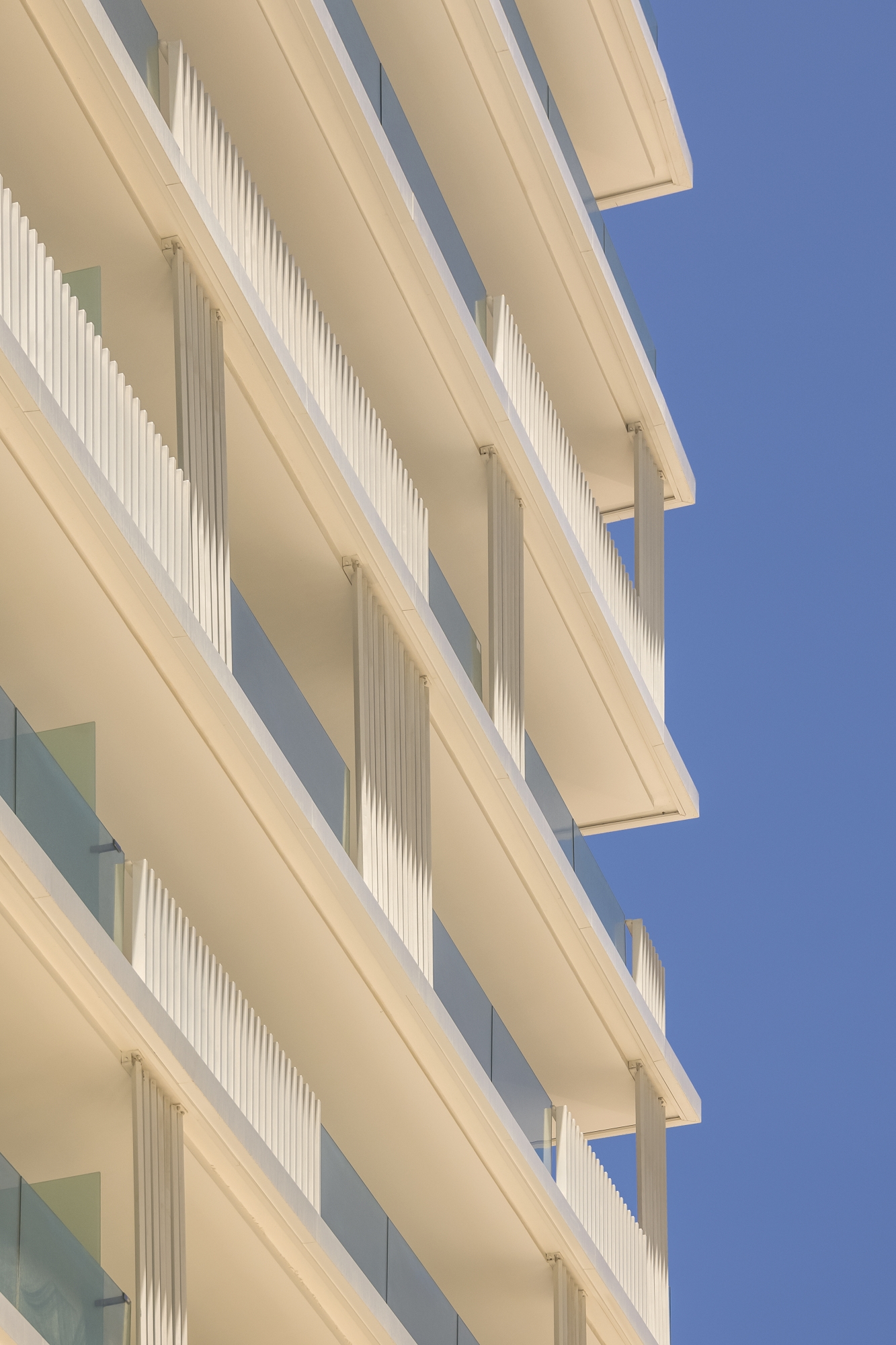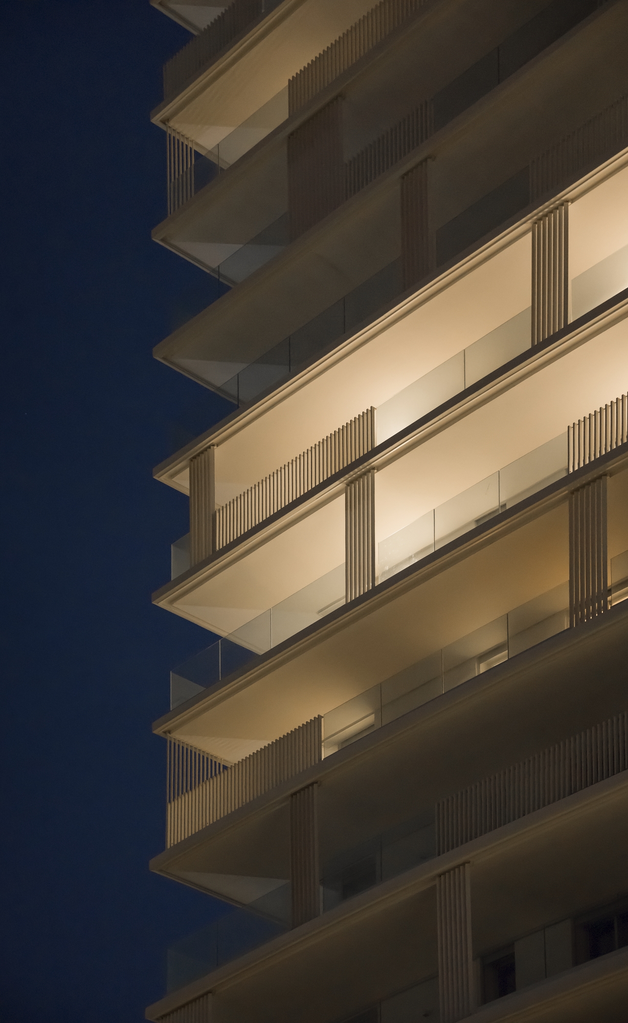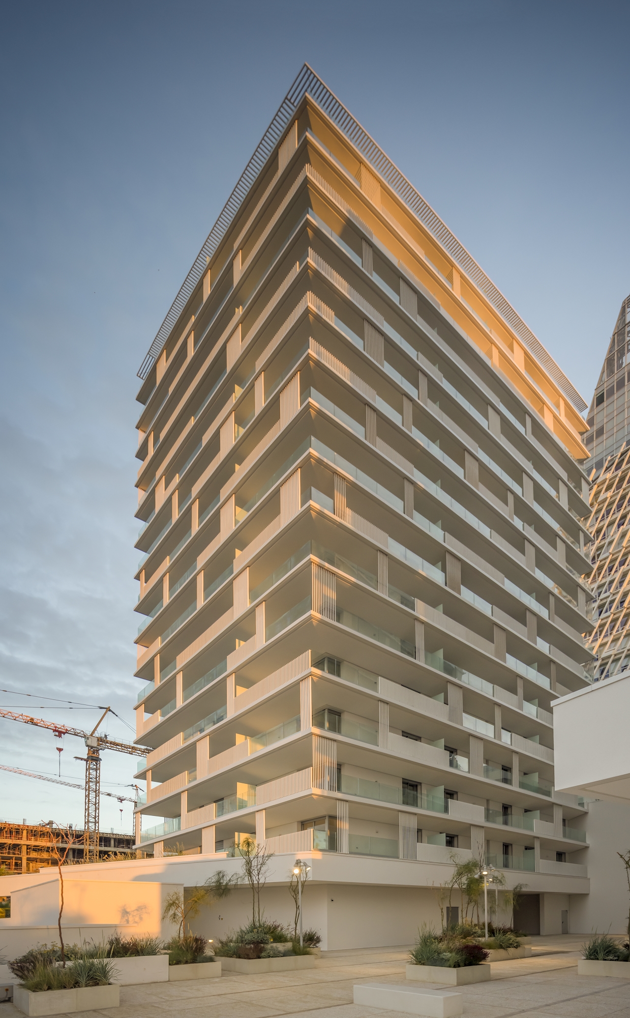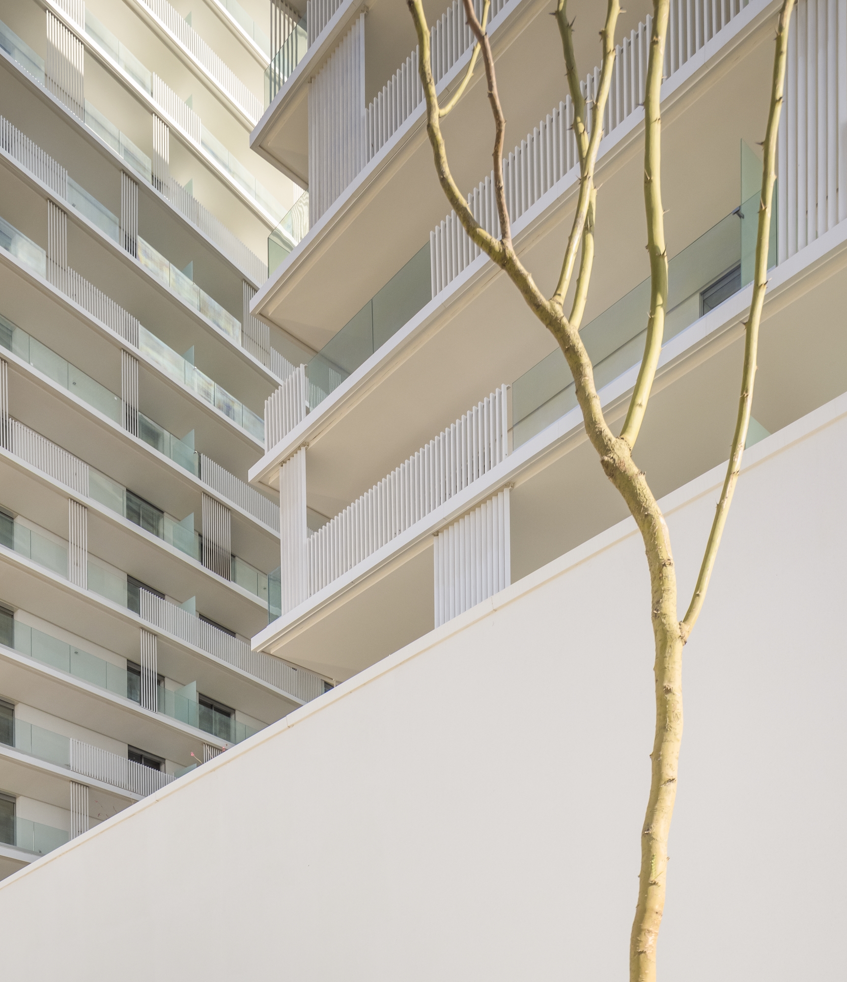 These terraces are not projected onto the void, but benefit from vertical screens, relatively concentrated at the level of the bedrooms and widely spaced at the level of the reception areas. These ≪ claustras ≫ make it possible to occasionally offer areas protected from sunshine, looks, and the wind while leaving a semi-transparency. They also make it possible to draw a protective “line” which outlines the periphery line of the various apartments and reinforces the feeling of interiority. This skin, white in color, will play with the effects of natural light to adapt to the ambient light, thus creating a vibrant facade depending on the time of day. The interplay of the balcony railings, in glass or white vertical carpentry, creates a specific pattern, a sort of modern “calligraphy” which gives the project its graphic expression.