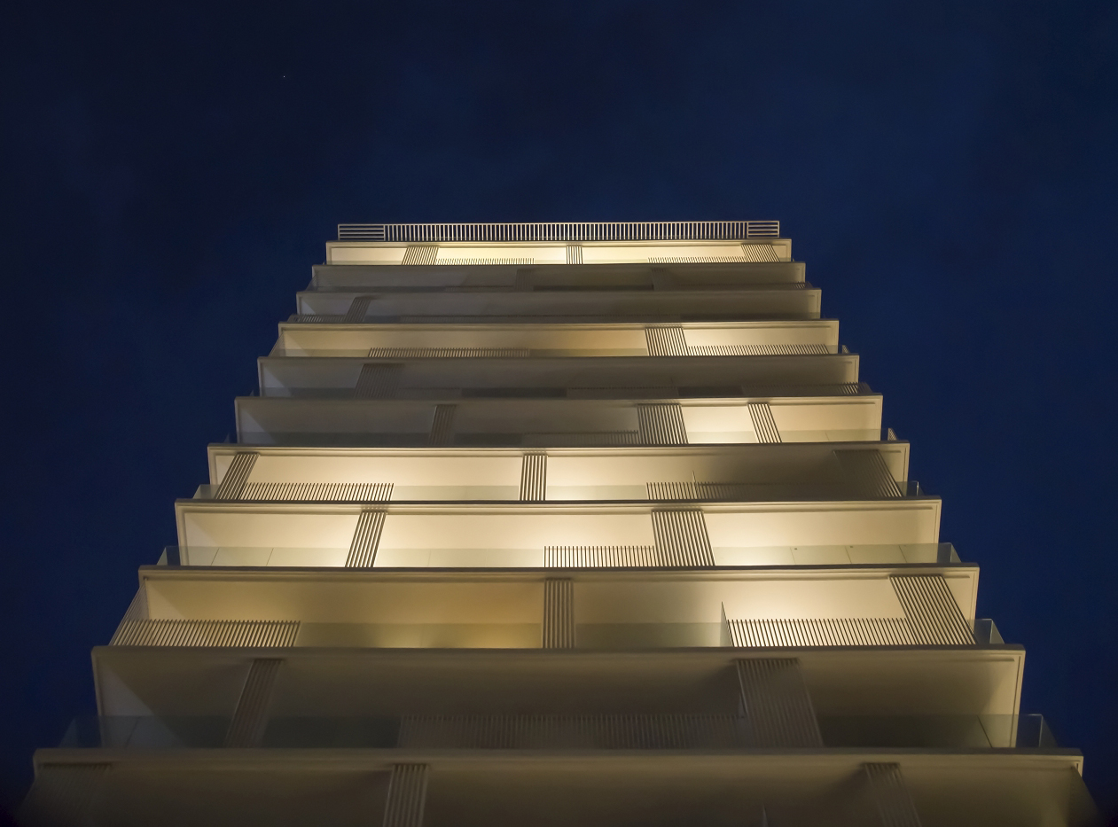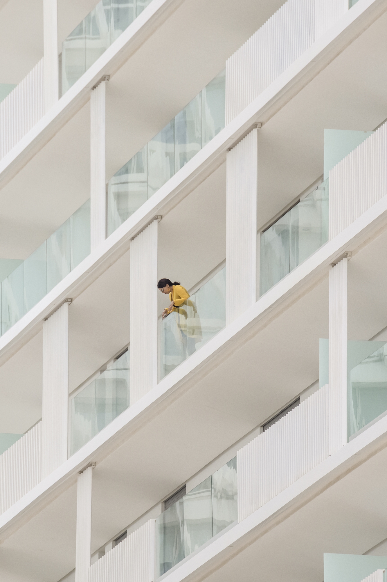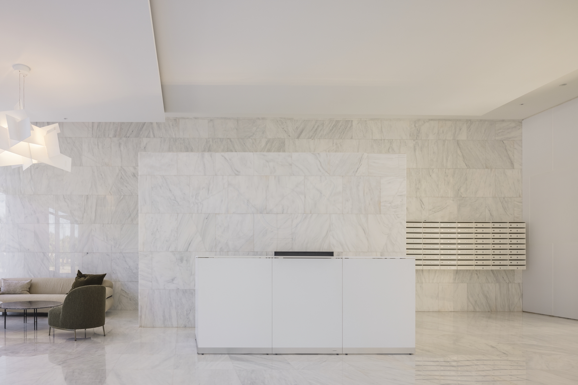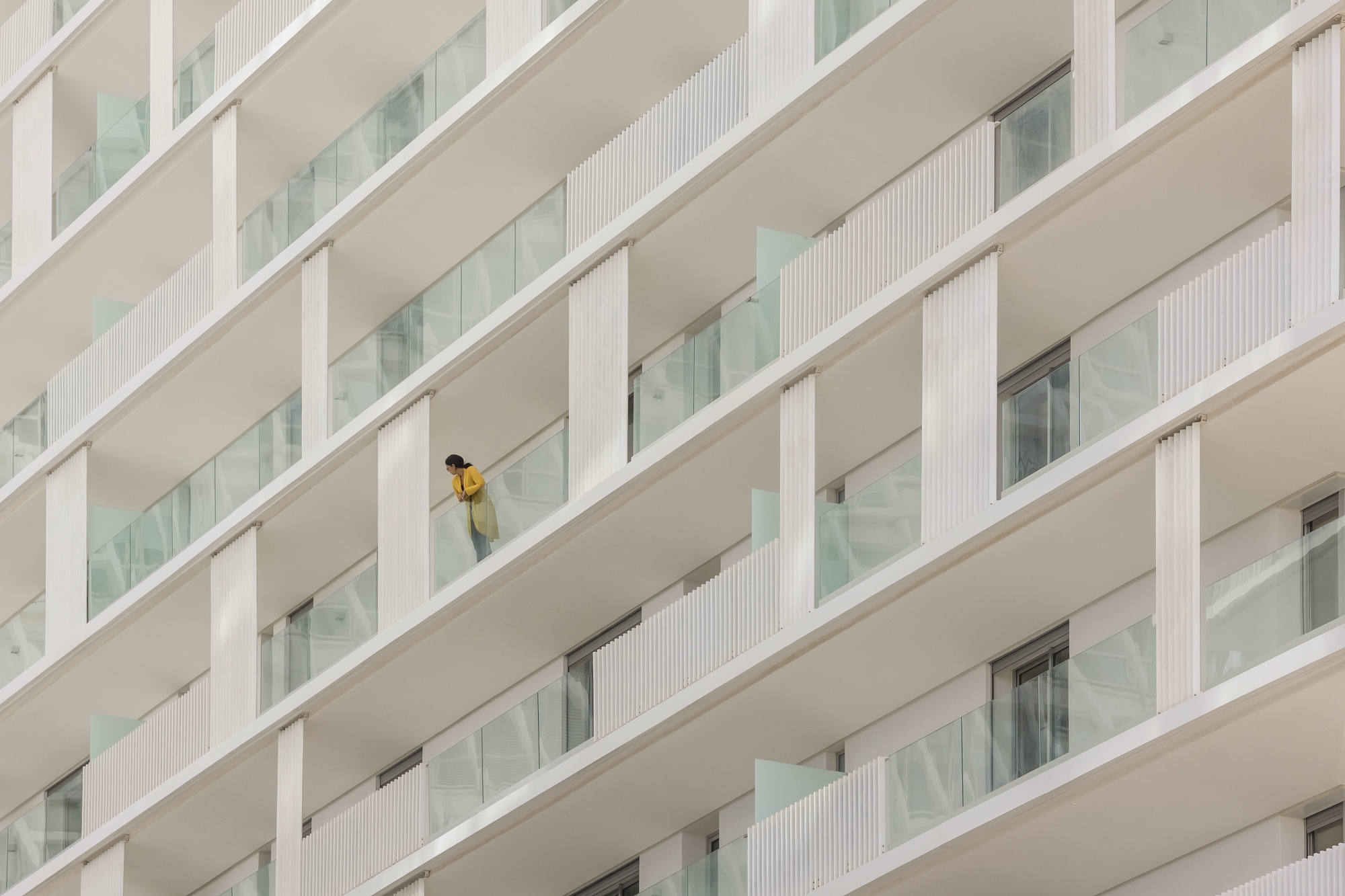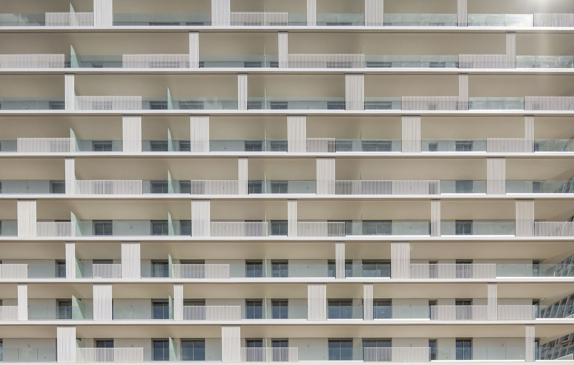 These terraces are not projected onto the void, but benefit from vertical screens, relatively concentrated at the level of the bedrooms and widely spaced at the level of the reception areas. These ≪ claustras ≫ make it possible to occasionally offer areas protected from sunshine, looks, and the wind while leaving a semi-transparency. They also make it possible to draw a protective “line” which outlines the periphery line of the various apartments and reinforces the feeling of interiority. This skin, white in color, will play with the effects of natural light to adapt to the ambient light, thus creating a vibrant facade depending on the time of day. The interplay of the balcony railings, in glass or white vertical carpentry, creates a specific pattern, a sort of modern “calligraphy” which gives the project its graphic expression.