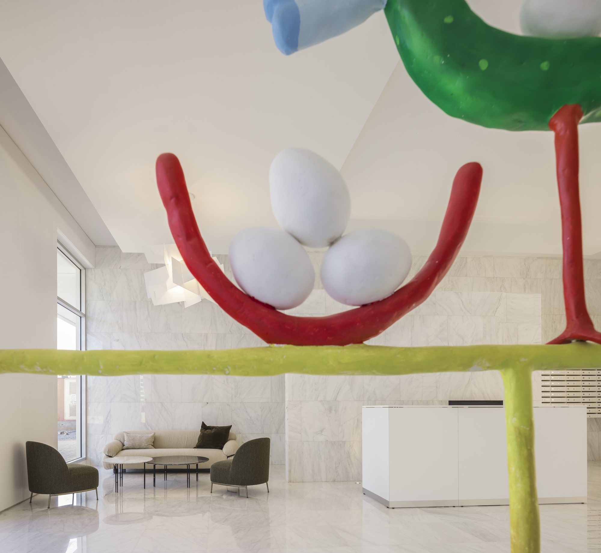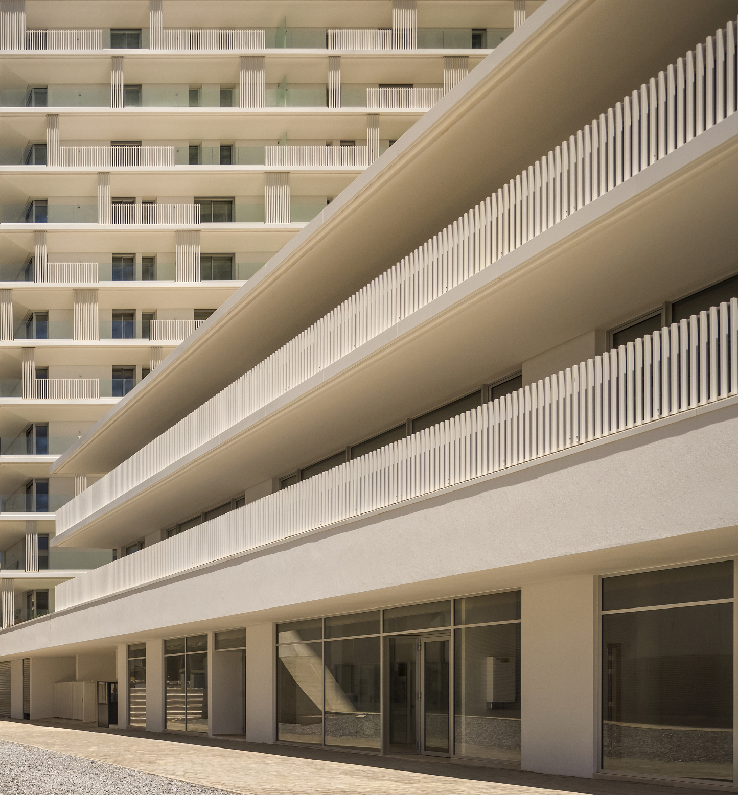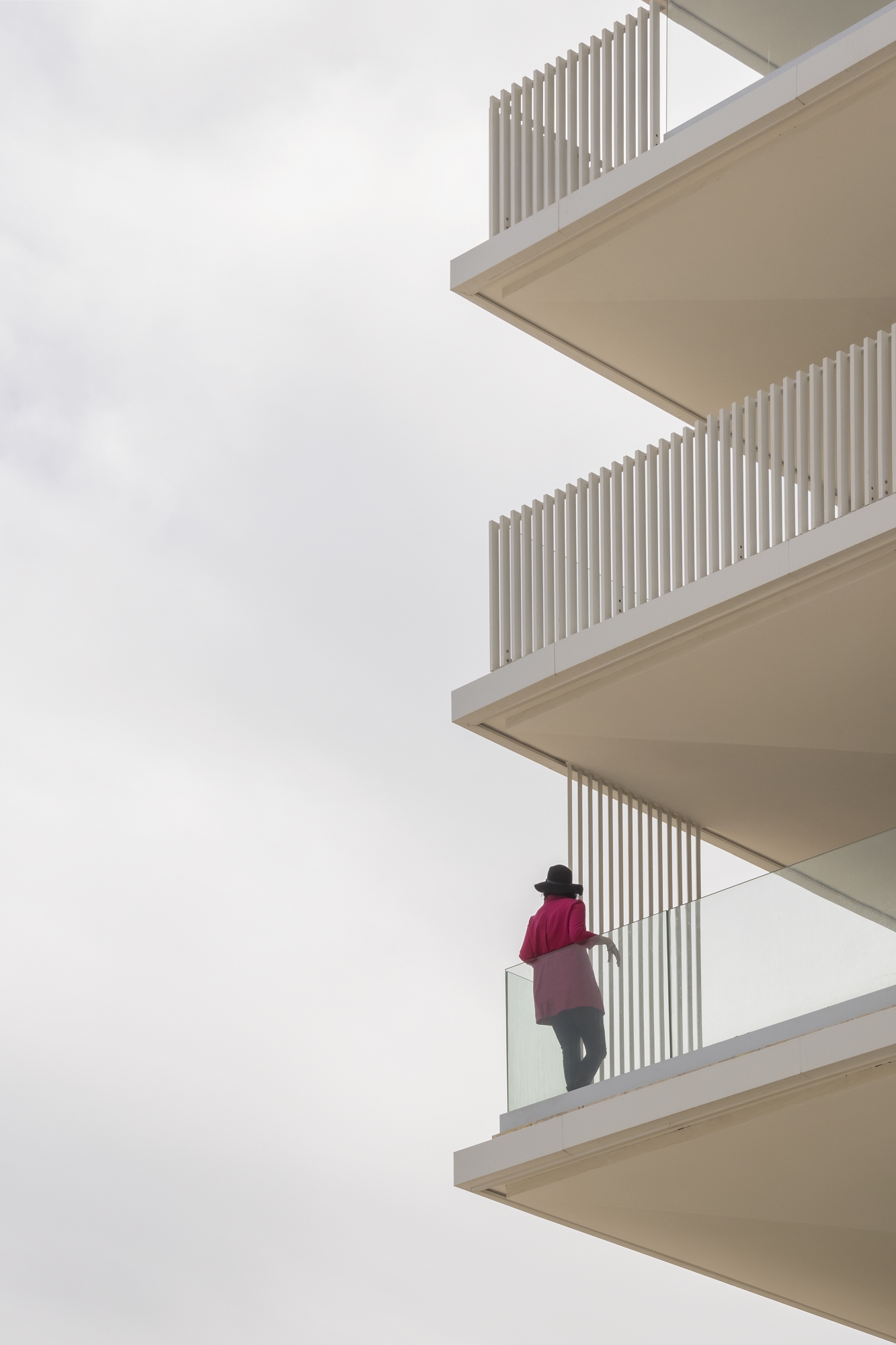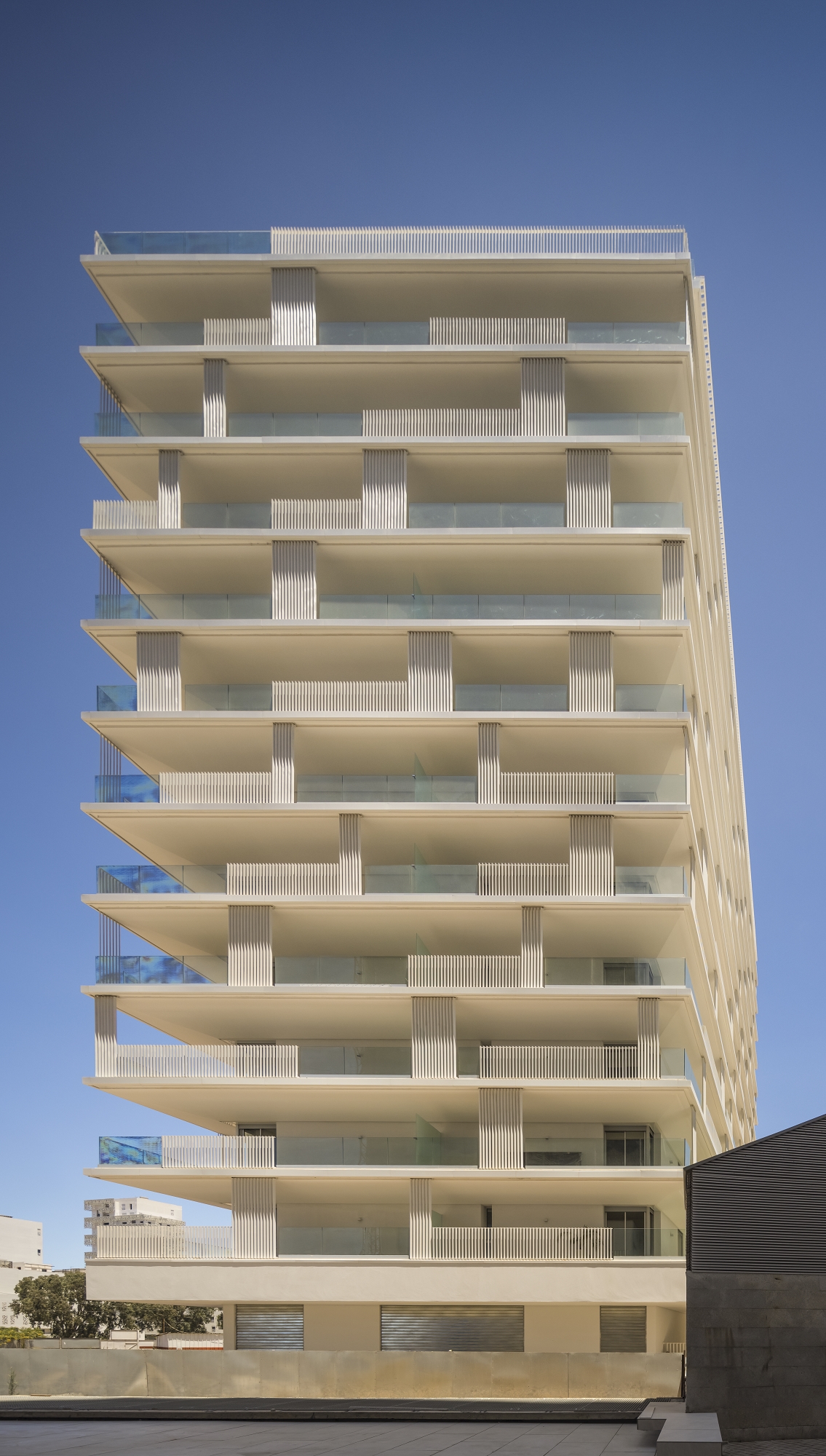 이 테라스들은 빈 공간에 투사된 것이 아니라 수직 스크린의 장점을 가지고 있으며, 침실 높이에 상대적으로 집중되어 있고 응접실 영역에서 넓게 이격된 수직 스크린의 이점을 얻는다. 이러한 '클라우스트라(Claustras)'는 반투명성을 유지하면서 때때로 햇빛, 외관, 바람으로부터 보호되는 영역을 제공한다. 또한, 다양한 아파트의 주변선을 그리고 인테리어의 느낌을 강화하는 보호 ‘선’을 그릴 수 있도록 한다. 흰색dml 외관은 자연광의 효과로 주변 빛에 반응하여, 하루 중 시간에 따라 생동감 있는 파사드를 만들어낼 것이다. 발코니의 유리와 난간 그리고 흰색의 수직 목공 작업은 서로 상호작용하여 프로젝트에 그래픽 표현을 제공하는 현대적 '캘리그래피'의 일종으로 특정한 패턴을 만든다.