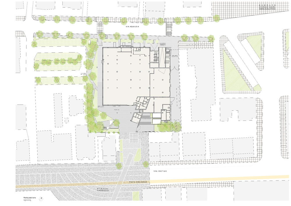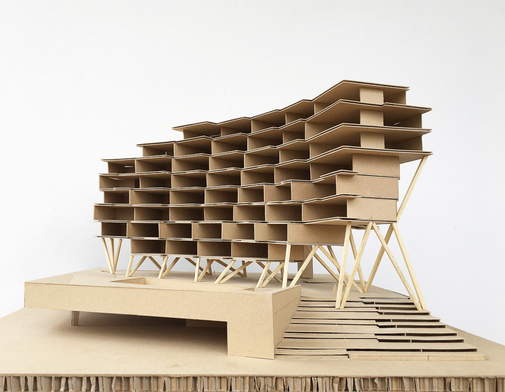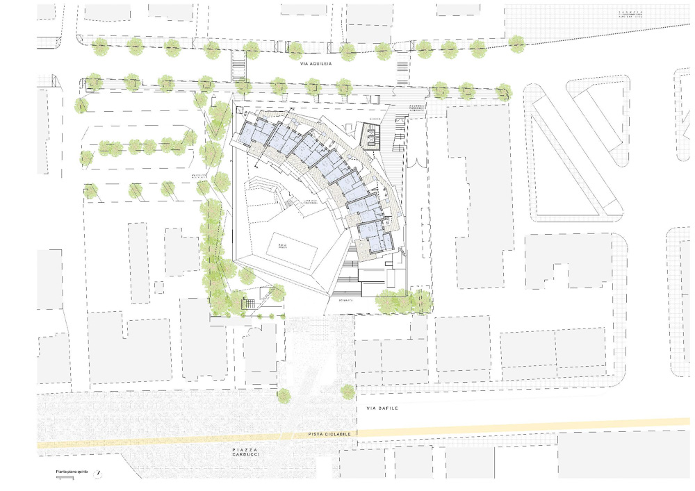 Le batiment descendant l’escalier is a project that, starting from the peculiarities of the place and the client’s request, develops without apparently questioning either one or the other. However, the project tries to exploit the position and the building typology to imagine an architecture in which the use of shared spaces becomes its best quality. The project involves the urban space to activate those links between public and private use of the space. The separation between the residential part of the building and commercial one produces an elevated floor for collective condominium use, a new partially covered artificial territory, equipped with a solarium, relax area and swimming pool. This physical detachment between the two functions allows the articulation of those expressive structural elements that characterize the building. The irregular metal stilts connect the cartesian structural system of the ground and basement floors with the radial pattern of the load bearing walls suspending the appartments. The living spaces are arranged like a vineyard and they step back to provide the the best exposure to the sun and the better views. The distribution system is designed to be the continuation of that common floor. The distribution galleries expand and narrow, becoming rest areas to promote neighborhood sociability. This distribution system is a device which allows the active use of a functional space inviting to look north towards the Venetian Lagoon and the Dolomites.