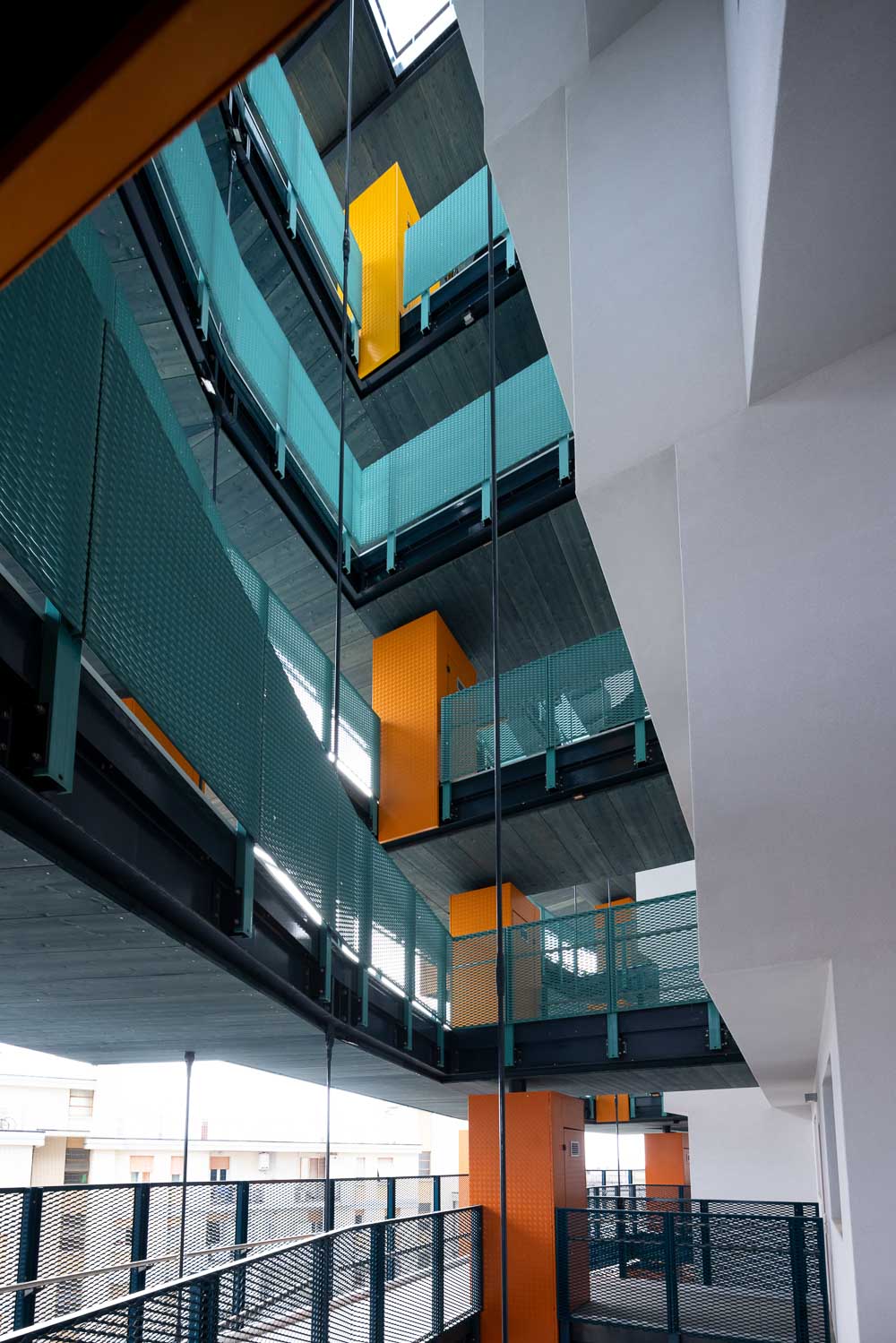 르 바르다 데스사다 르에스카이제(Le batiment descendant l’escalier)라고 불리는 이 계단식 건축물의 정체는 공유 공간이 최대의 효과를 누리도록 설계된 공동 주거 건축물이다. 공적 공간과 사적 공간 사이의 연결을 활성화 하기 위해 도시 공간을 포함한다. 건물은 주거용 부분과 상업용 부분으로 분리되는 주상복합형이다. 두 가지 기능적 측면으로 보면, 물리적인 분리는 구조적 요소들의 표출과 건물의 특징으로 표현된다. 불규칙하게 놓여있는 금속 기둥은 1층과 지하실의 계단식 구조 시스템과 아파트의 방사형 패턴의 내력벽을 연결해준다. 생활 공간은 포토밭을 연상시키며 줄지어 있고, 한 발치 뒤로 들어간 듯한 구조는 높은 채광과 더 나은 경관을 선사한다. 이 건물의 회랑 구조는 공용 공간의 연장으로서 설계되었다. 넓거나 혹은 좁게 이뤄진 회랑은 이웃과의 교류를 가능하게 해주는 휴식 공가닝 된다. 또한, 회랑 구조는 기능적 공간을 보다 능동적으로 사용할 수 있게 해주는 장치로써 베니스 라군(Venetian Lagoon)과 돌로미티(Dolomites)의 모습을 바라볼 수 있도록 북쪽을 향해 있다. 포디움 위에 마련된 공간은 일광욕과 휴식이 가능한 공간과 수영장을 갖추고 있다.