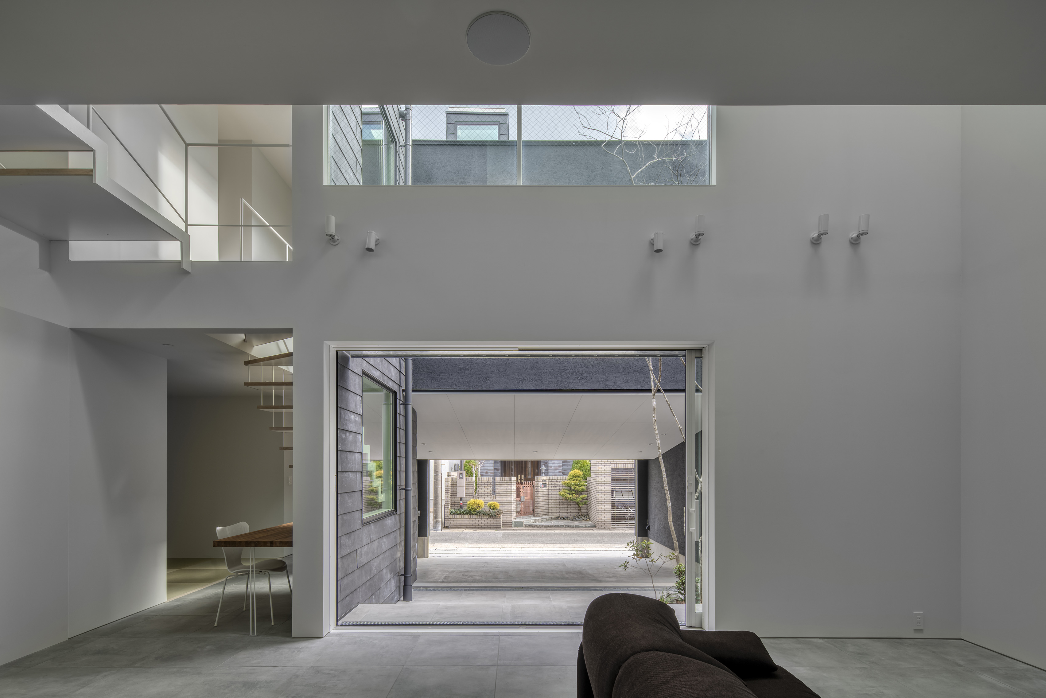 The volumes follow the gently sloping topography with altering ceiling heights and emphasize the expansive horizontal depth at both levels. Uninterrupted views within the house are maximized in distance as this helps the feel of being in an ‘internal landscape’. A rooflight and an automated side-window form a ‘chimney’ that is positioned at the top of each ‘box’, which bring ever-changing natural light and flowing air into the dwelling. Shadows that respond to the seasons and climate inter-play with the sense of depth within the continuous internal environment. An external approach to the living emerges when the shutter to the garage is open, creating a buffer between the city and the private space.