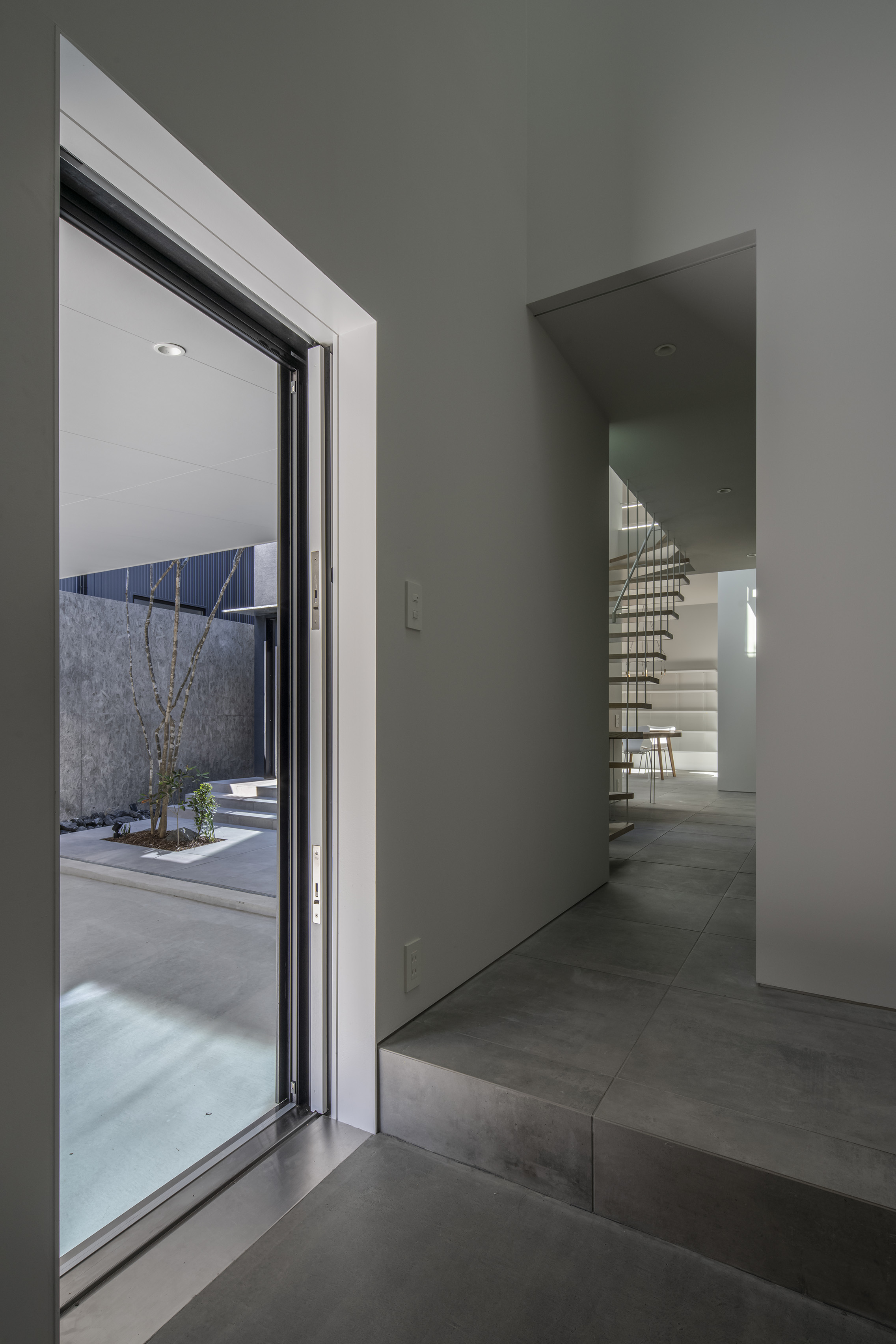 The volumes follow the gently sloping topography with altering ceiling heights and emphasize the expansive horizontal depth at both levels. Uninterrupted views within the house are maximized in distance as this helps the feel of being in an ‘internal landscape’. A rooflight and an automated side-window form a ‘chimney’ that is positioned at the top of each ‘box’, which bring ever-changing natural light and flowing air into the dwelling. Shadows that respond to the seasons and climate inter-play with the sense of depth within the continuous internal environment. An external approach to the living emerges when the shutter to the garage is open, creating a buffer between the city and the private space.