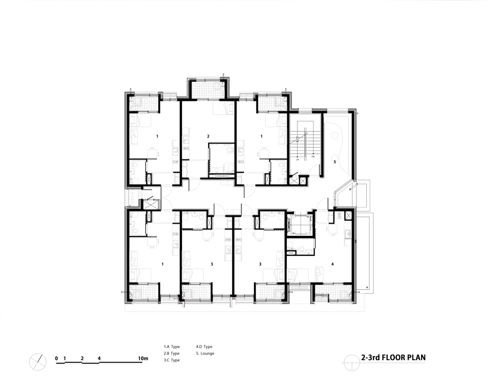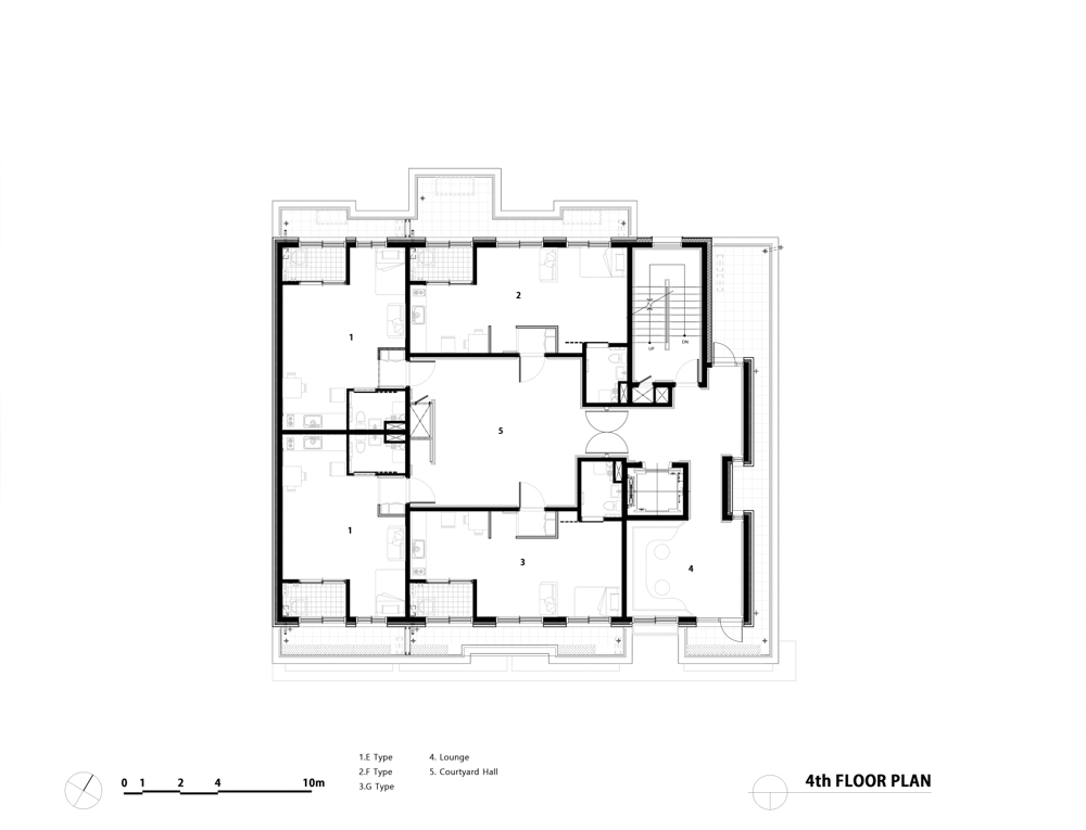 Haesimdang is an LH rental housing pilot model that responds to an aging society and aims to give a positive image of public rental housing to the region by contributing to the publicity and realizing social values in the city center. Haesimdang, which means “a house where we can live comfortably,” combines residential convenience facilities and services such as health and care so that we can live in harmony with the local community. This public housing is designed to accommodate the elderly as well as those with reduced mobility. The first floor is a space for the disabled, the second floor is a space for the elderly women, the third floor is a male elderly person, and the fourth floor is an elderly couple type to compose the space to suit the characteristics of the generation. A local community space was installed on the first floor adjacent to the roadside to provide a place of rest for local residents with inexpensive cafes and drinks. It is designed to allow rest, exchange and leisure activities to take place through the common living room, a community facility on each floor, and to find work in the rooftop eco- garden.