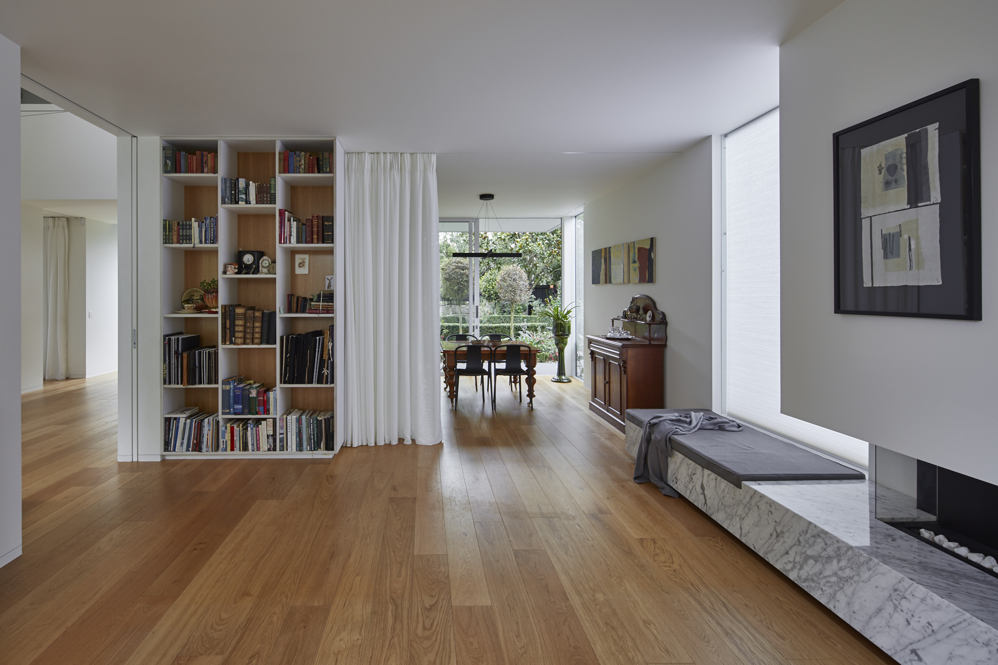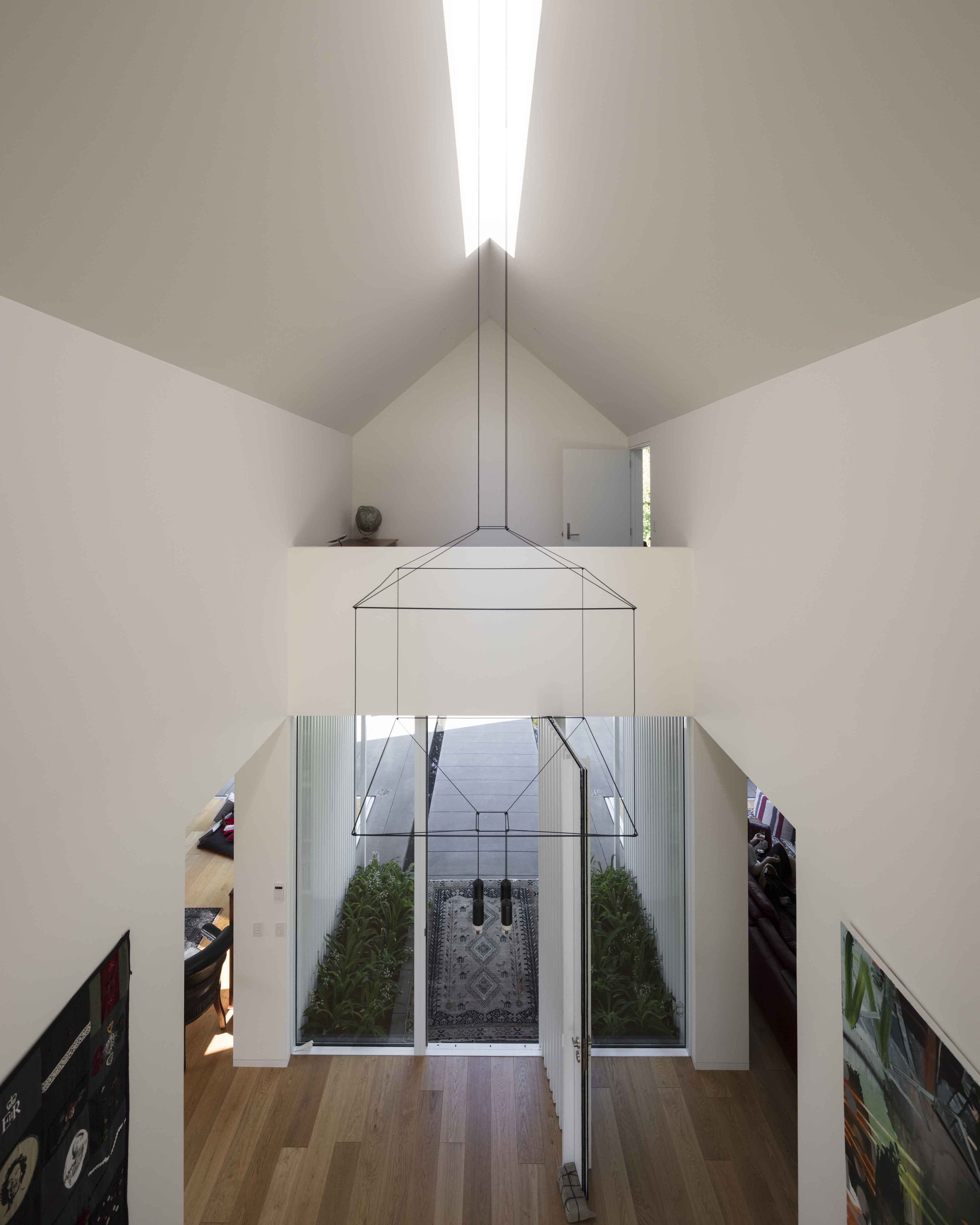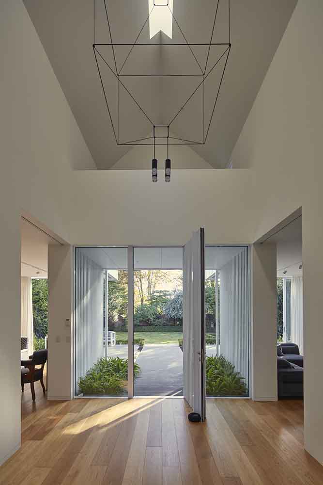 입구 복도는 집의 주요 통로 역할을 하며 8미터되는 천장을 확장하여 손님을 접대할 수 있는 공간이 되기도 한다. 이 집은 클라이언트의 미술 작품들과 기존 집의 앤티크 가구를 위한 갤러리 역할도 함께 하고 있다. 1층 공간은 테라스를 통해 연결되고 대형 포켓 슬라이딩 도어, 커튼, 개폐식 창을 이용해서 더 작고 친밀한 공간으로 사용할 수 있다.