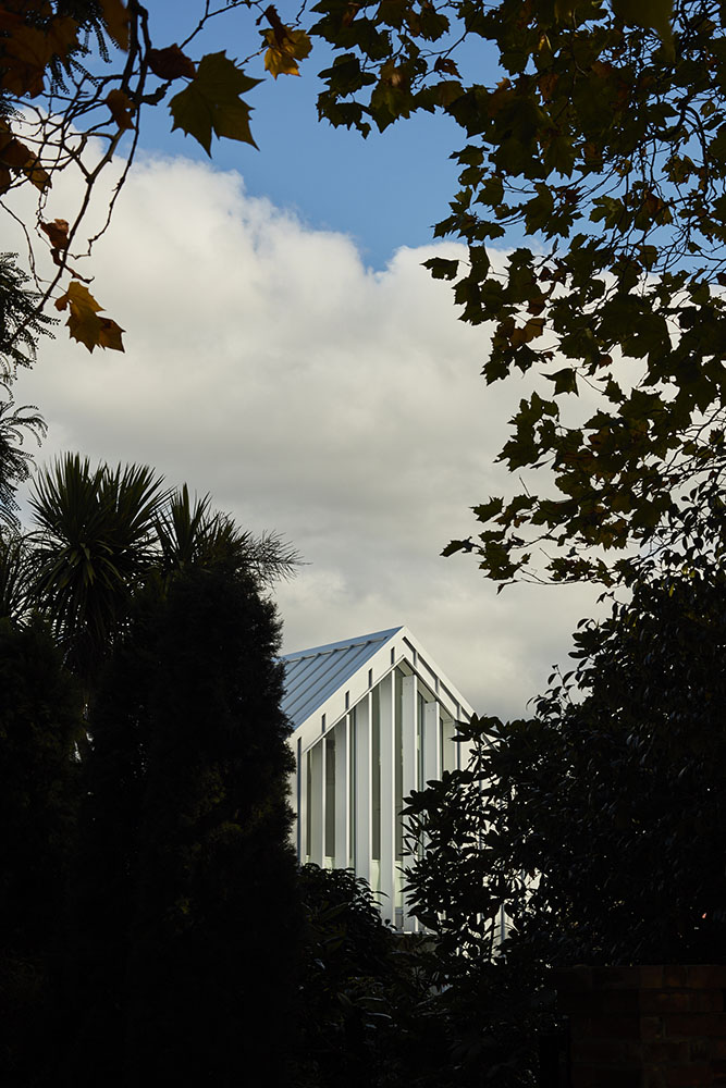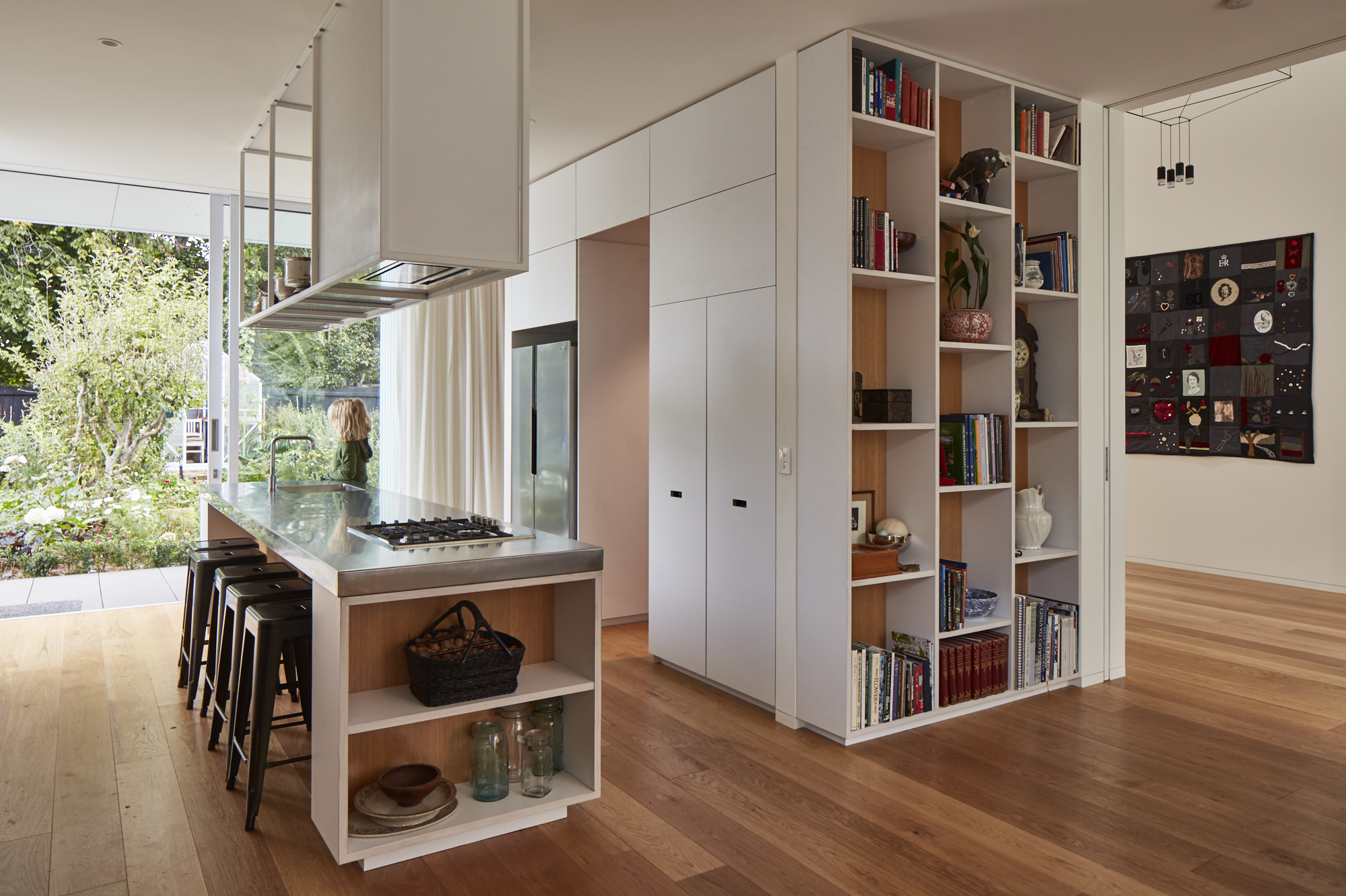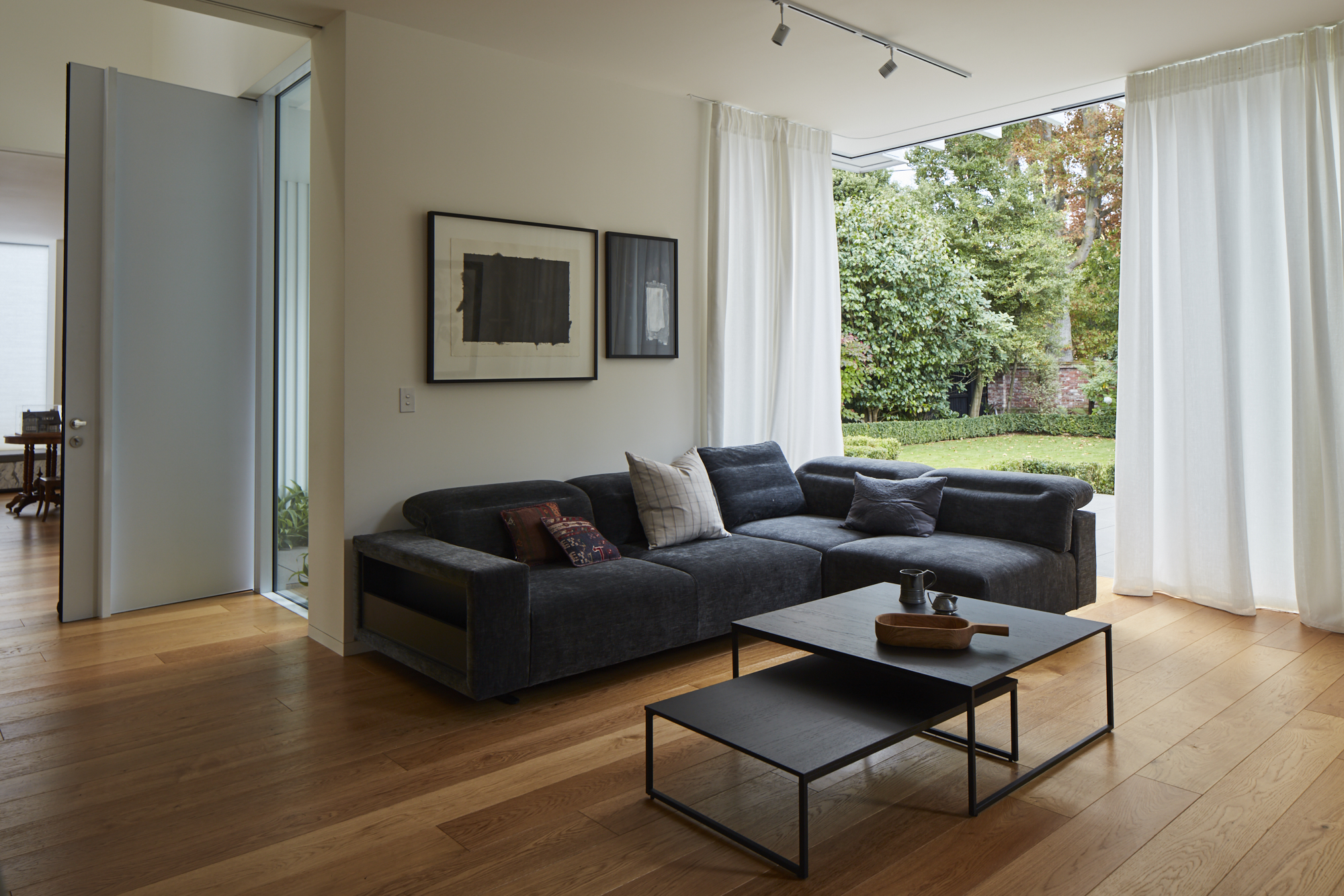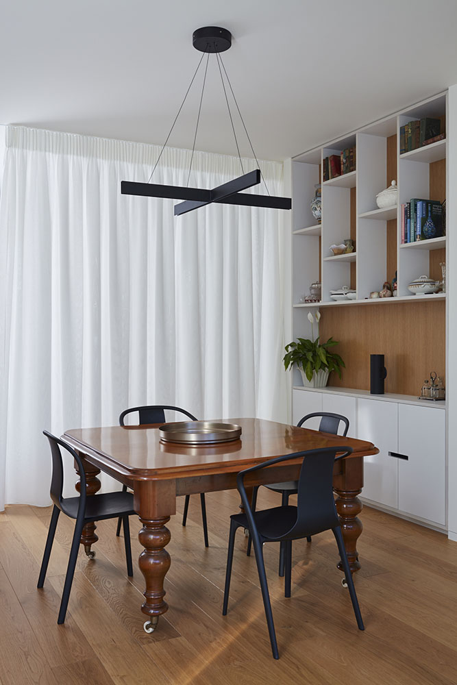 입구 복도는 집의 주요 통로 역할을 하며 8미터되는 천장을 확장하여 손님을 접대할 수 있는 공간이 되기도 한다. 이 집은 클라이언트의 미술 작품들과 기존 집의 앤티크 가구를 위한 갤러리 역할도 함께 하고 있다. 1층 공간은 테라스를 통해 연결되고 대형 포켓 슬라이딩 도어, 커튼, 개폐식 창을 이용해서 더 작고 친밀한 공간으로 사용할 수 있다.